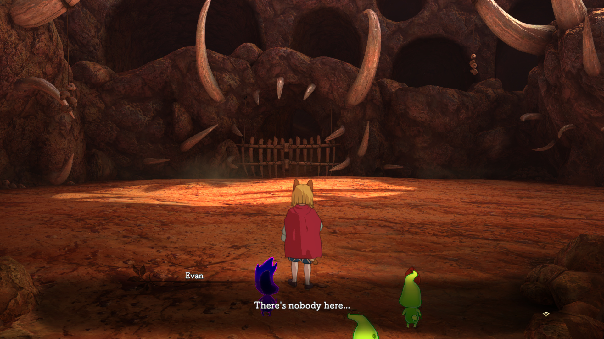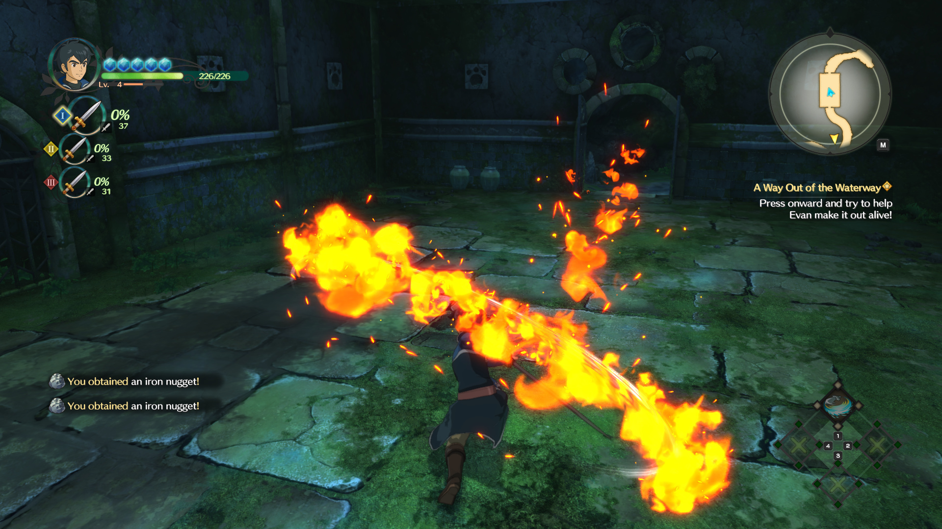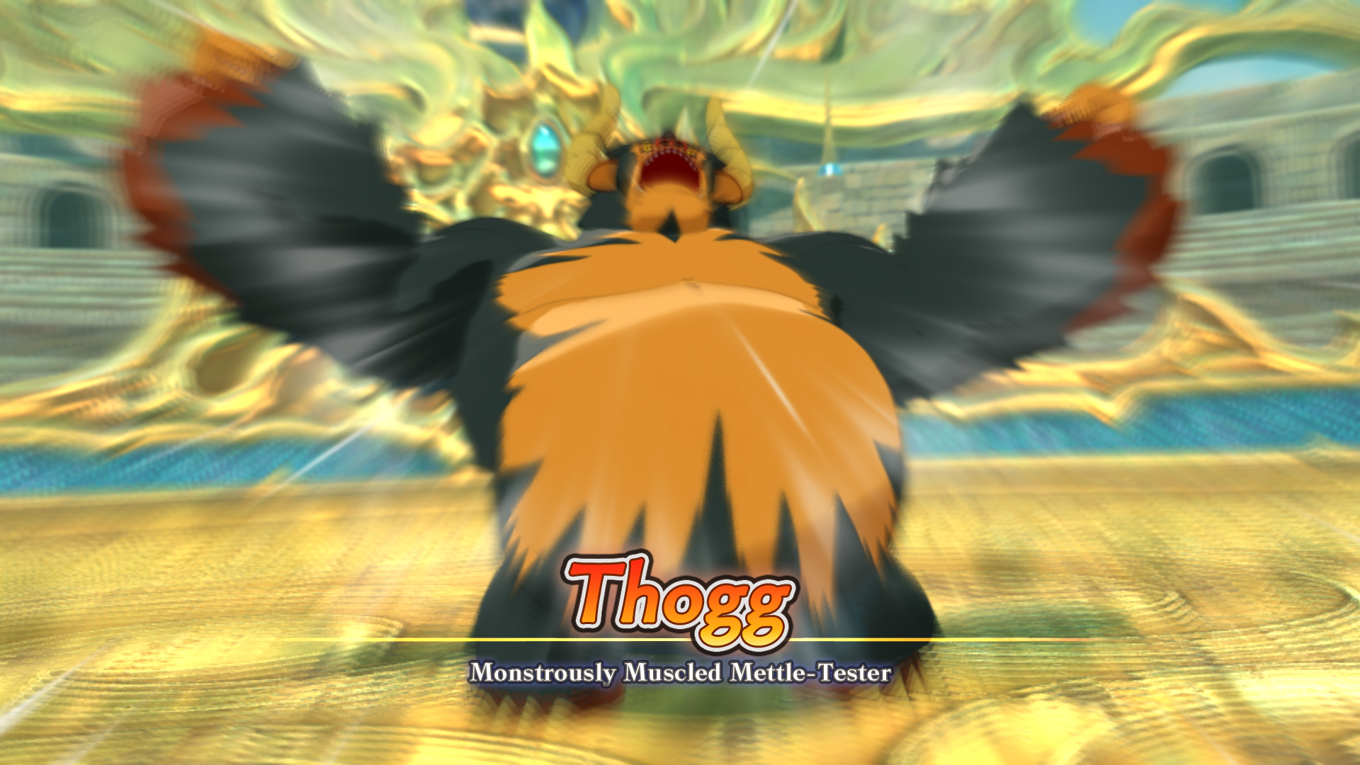 On normal mode, this is a fairly easy fight - the boss mostly attacks by running around in circles swinging his axes. The obvious strategy is to get behind him and spam light attacks.. though he is capable of turning pretty quickly and can hit some of the area behind him. This, by the way, is the special for most of the wind-elemental higgledies. In case you’re curious, the reason Evan’s HP is so low is because I took uh.. maybe two attacks from the boss?