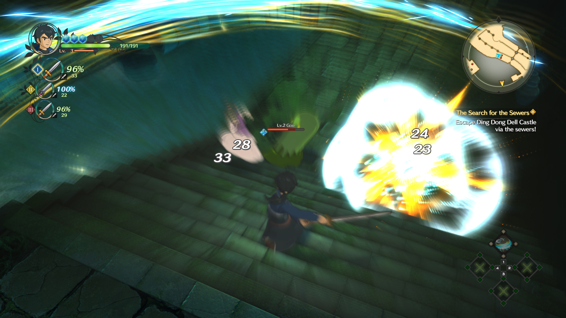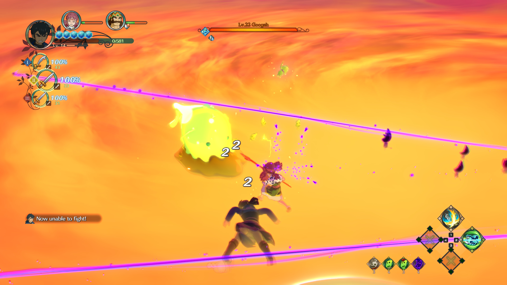 Once the boss came back down, I happened to get the dark-element higgledy’s attack to go off. This just straight-up creates a black hole that hits for a large amount of damage. I believe this one hit for 190, when most of Evan’s attacks are still in the mid double digits.
