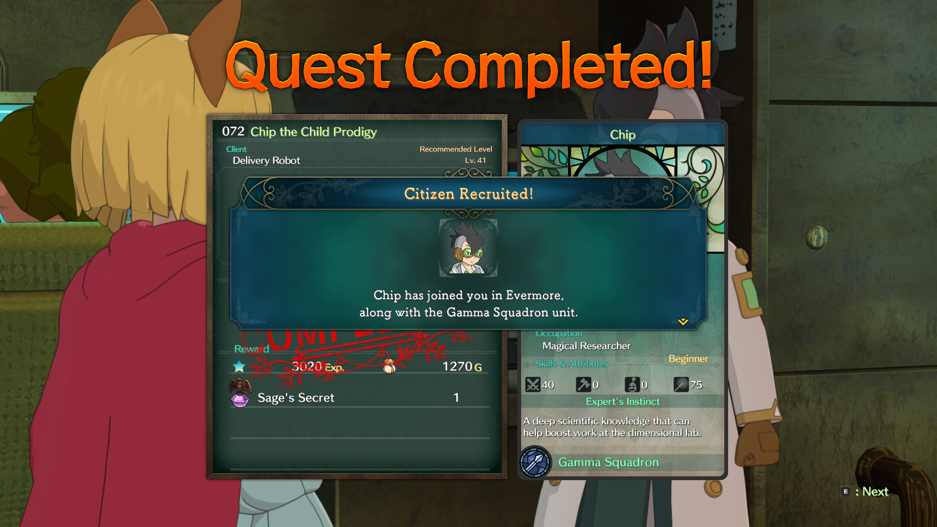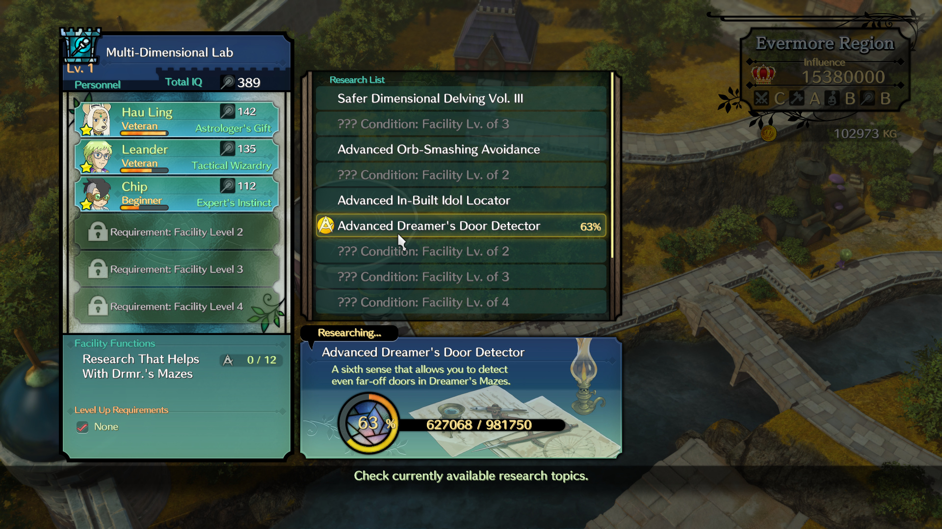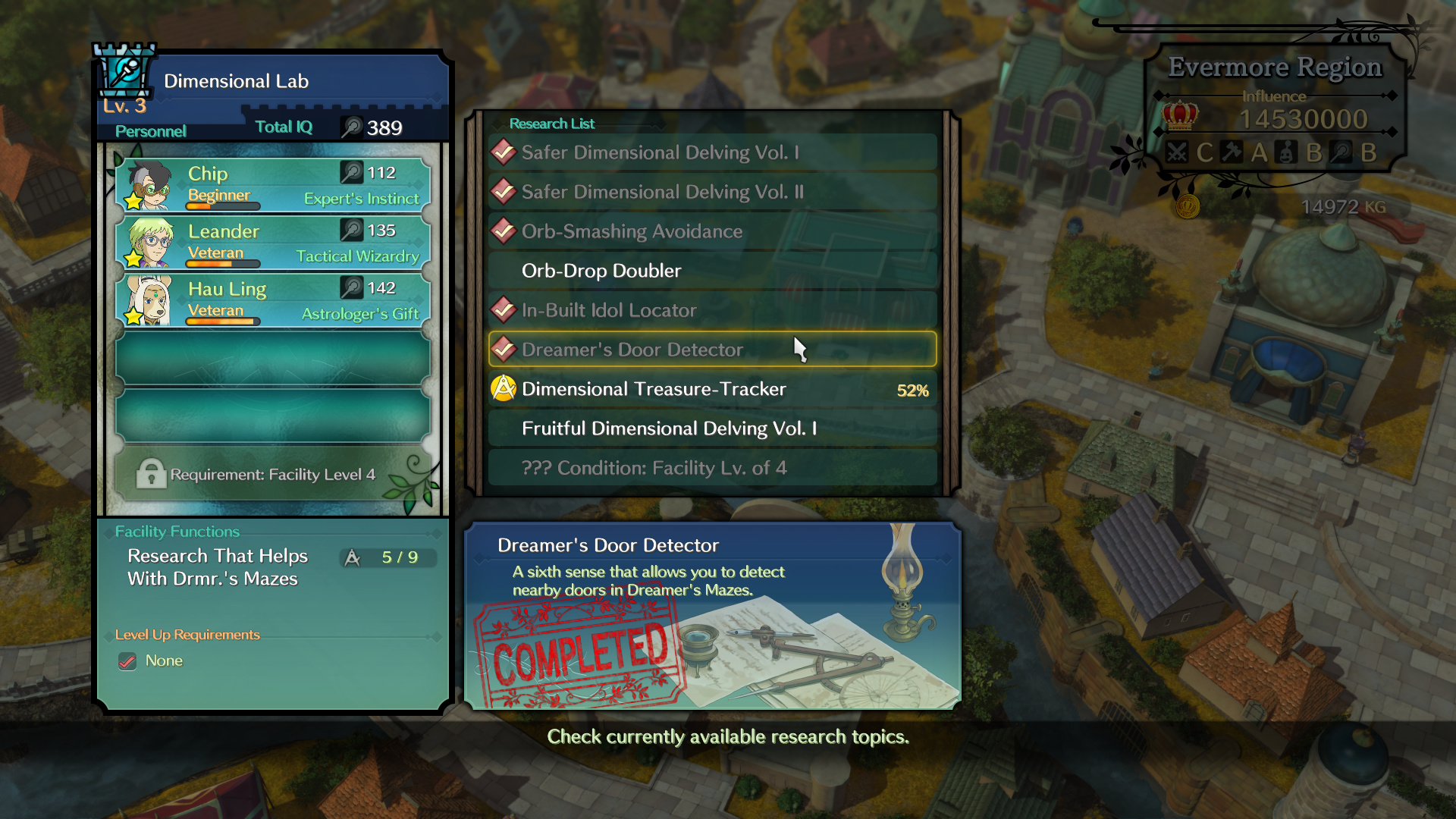 Before you start this quest, you’re going to want to build the Dimensional Lab (there’s an upgraded version you can get at KL3 but it’s largely meant for NNK2’s equivalent of the Pit of 100 Trials/Chrysler Building/Mementos) and get a couple of research items done.