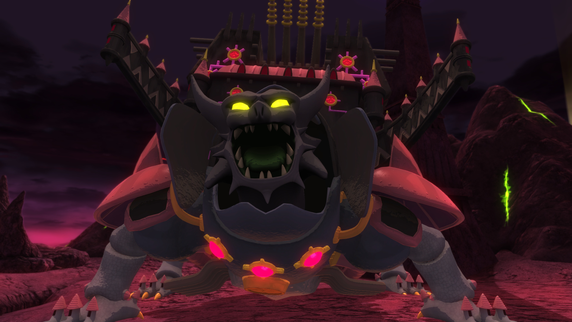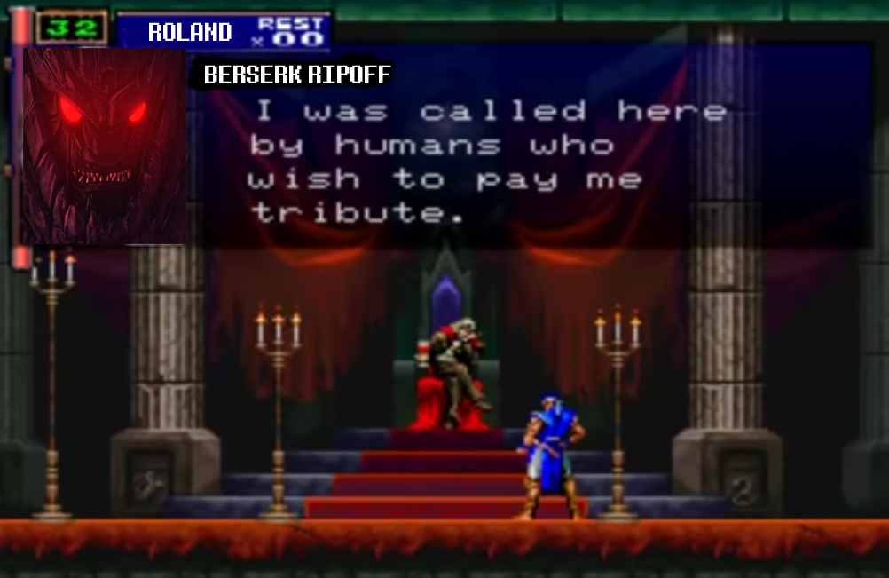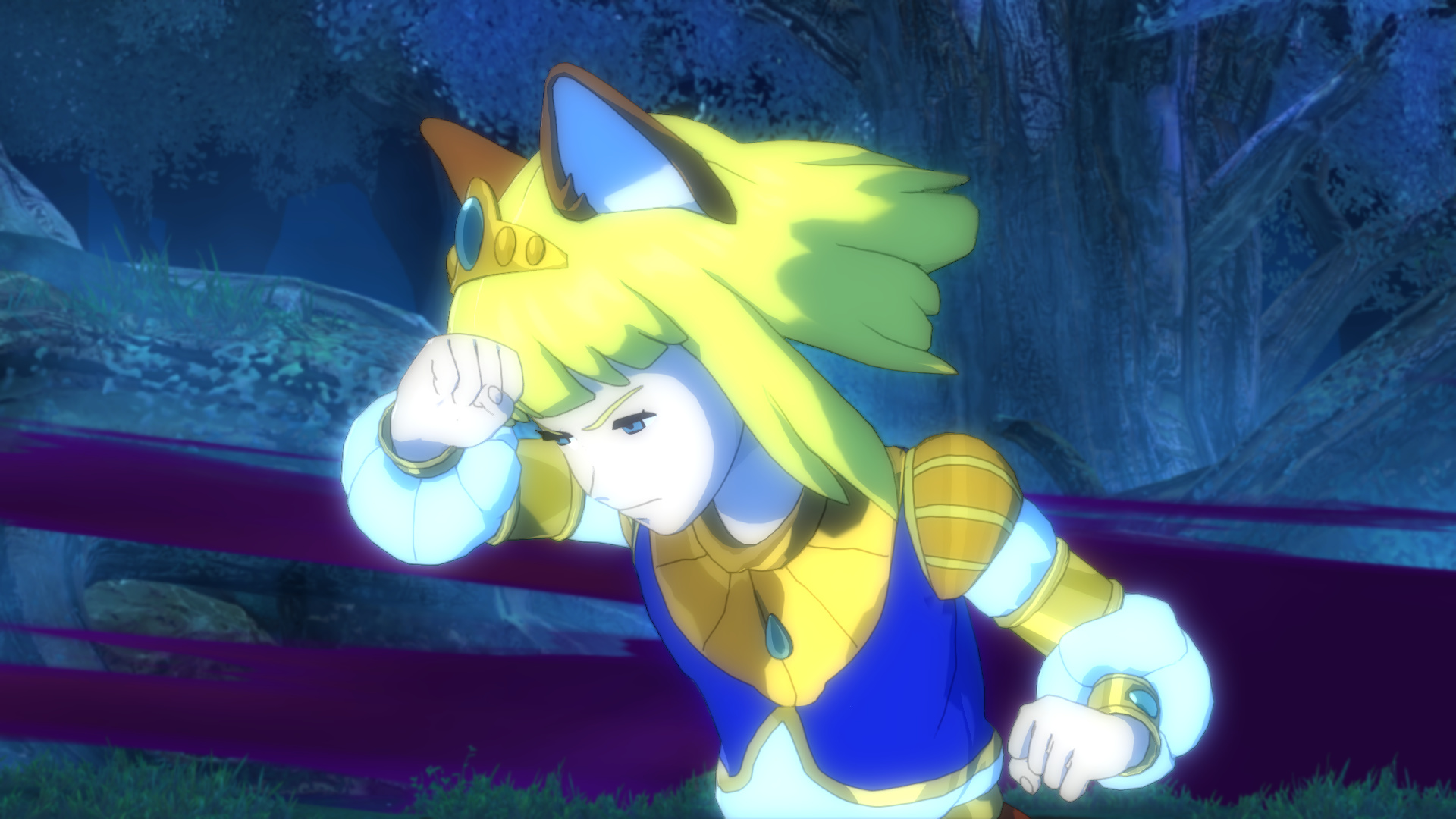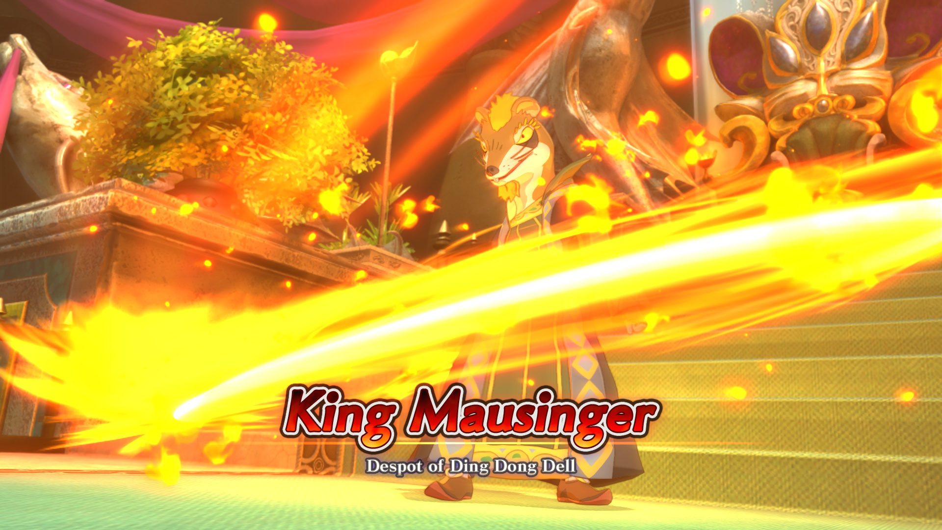 His most damaging attack requires a long charge before he does a forward dash attack that carries him clear to the other side of the room. This is by no means a threat because it’s dead easy to dodge.