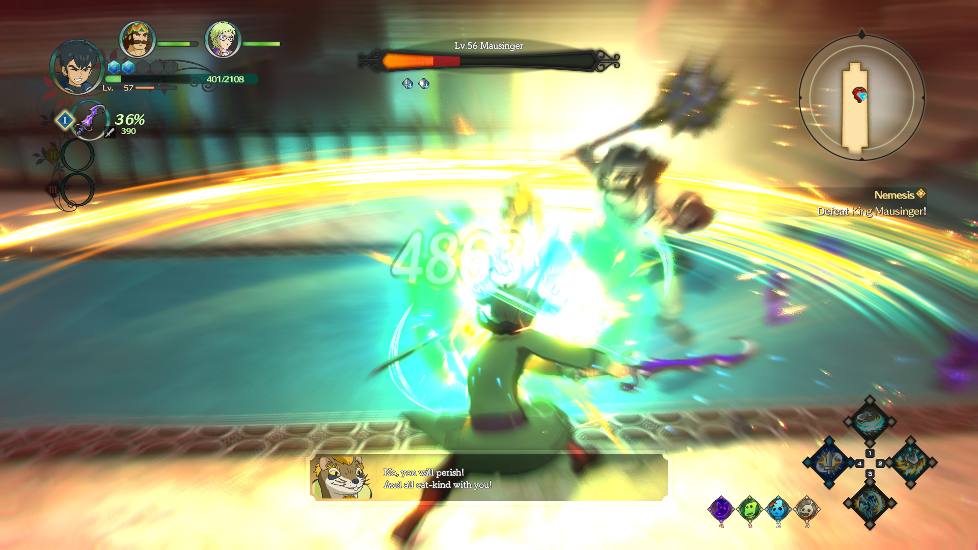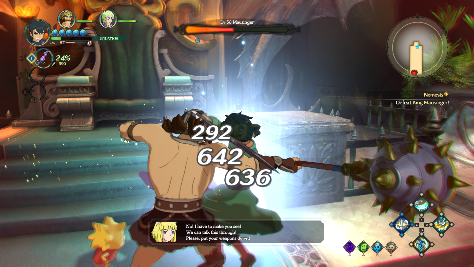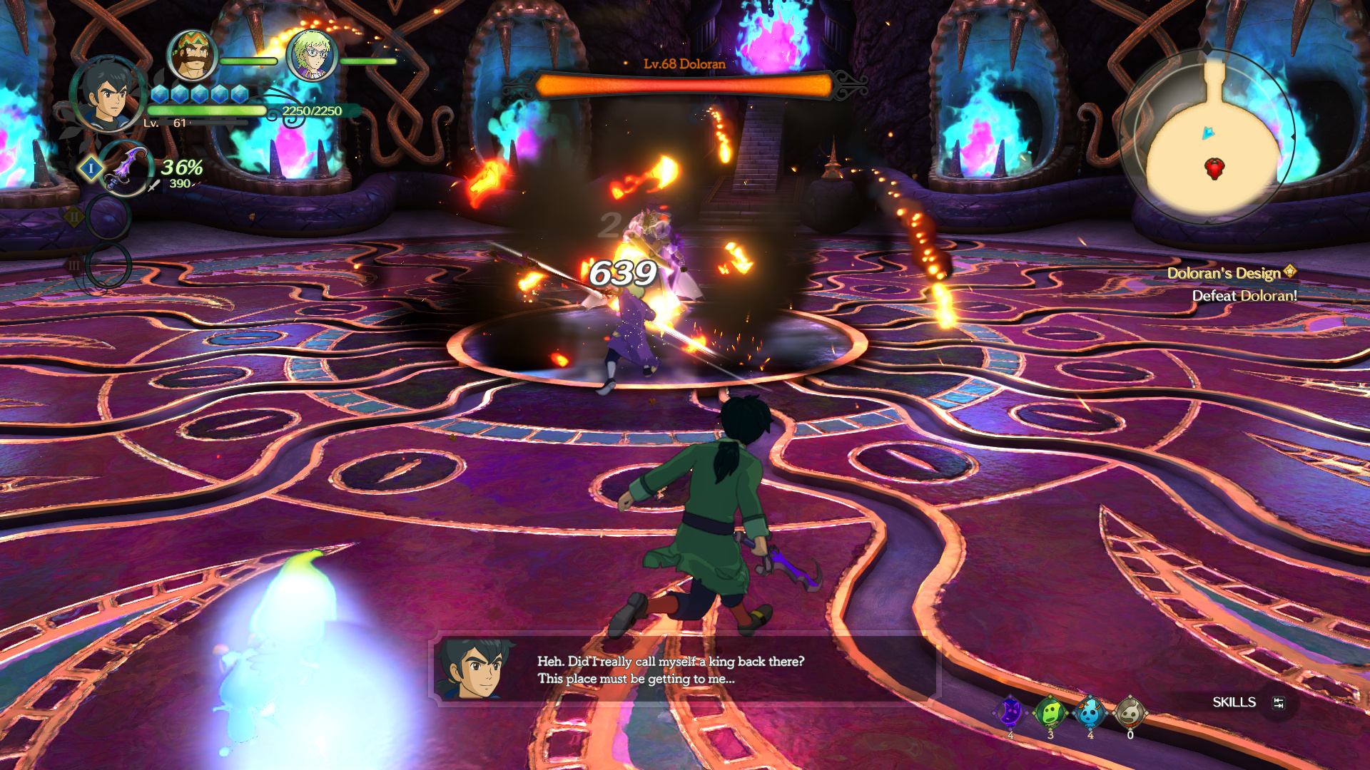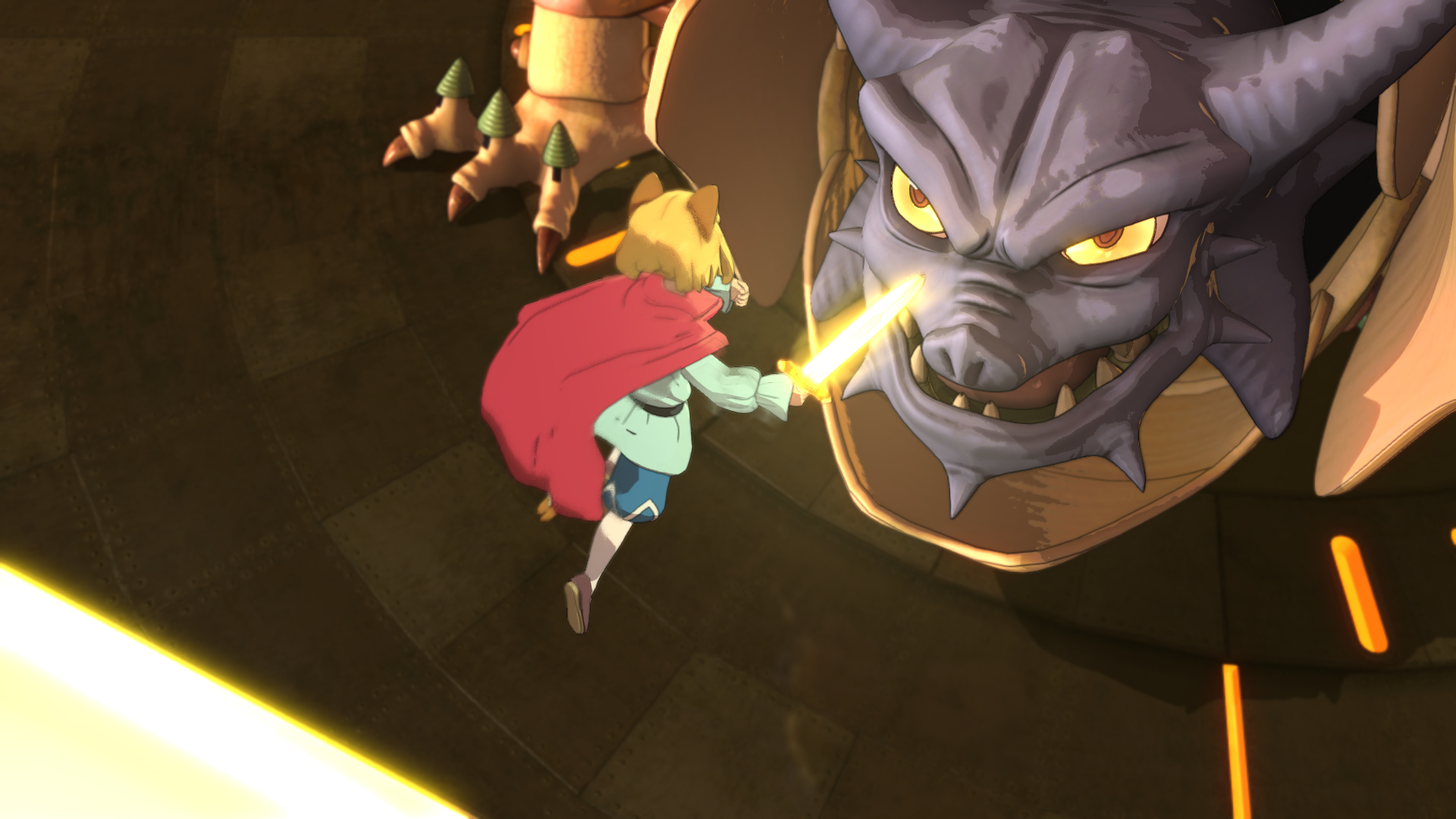 His most damaging attack requires a long charge before he does a forward dash attack that carries him clear to the other side of the room. This is by no means a threat because it’s dead easy to dodge.