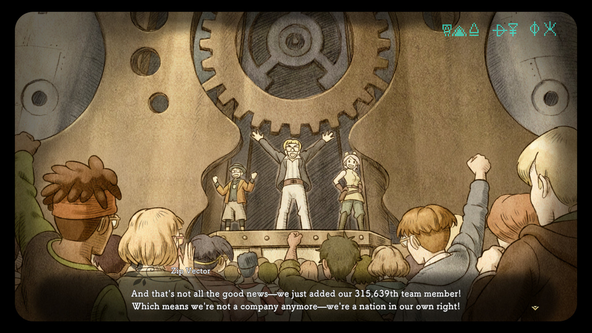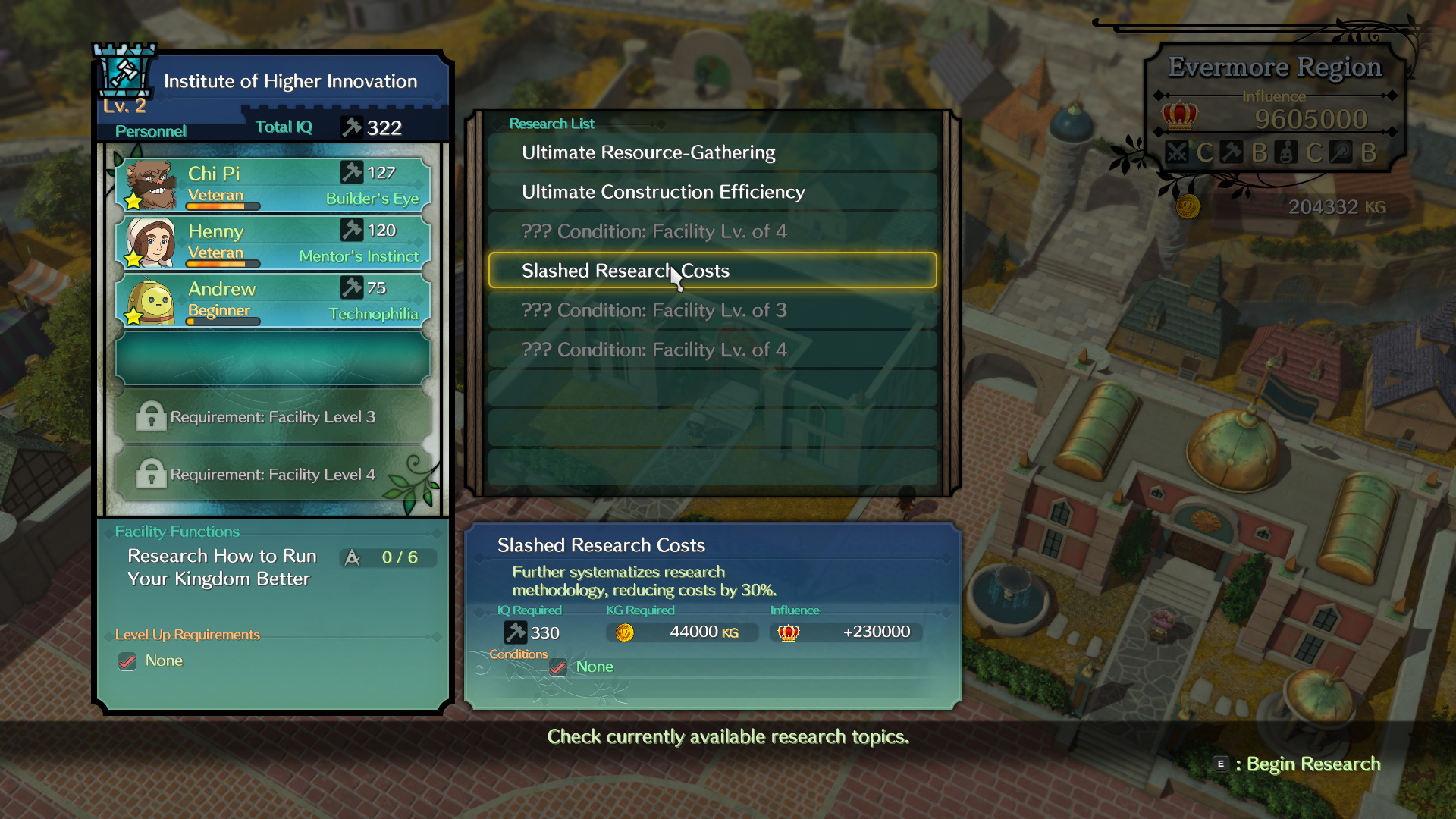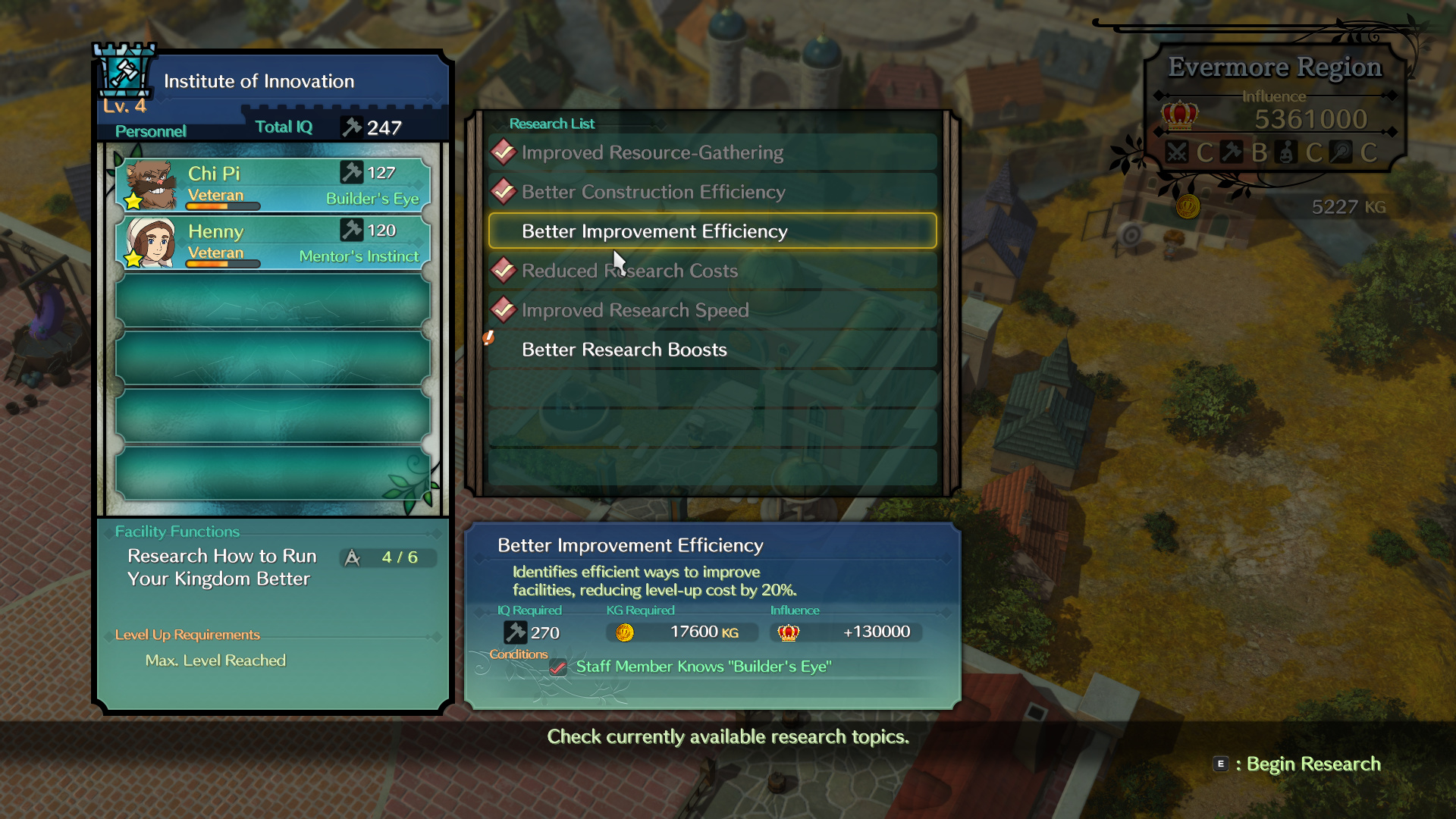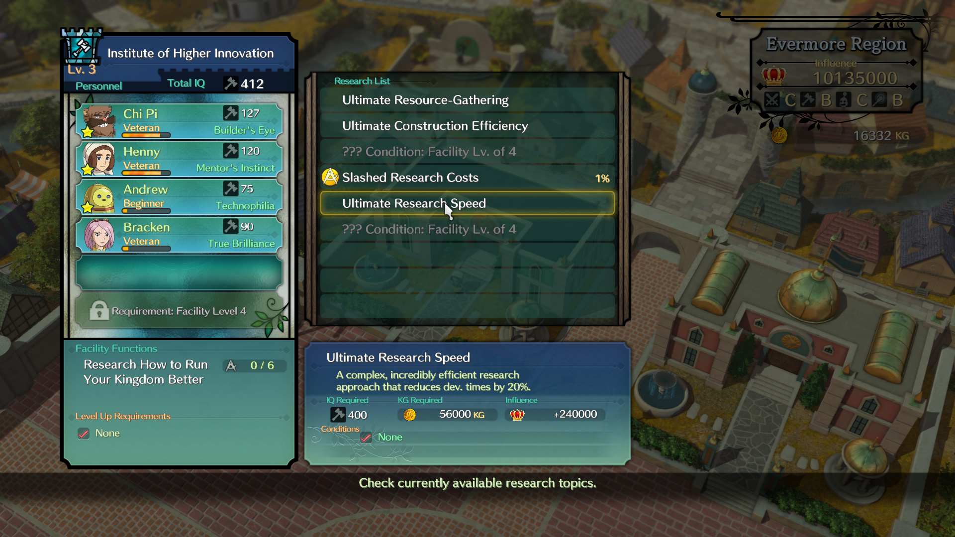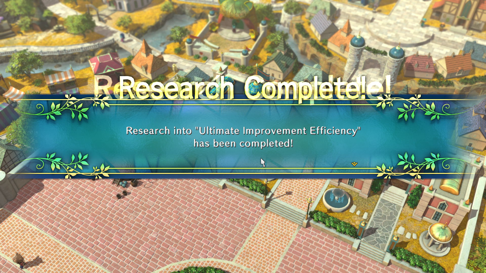 By the way, one thing I forgot to add because I didn’t really understand it myself: the way research in this game works is that each research costs a certain number of points, minus the discount from any upgrades. Every second, the game subtracts the total IQ of all of the citizens in the building from that total, meaning that upgrading buildings will make research go faster as it lets you cram more citizens in. The game never tells you this at any point.