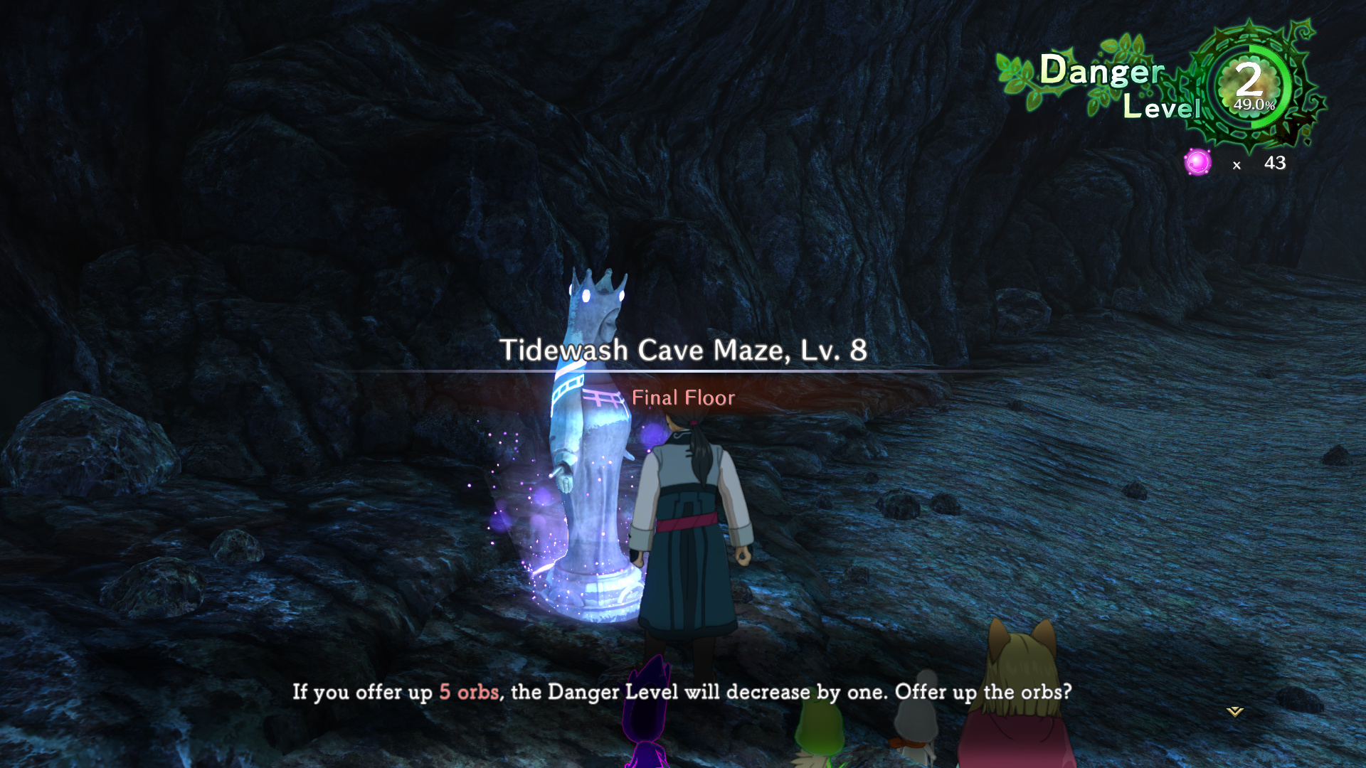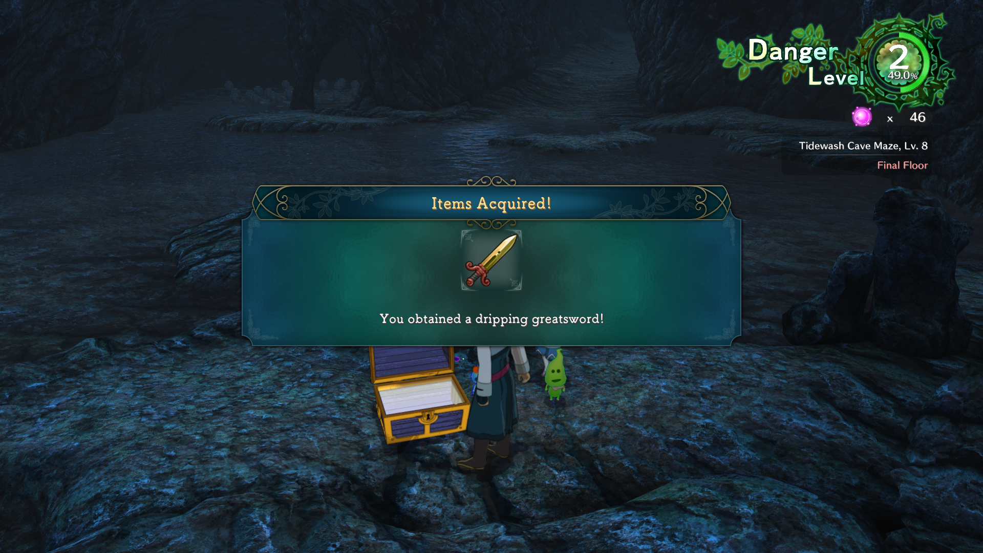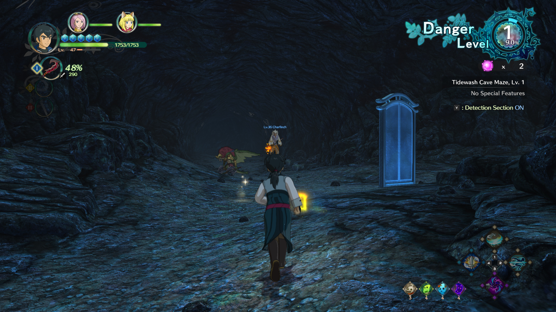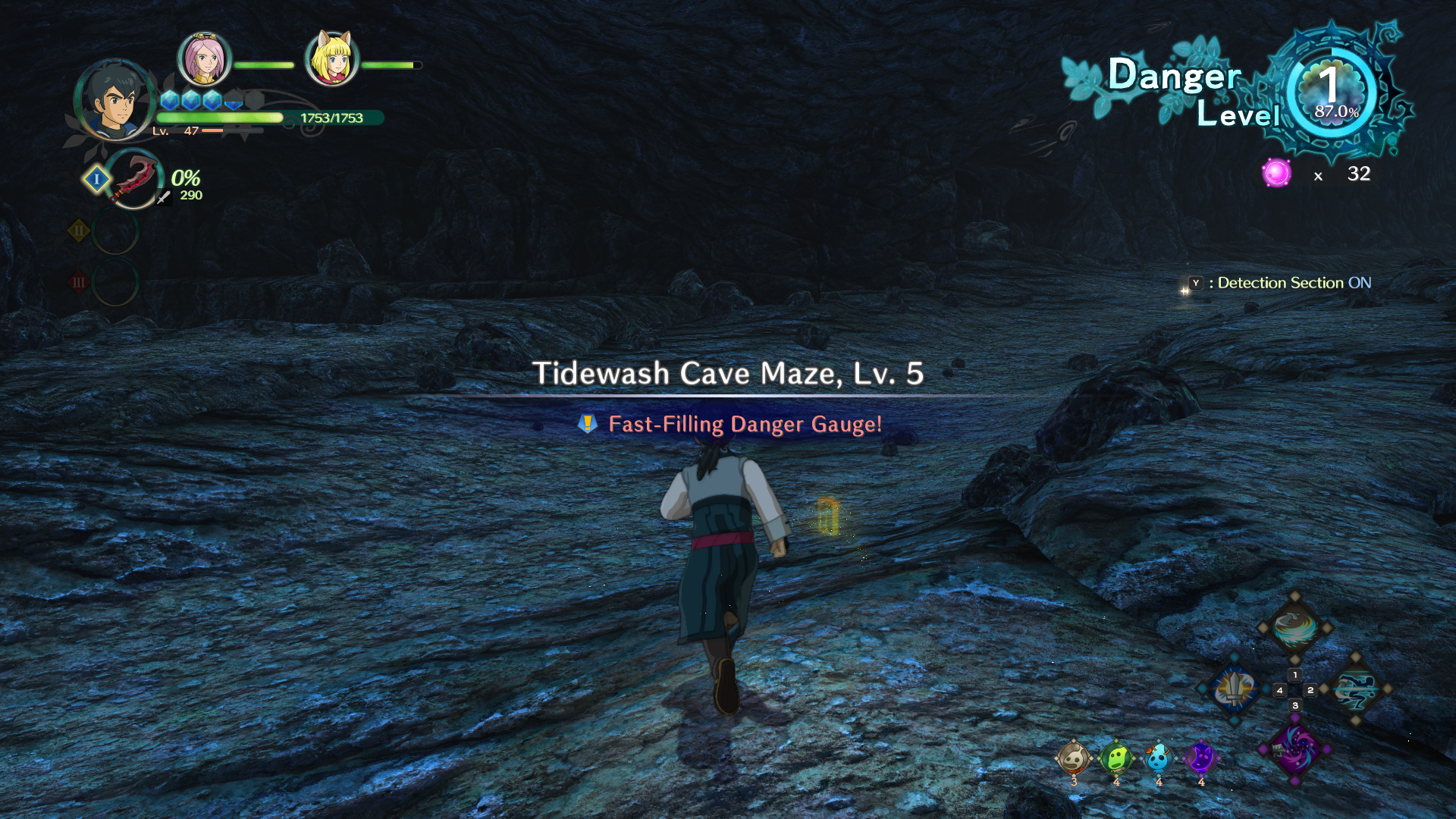 The faster gauge is enough to boost us into danger level 2, which raises the level of the enemies enough that they’re now in aggro range for us. This makes things significantly more annoying. Thankfully, Tidewash Cave only has seven real floors.