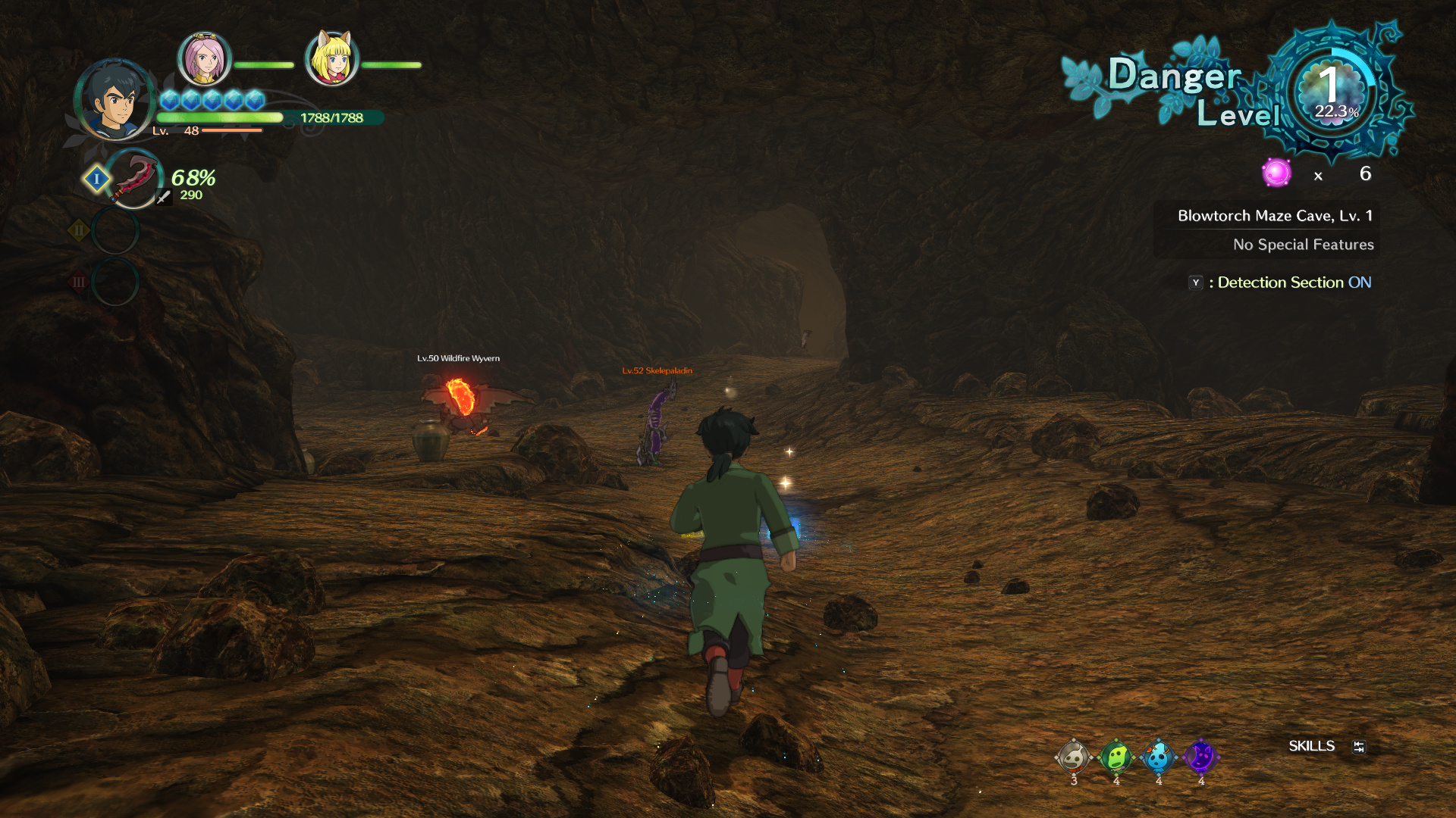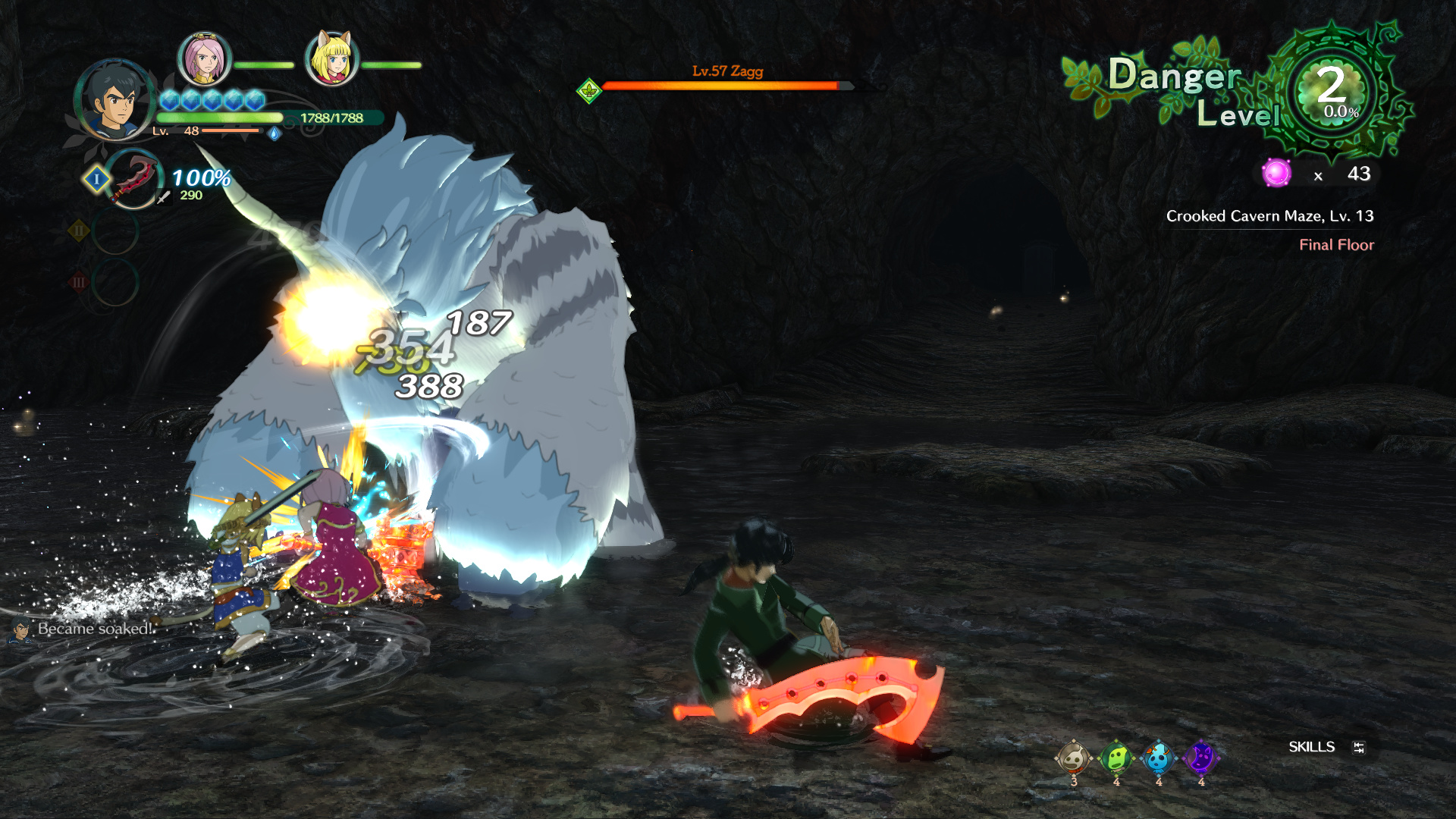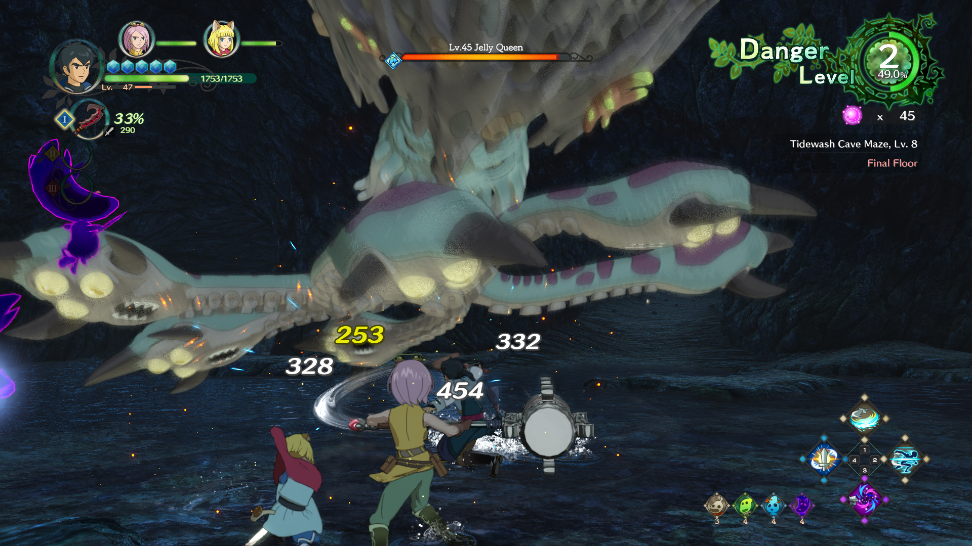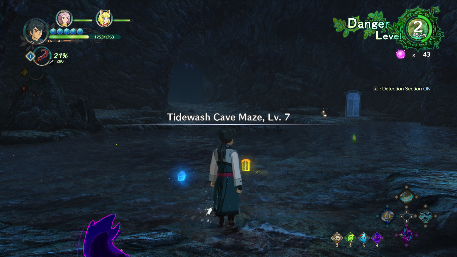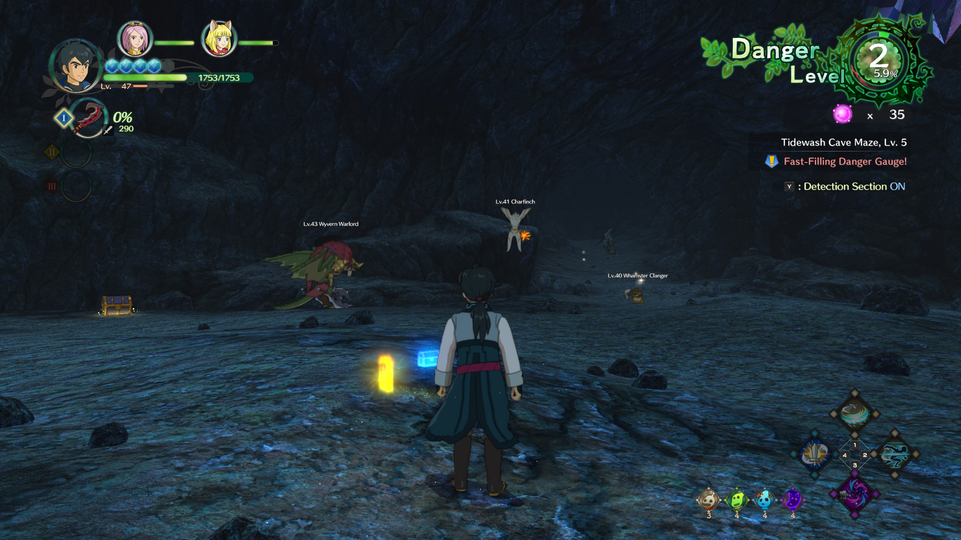 The faster gauge is enough to boost us into danger level 2, which raises the level of the enemies enough that they’re now in aggro range for us. This makes things significantly more annoying. Thankfully, Tidewash Cave only has seven real floors.
