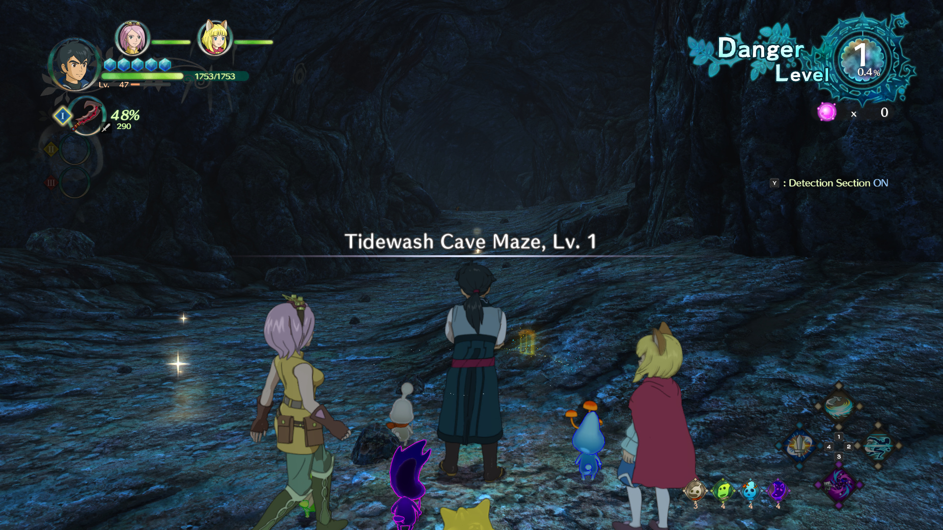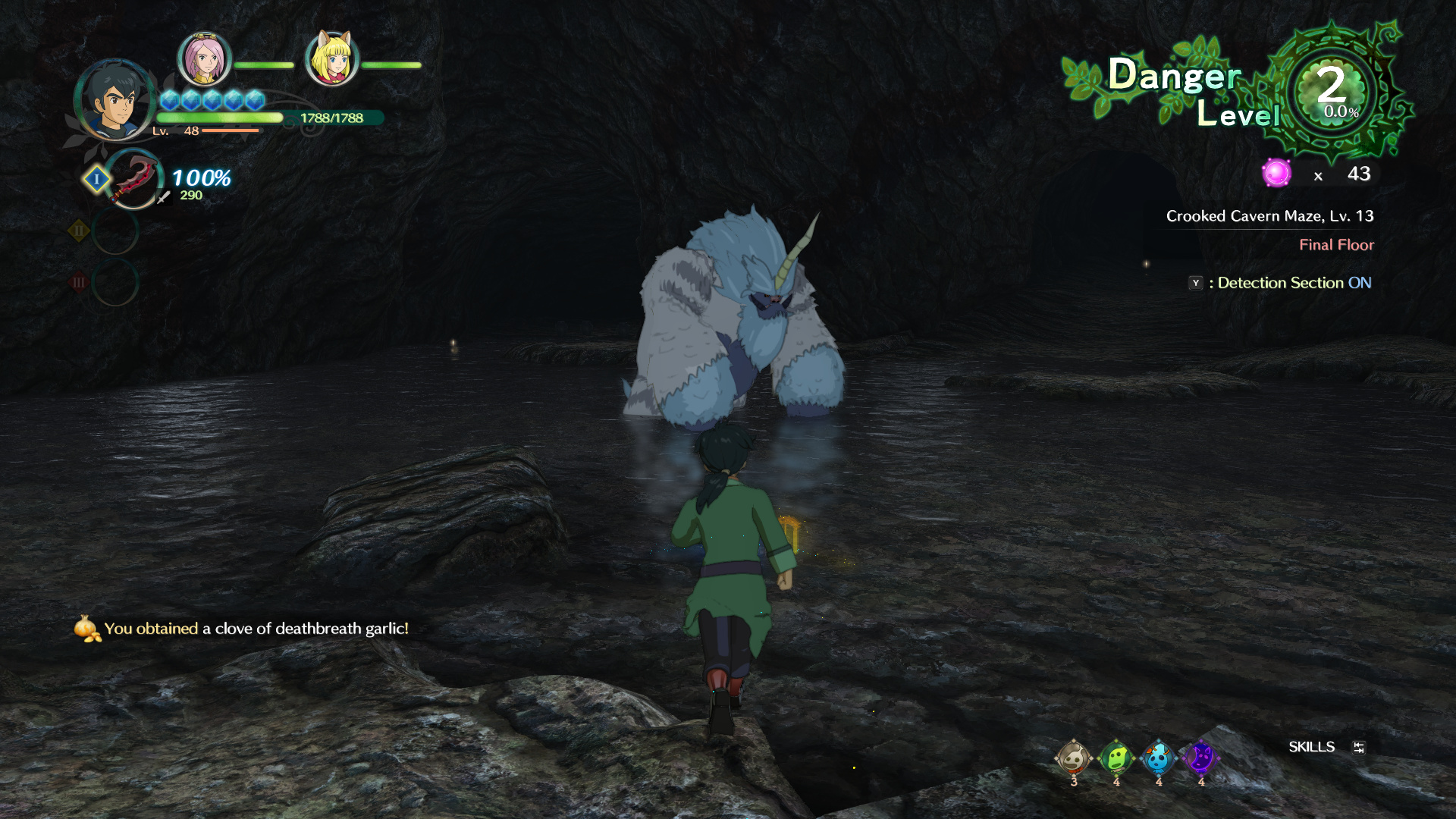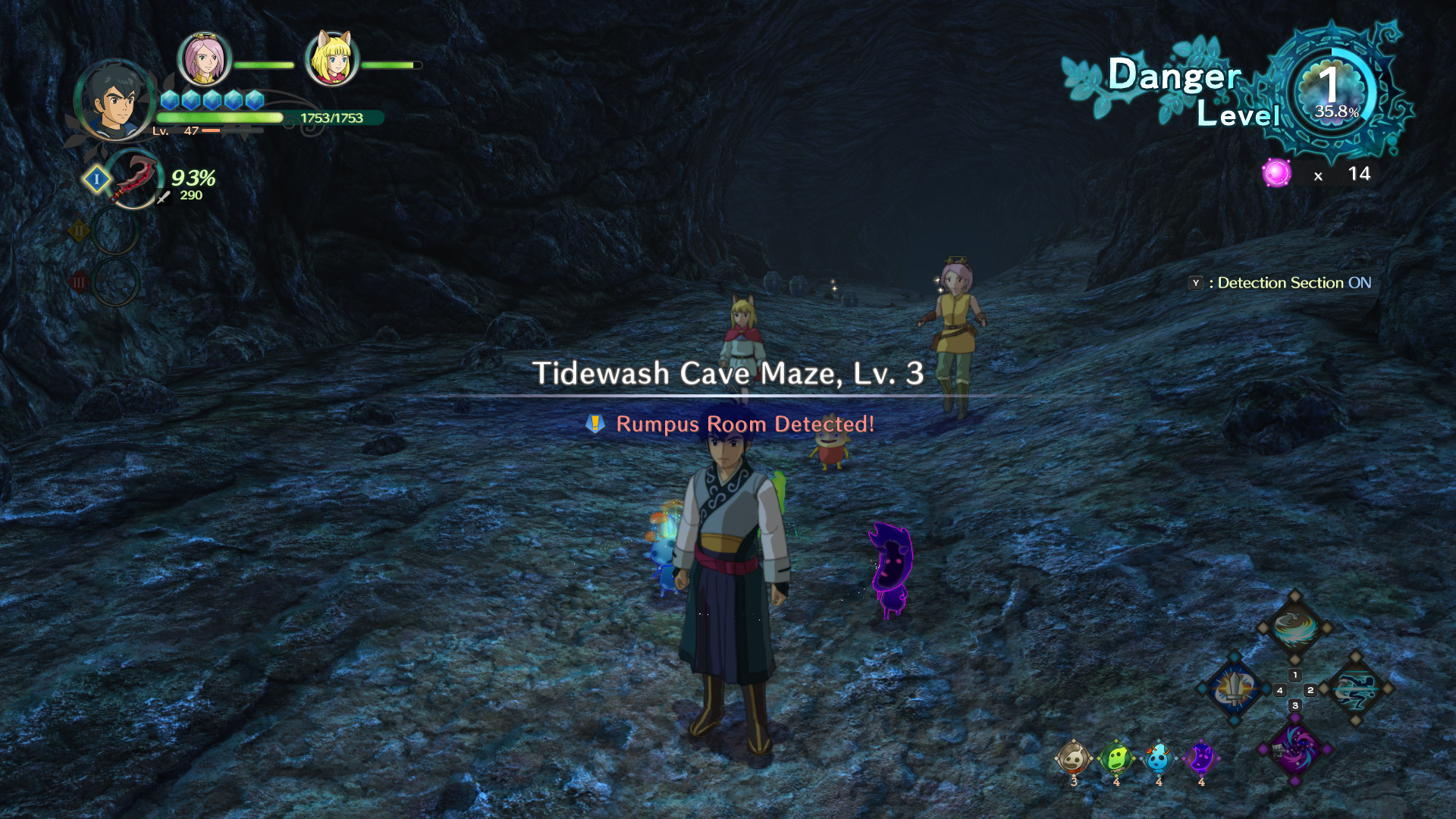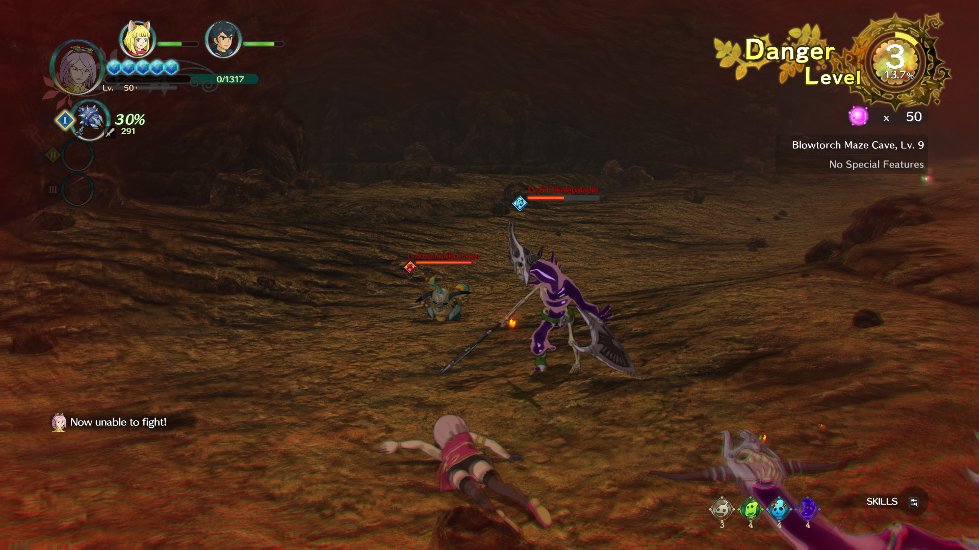 The faster gauge is enough to boost us into danger level 2, which raises the level of the enemies enough that they’re now in aggro range for us. This makes things significantly more annoying. Thankfully, Tidewash Cave only has seven real floors.