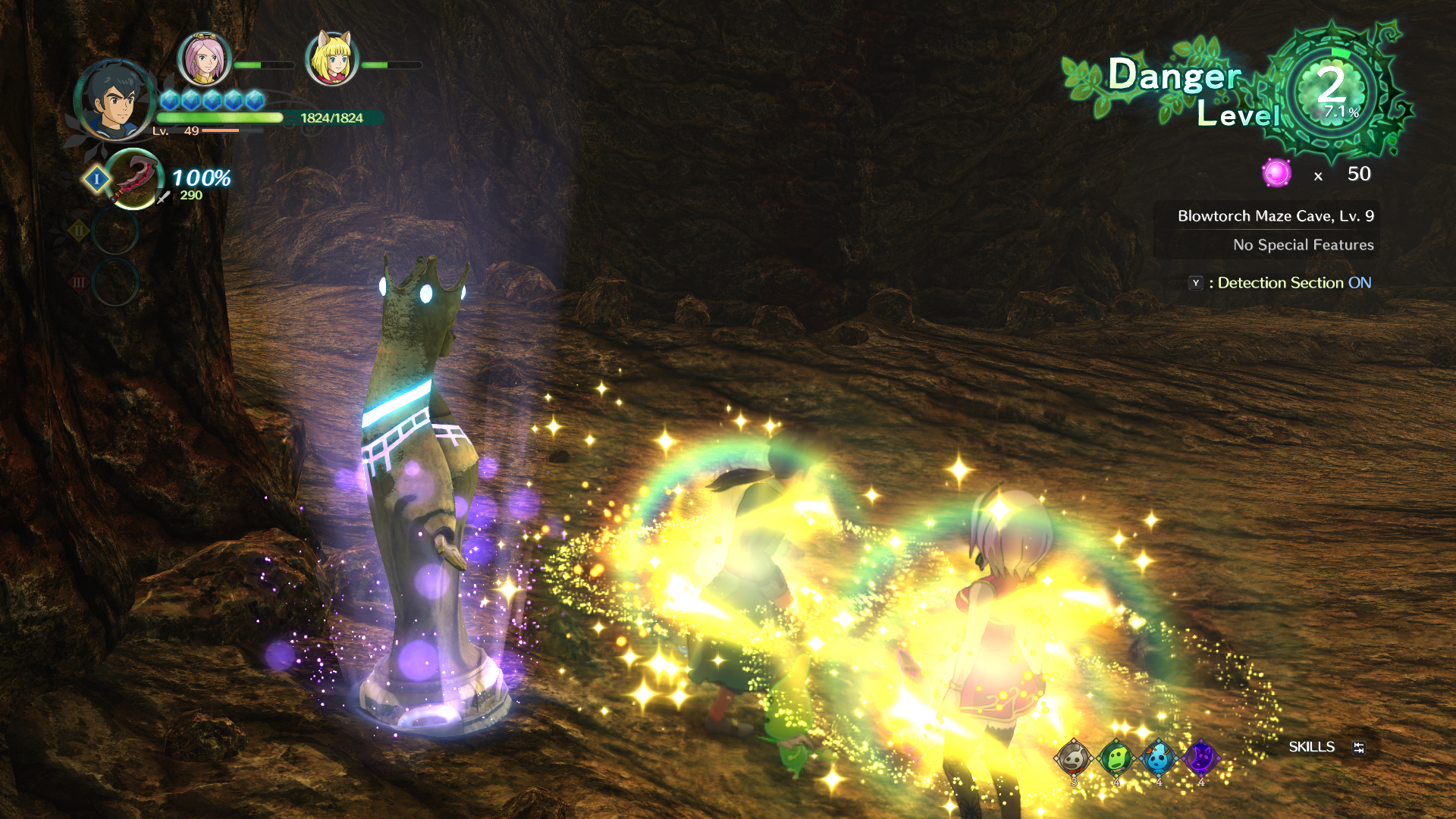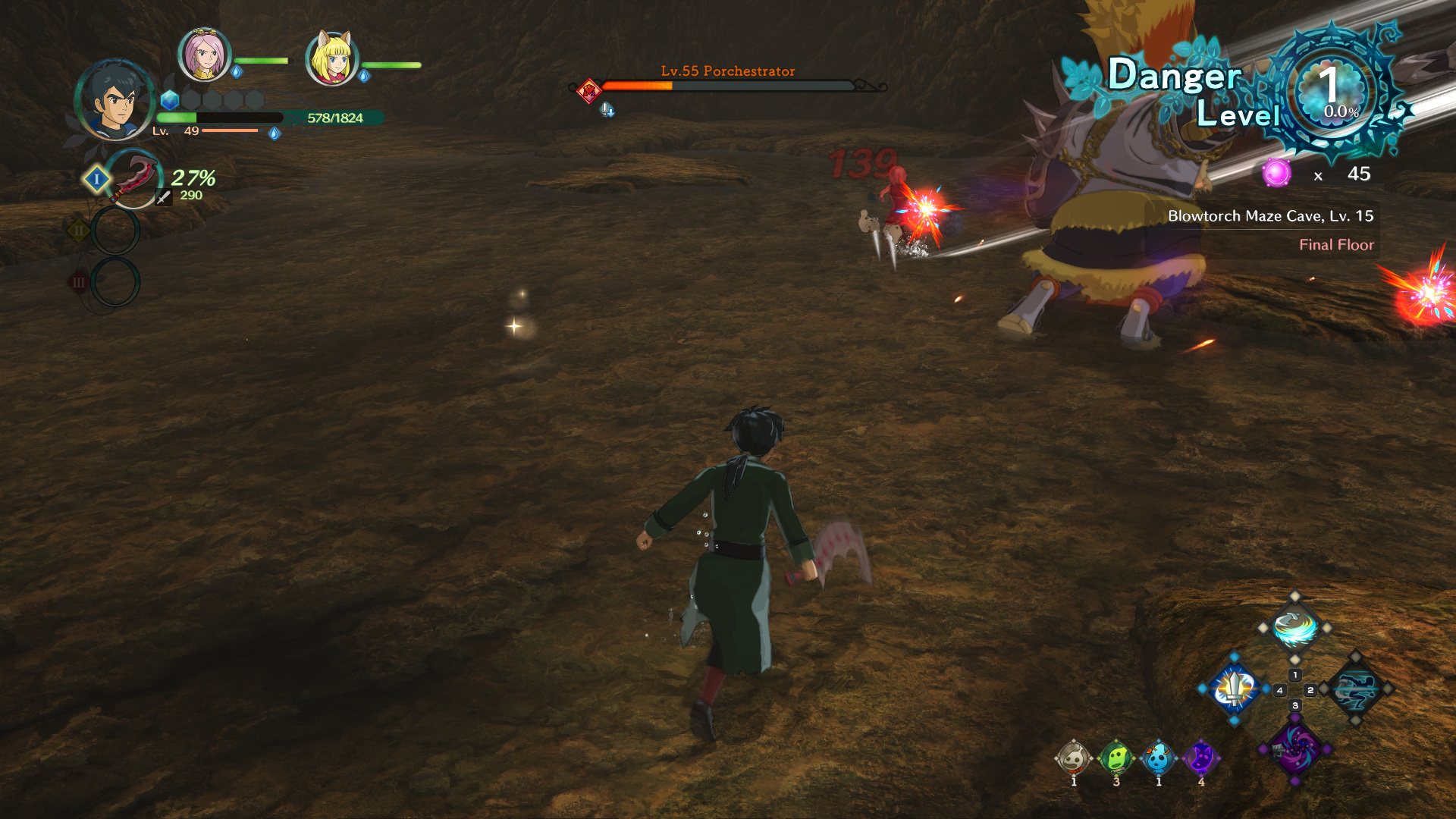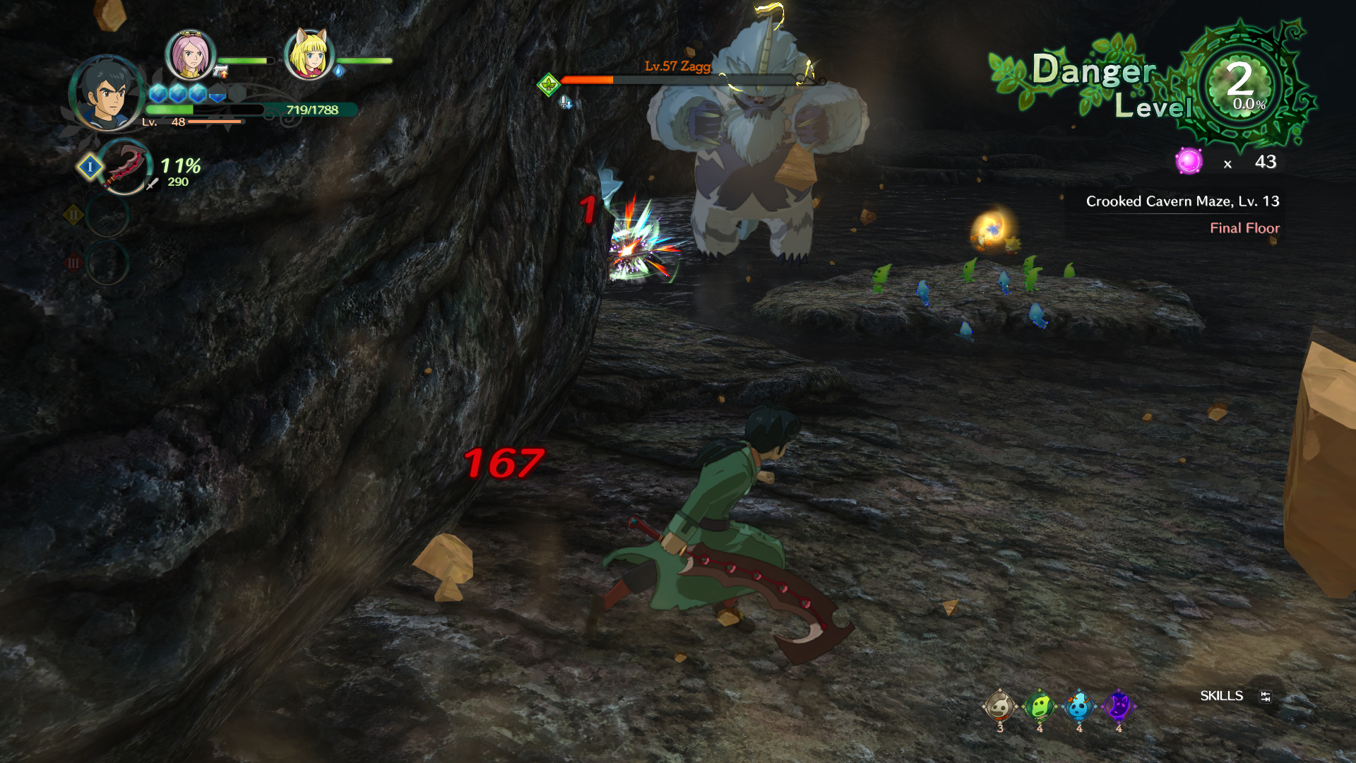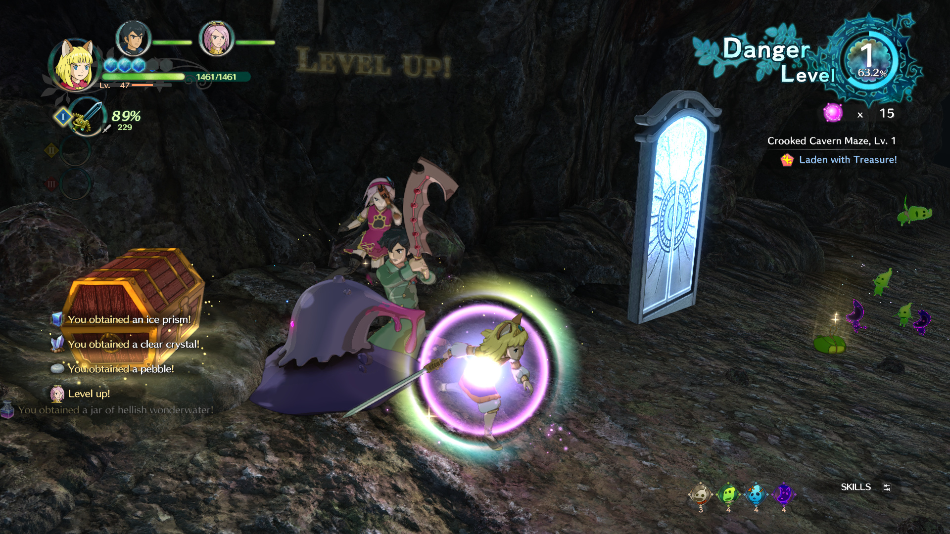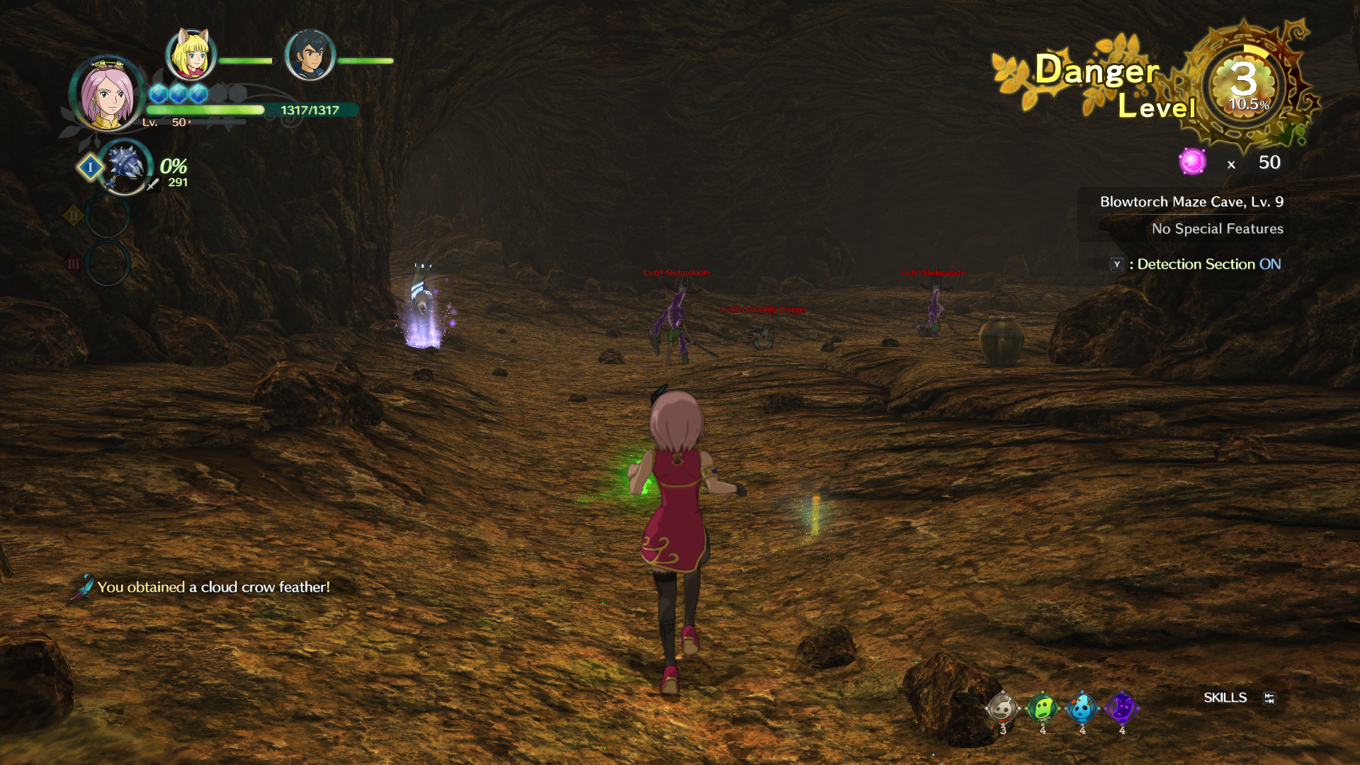 The faster gauge is enough to boost us into danger level 2, which raises the level of the enemies enough that they’re now in aggro range for us. This makes things significantly more annoying. Thankfully, Tidewash Cave only has seven real floors.