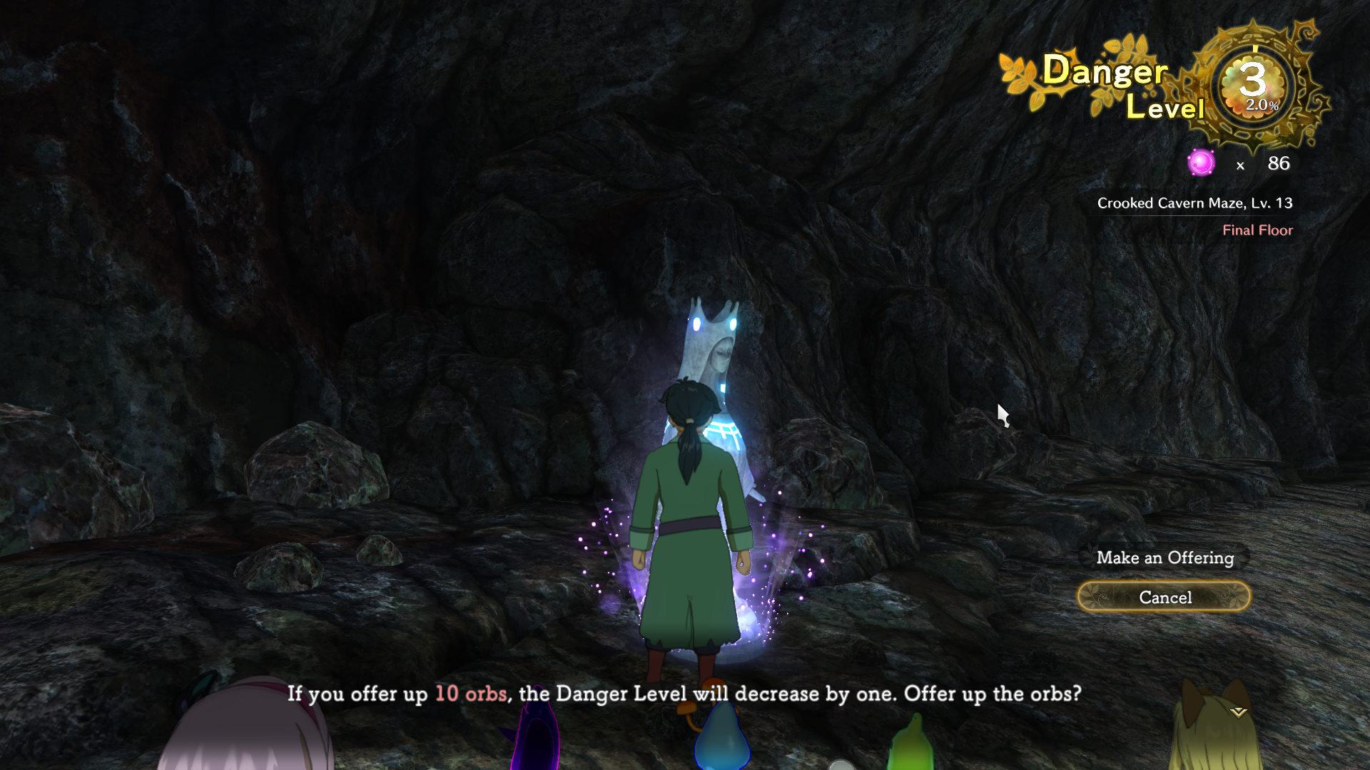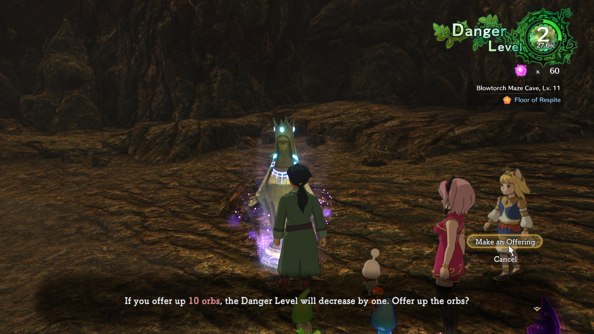 The dungeon stays pretty uneventful until we run into another new NPC on Floor 7. This guy will reset the danger level to 1.. at the cost of all of the pink orbs we’re carrying. The only way he’s ever going to be useful is if you’re in the 100-floor dungeon, because the idols cost 5 to reset and I think double in price every time you use them.