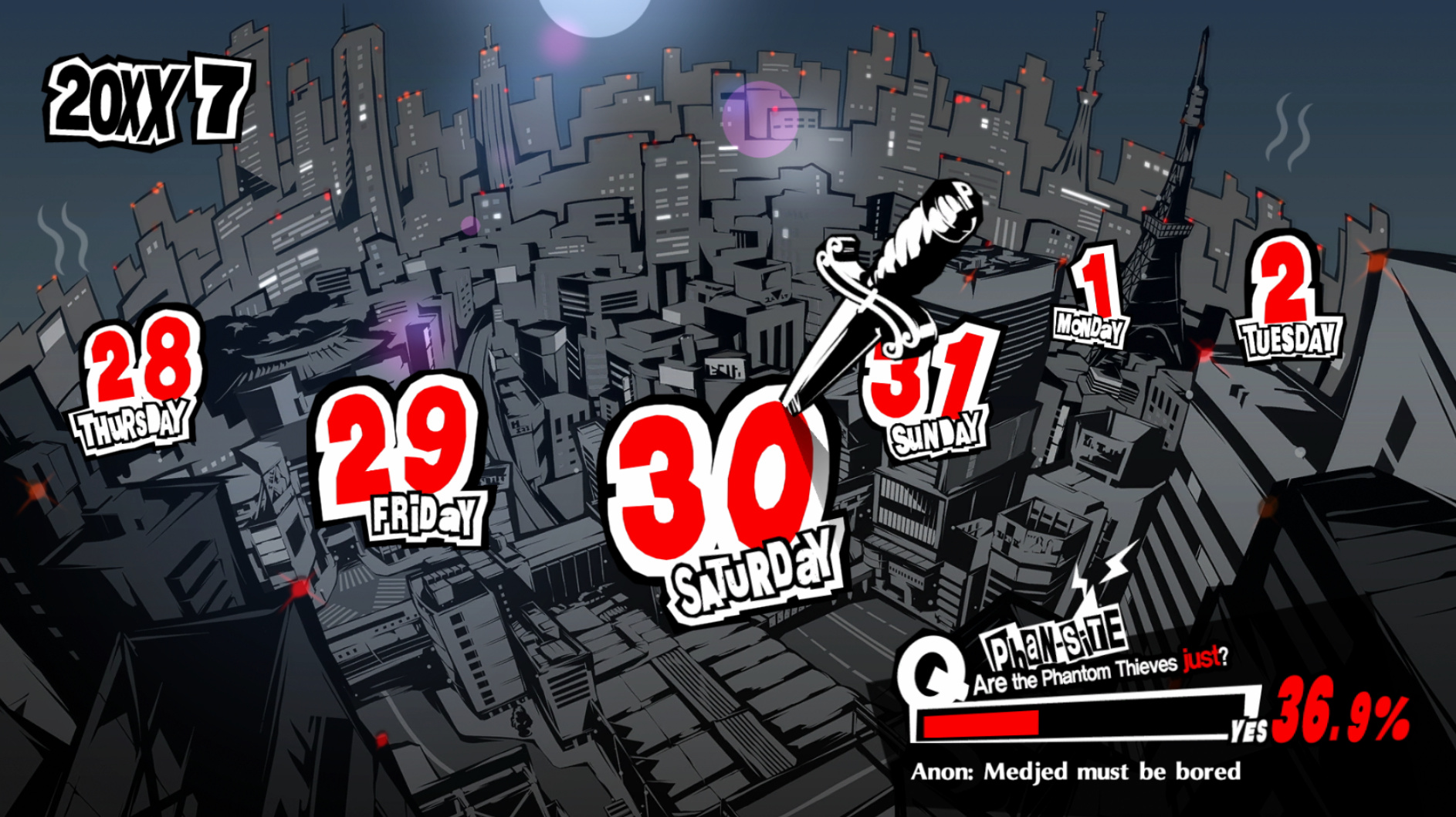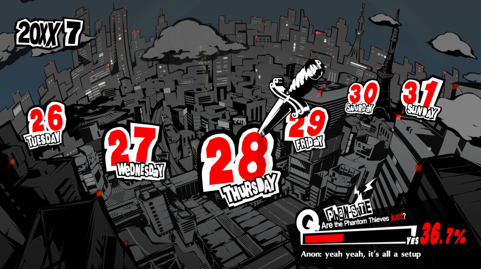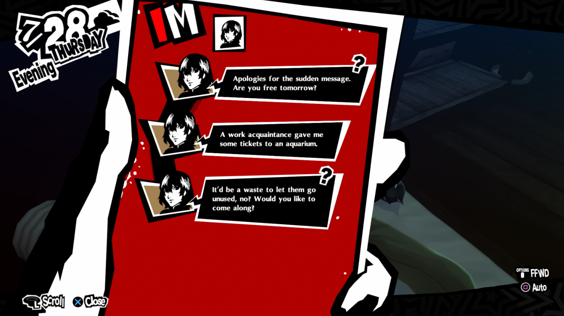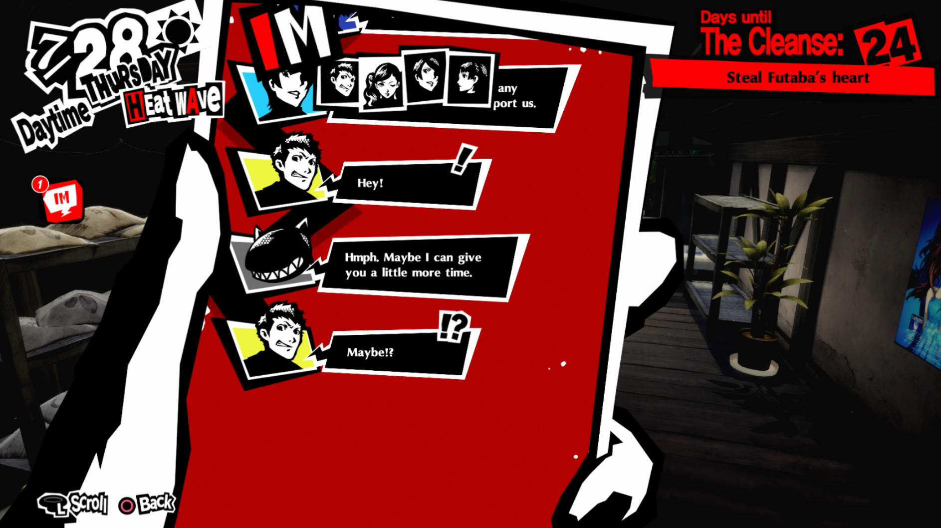 : We have a message from Kasumi that we’re forced to look at. We’re nearly maxed out with her until after the end of the base game, and will finish her confidant on the 10th.