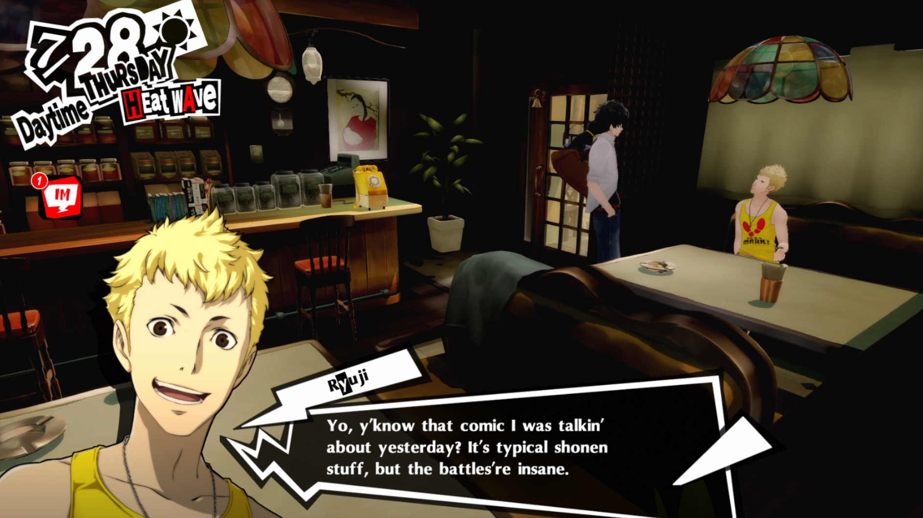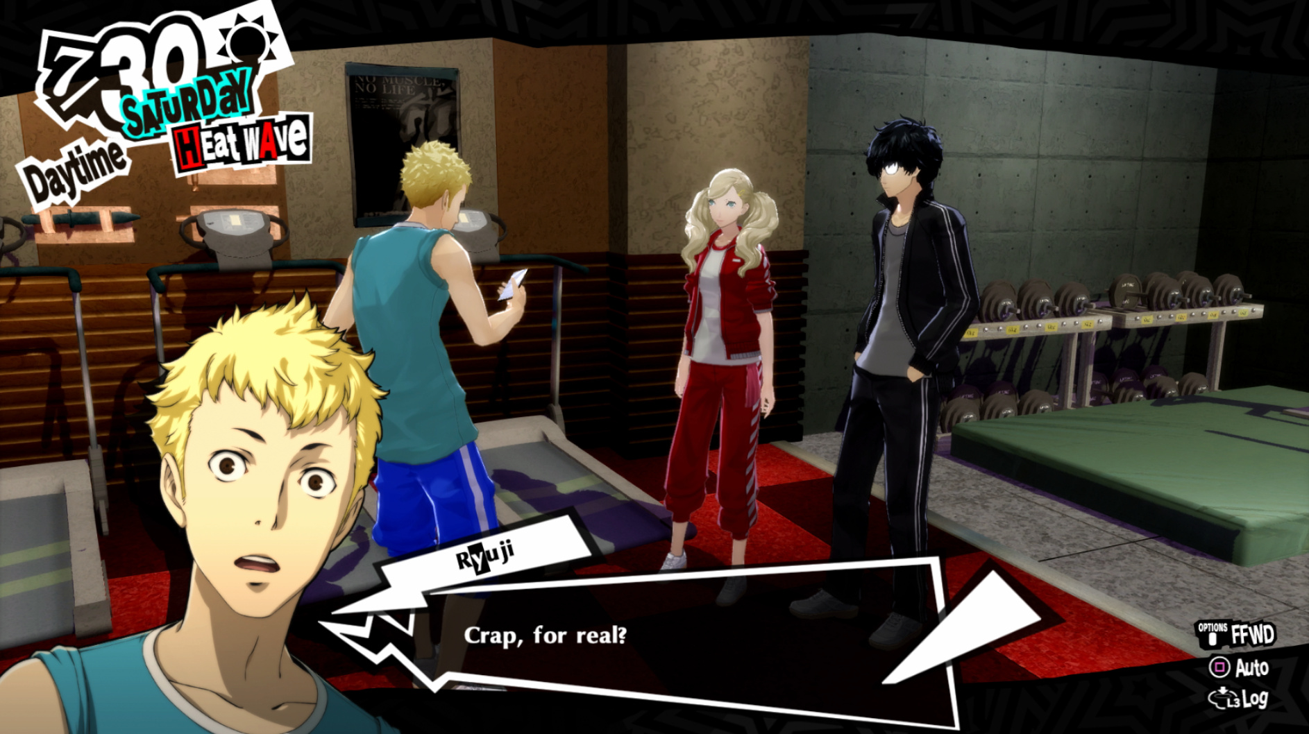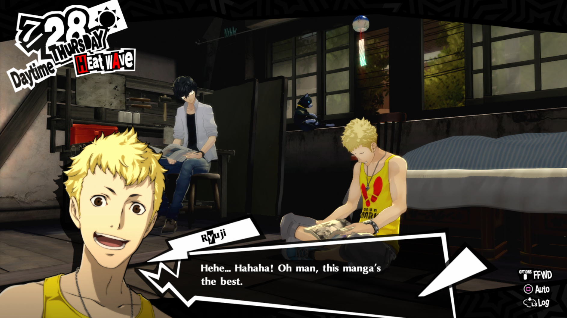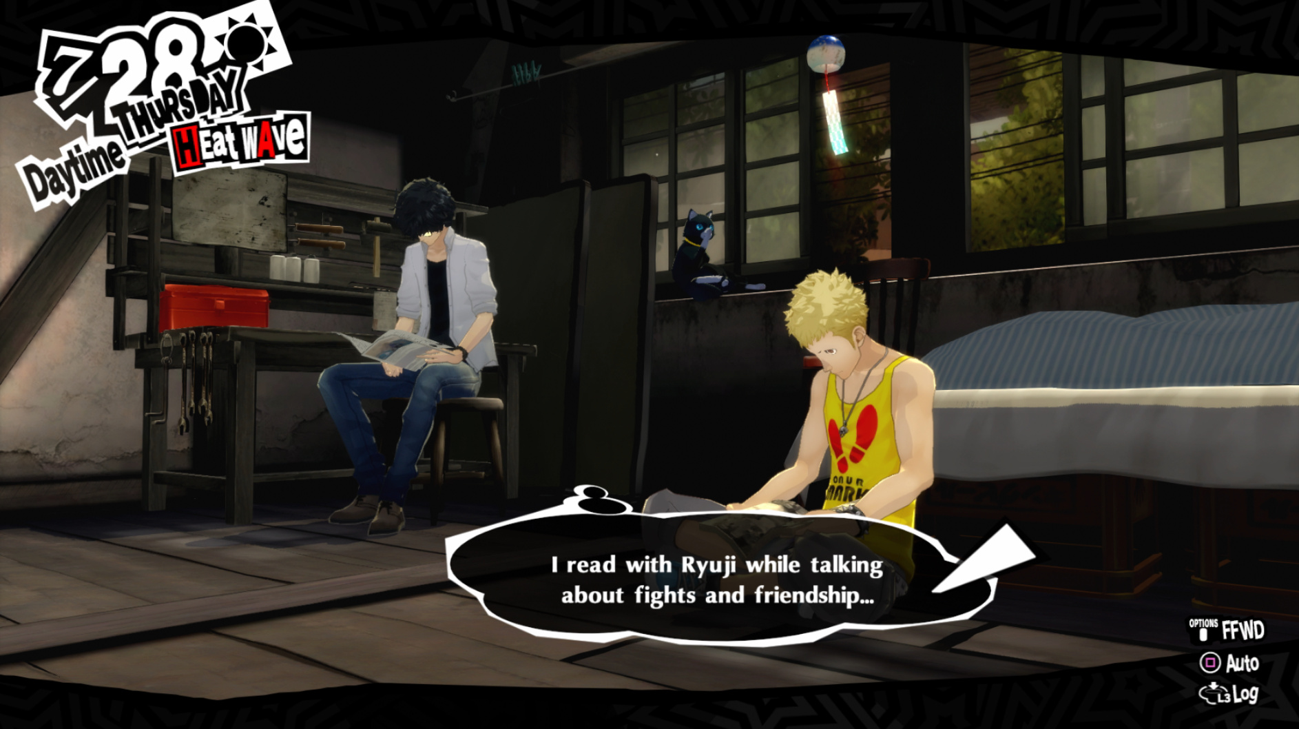 : I love how unrealistic this scene is. This is 2016, Ryuji would be reading that either on a laptop or on his phone. Anyway, we get five points to Guts and three to Ryuji’s confidant.