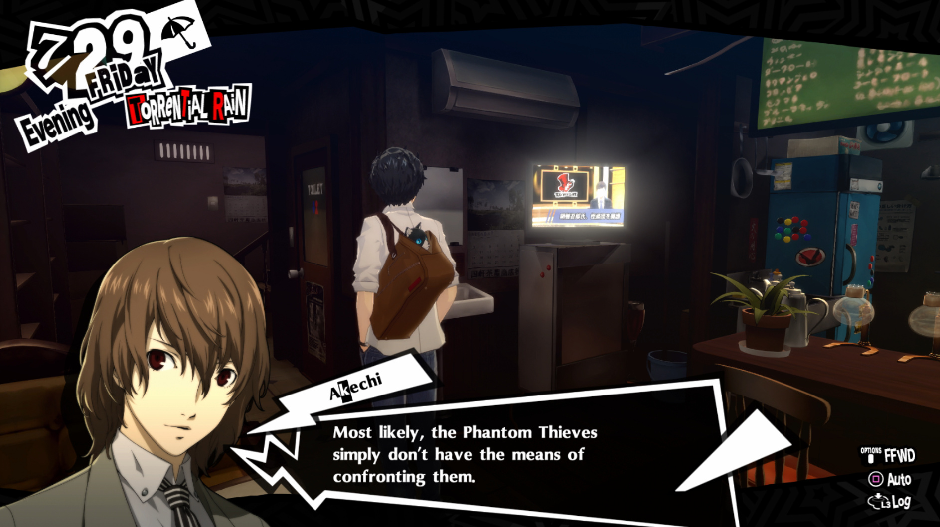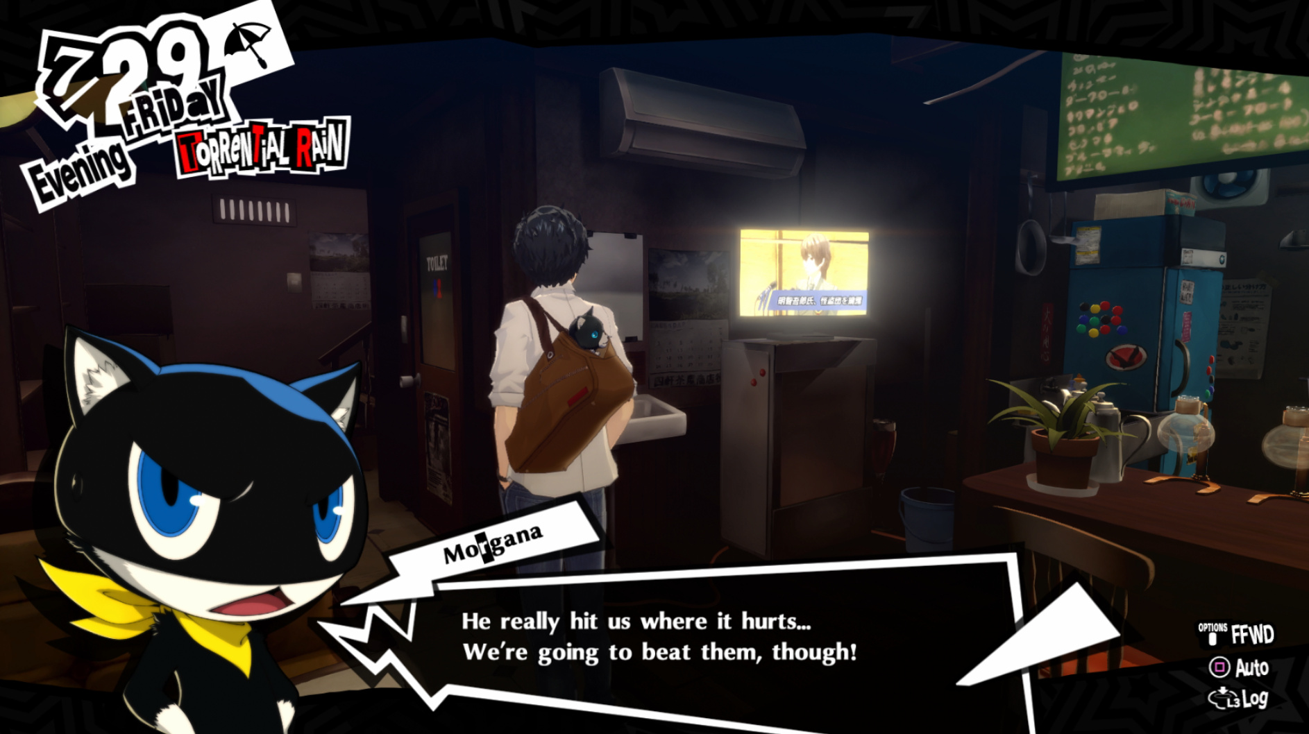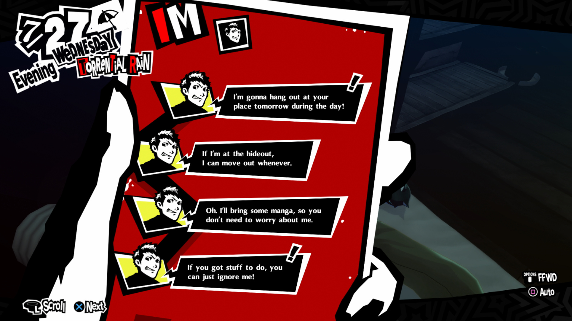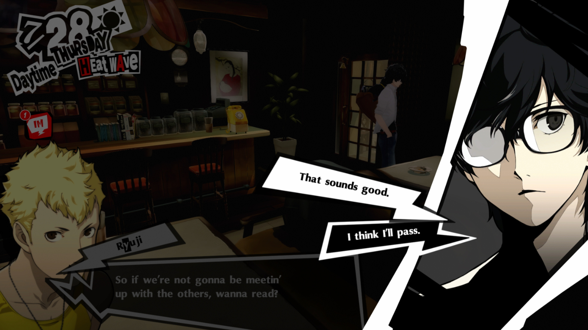 : I love how unrealistic this scene is. This is 2016, Ryuji would be reading that either on a laptop or on his phone. Anyway, we get five points to Guts and three to Ryuji’s confidant.