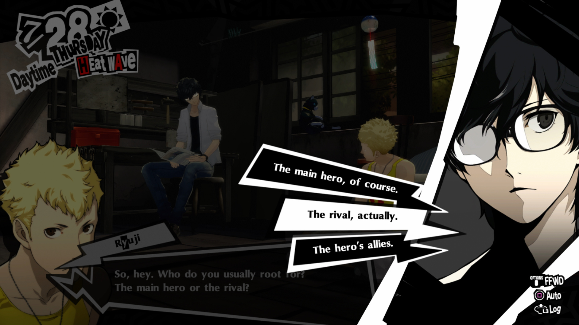 : “The fight between the main guy and his rival really gets me goin’. I want 'em both to win! So, hey. Who do you usually root for? The main hero or the rival?”