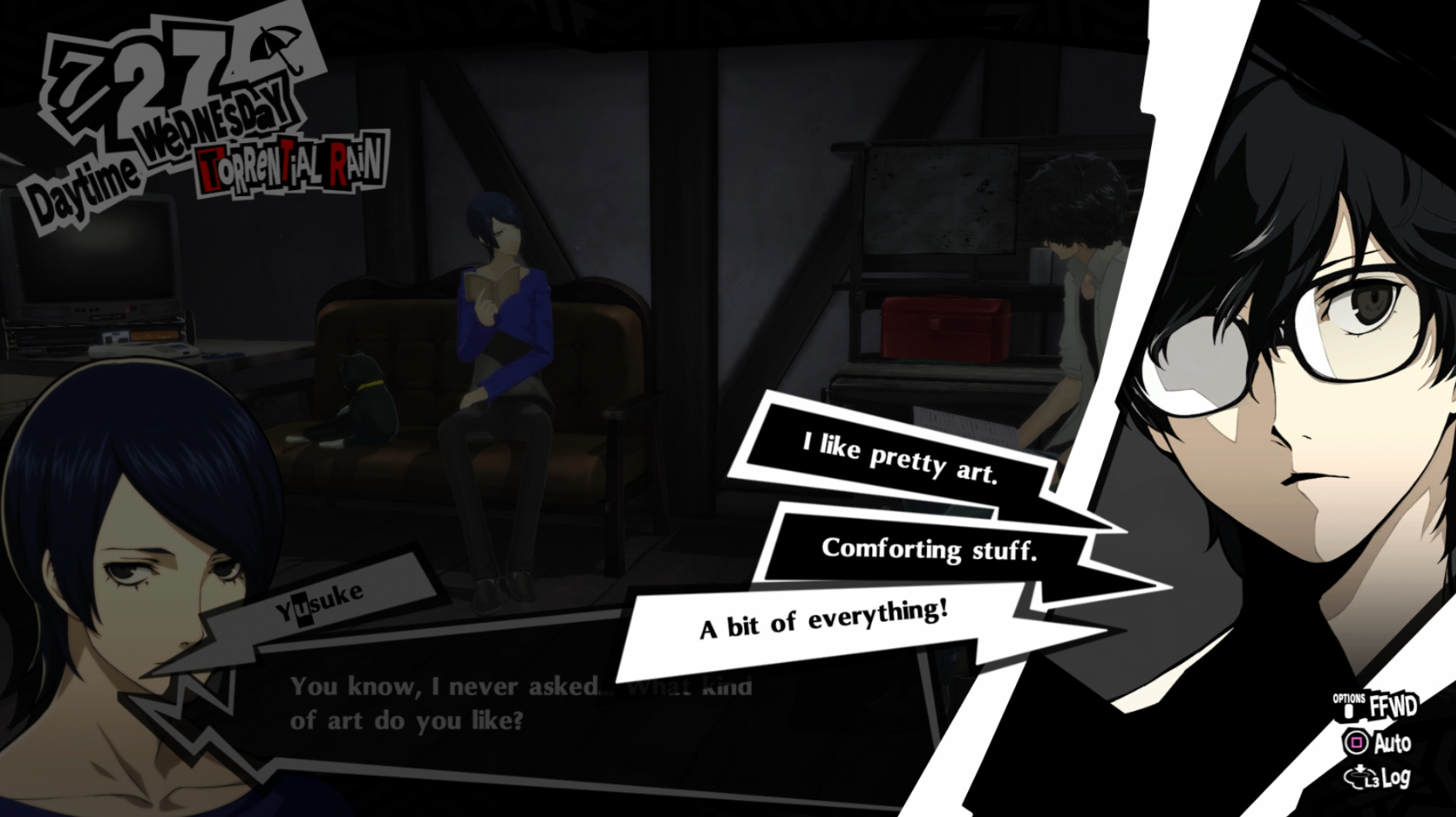 : Joker spits out his coffee. “Look, Yusuke, I really think we should save that for marriage. Nothing good can come of talking about art preferences before then.”