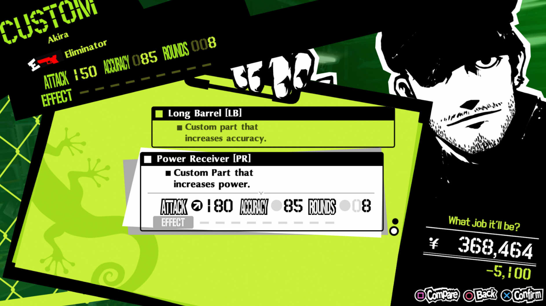 : I went back to the shop before doing anything to show off gun customization. You can equip one part, and it’s expensive enough that it’s usually not worth doing until near the end of the game.