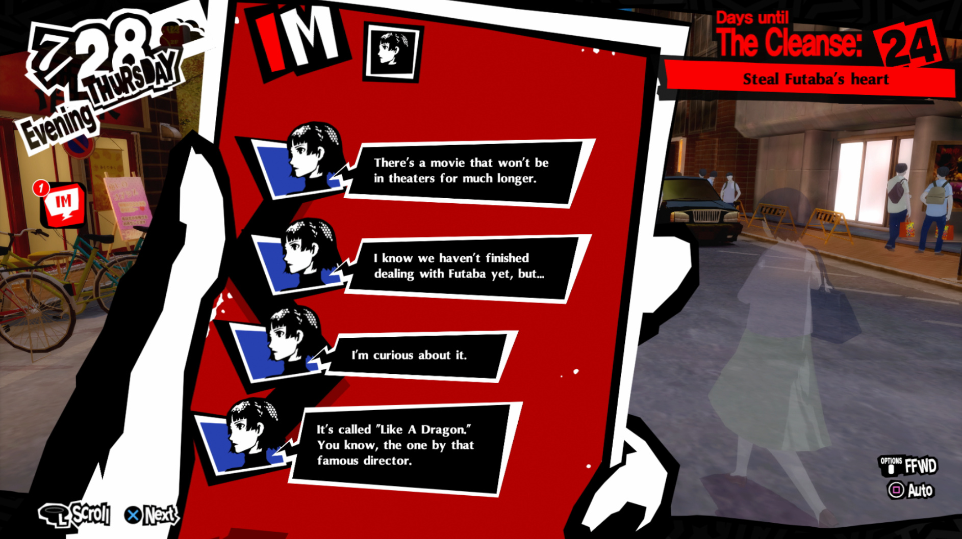 : This, by the way, is not the only time Yakuza comes up in Persona 5. In Strikers (which released in Japan right around the same time Yakuza 7 did), Makoto talks about how she wants to see “Dragon: Like a Yakuza” in the theater.