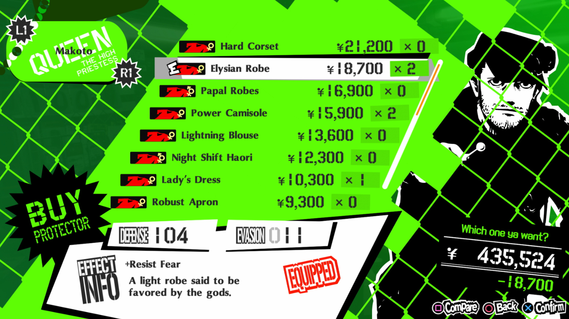 : The key thing here is to buy the Elysian Robe for Ann and Makoto, because the next boss’s favorite thing is spamming fear.