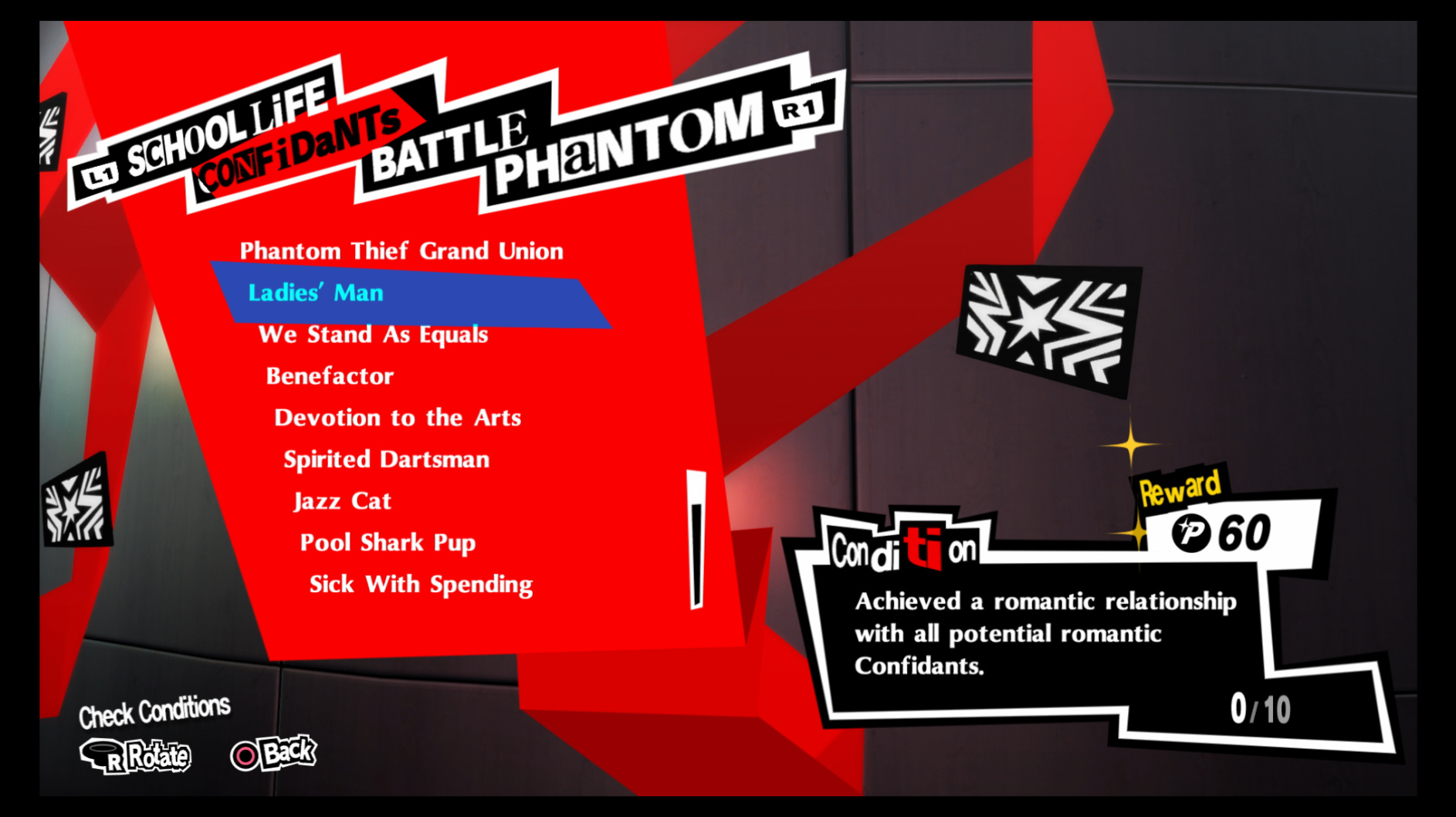 : There’s also one for seeing both the Rank 10 cutscenes on the Romance route for all 10 female confidants. This means that yes, we can date Doctor Femdom if we want. She’s a very popular choice, but she’s not the best girl. We can do this without permafucking because the game saves system data every time you save, and the achievements are based off your system data. At some point, probably once we reach June or July, I’ll put up a poll for who we want to go for, if anyone.