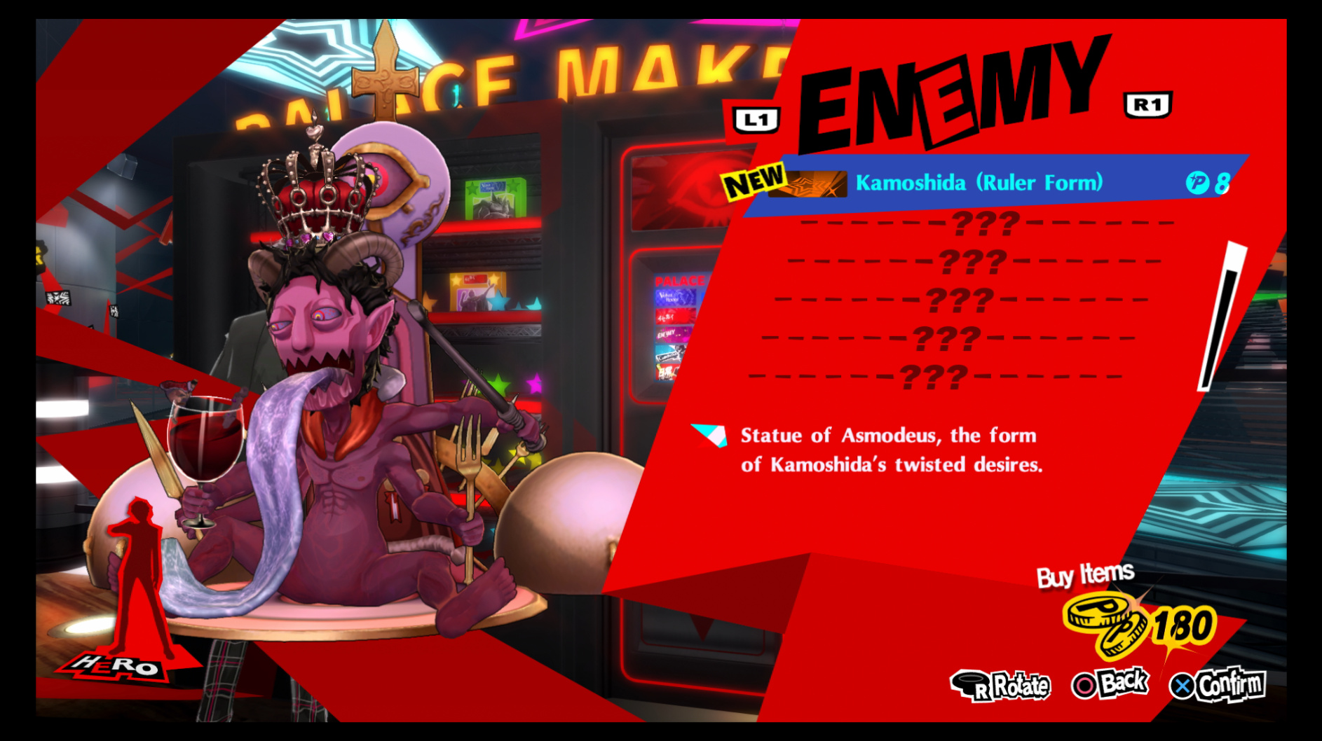 : As an example, we can buy a statue of Kamoshida’s demon form. I don’t know why we’d want that. The “enemy” category is pretty much entirely statues of the major bosses, including a few you can only actually see on New Game + because they’re of the final bosses.