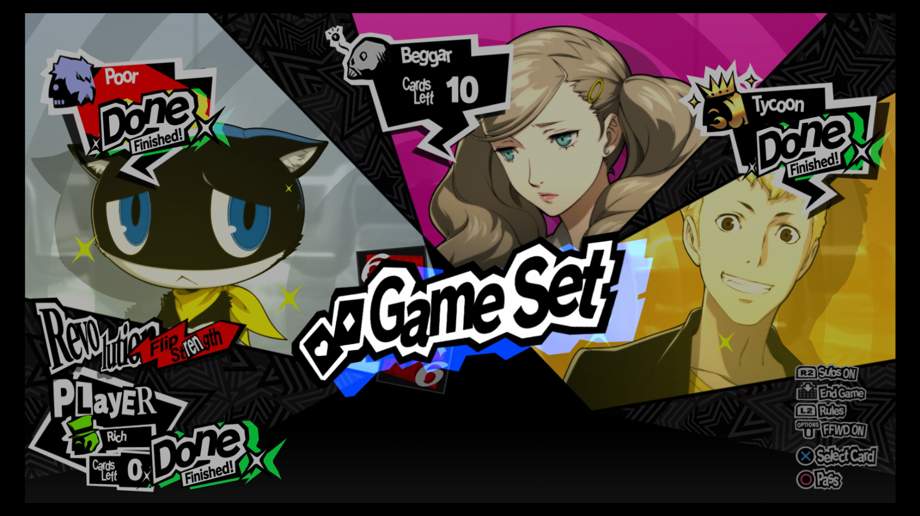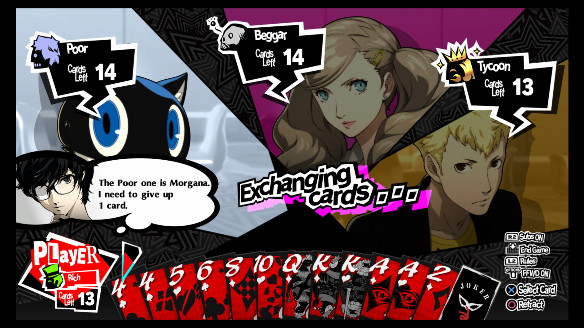 : I came in second the first two rounds. The highest-ranking player is the Tycoon, and the lowest is the Beggar. Second place is Rich, third place is Poor. At the end of the round, the Tycoon has to give a card to the Beggar and the Rich has to give a card to the Poor.