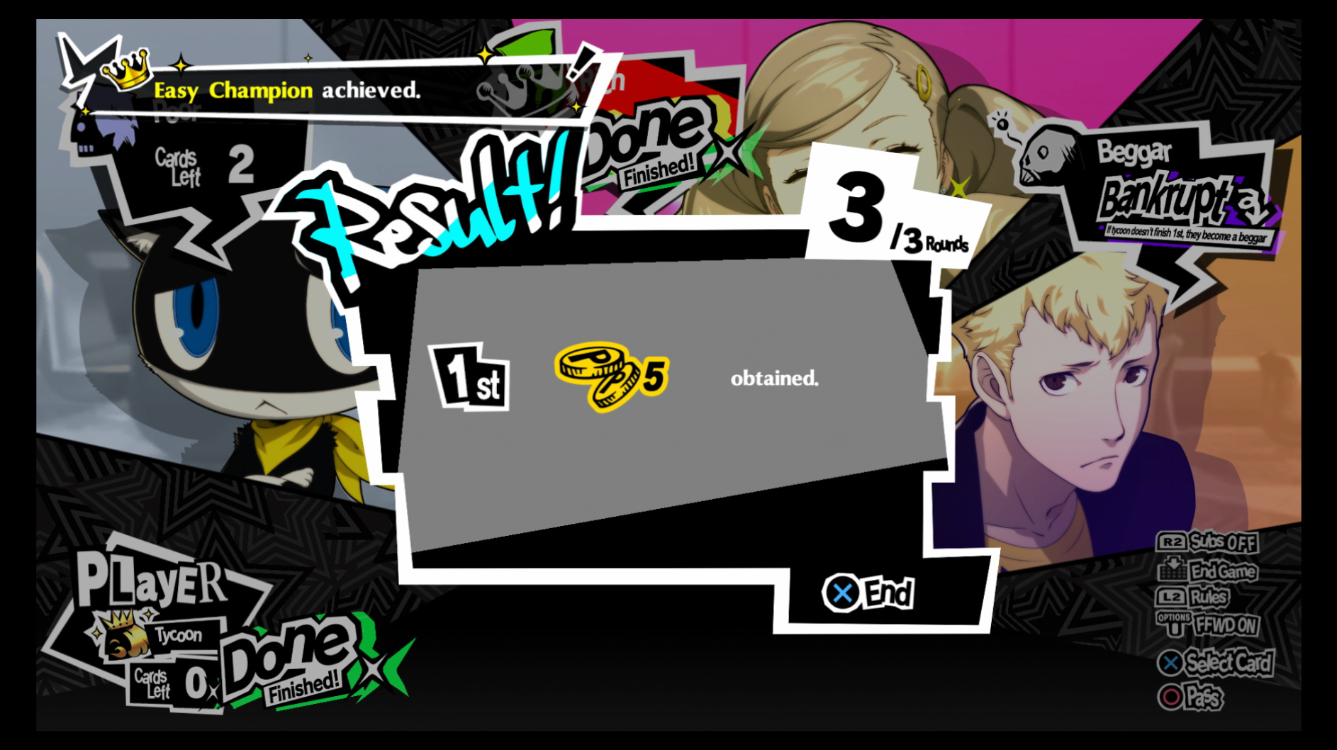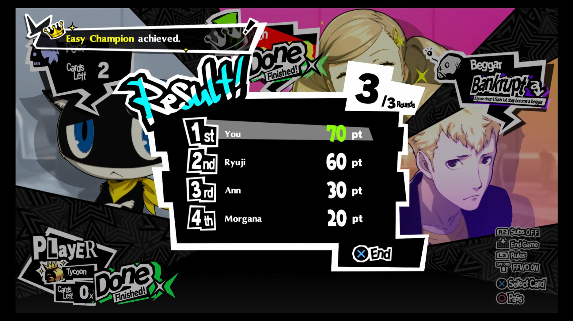 : Tycoon is another way to get P Medals. I’ve heard it’s bullshit hard, but I only actually played on the easiest difficulty because I had no idea how it works. Playing cards in your brain with clones of your friends is a perfectly normal activity.