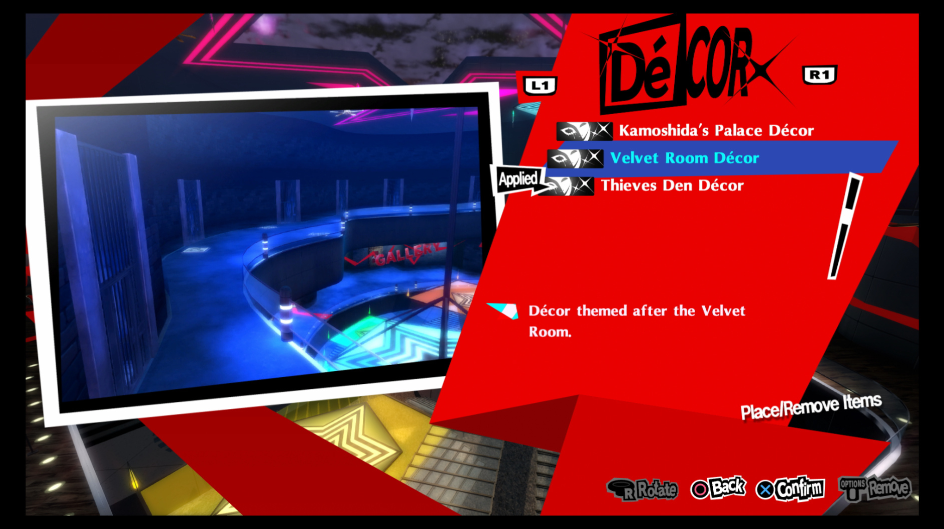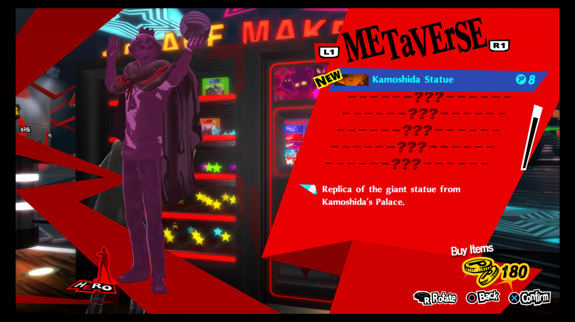 : The “Metaverse” category has items from the various dungeons. We could buy the big statue of Kamoshida from the church if we wanted. I don’t know why we’d want to do that either.