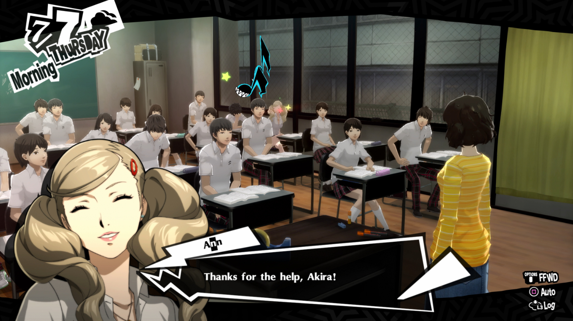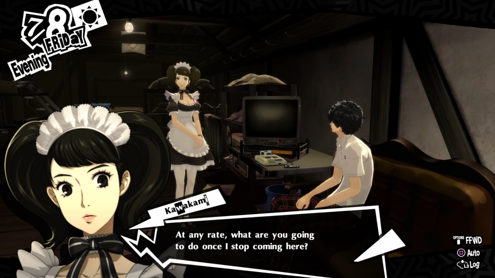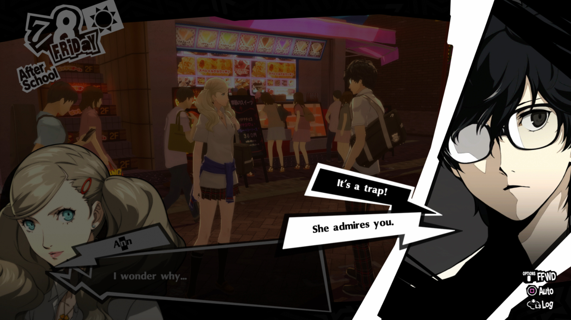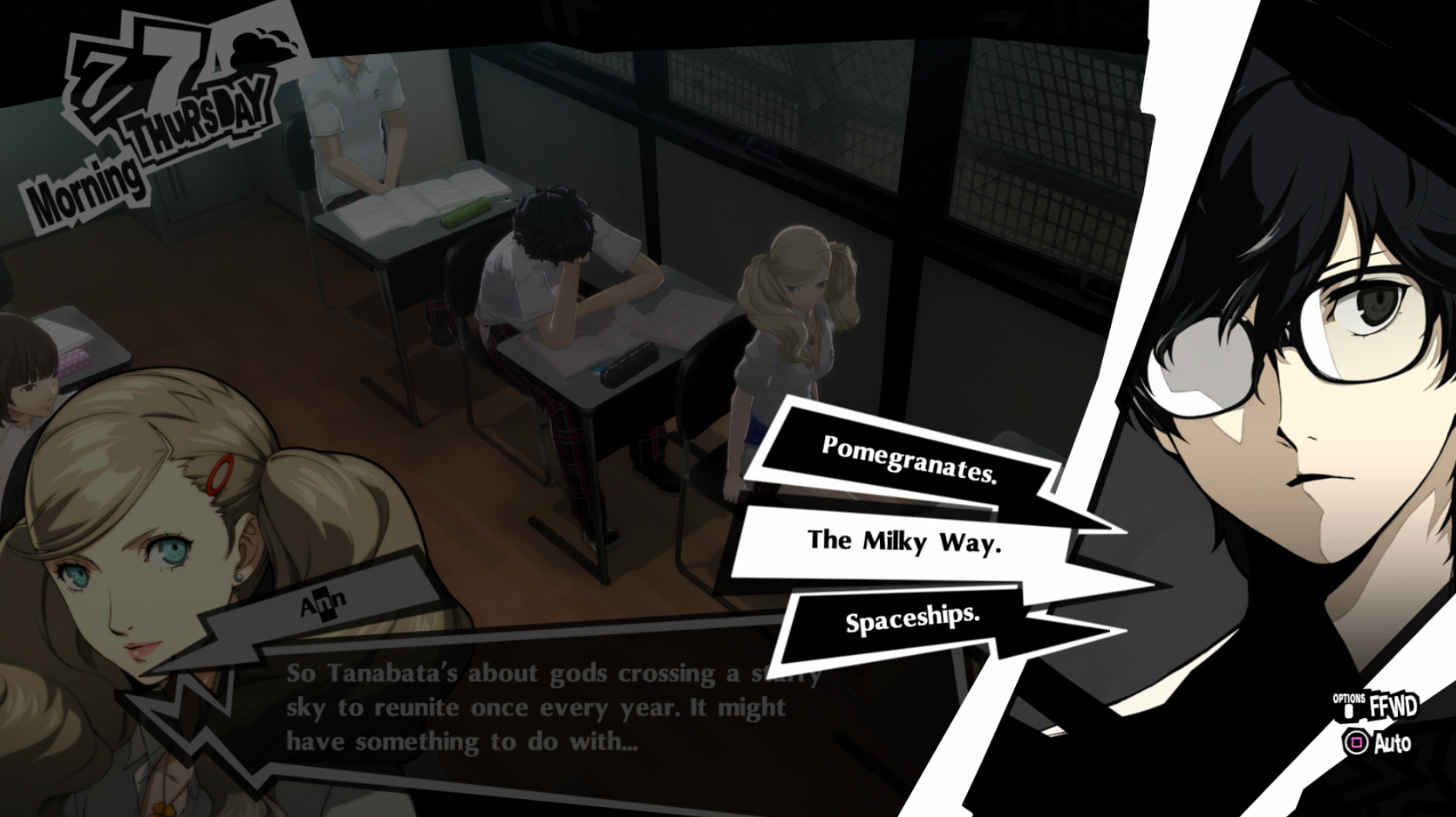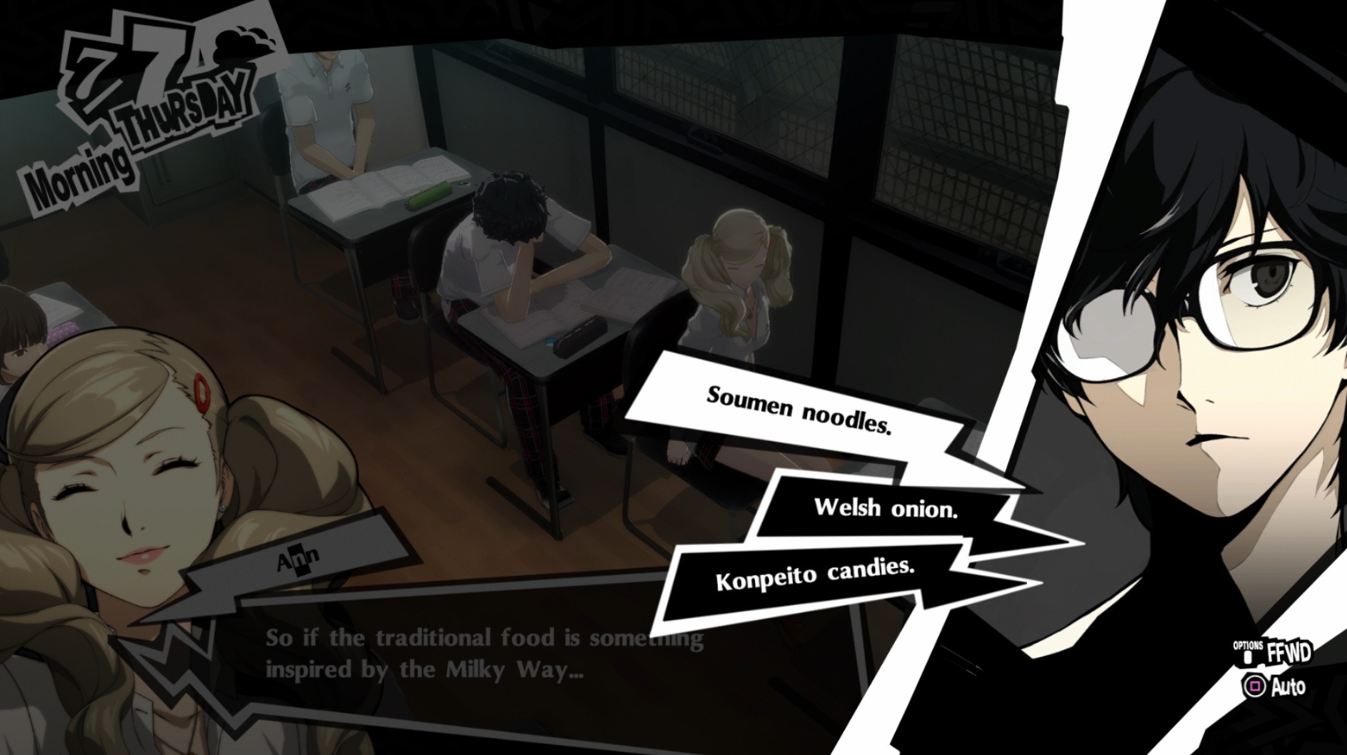 : Joker tries to figure out the best way to signal Ann to turn off speakerphone so he can tell them not to let her know he brings Morgana to his exams.