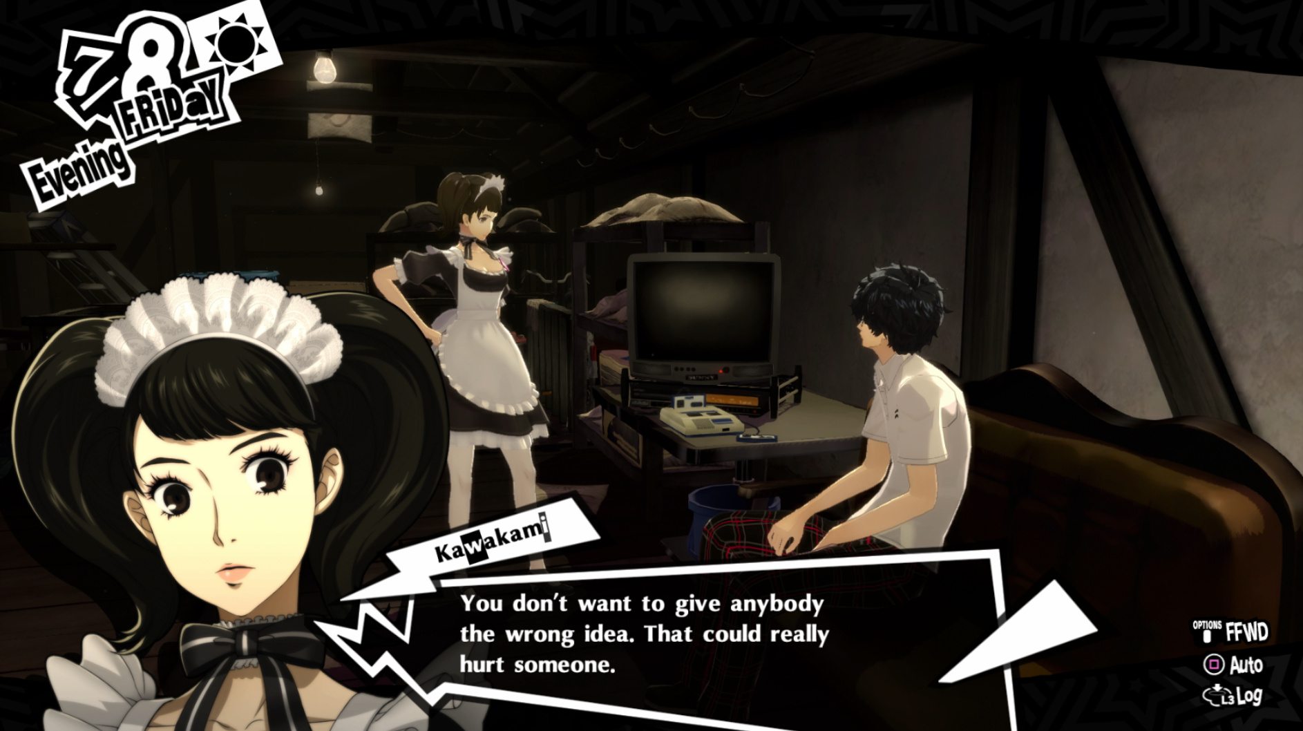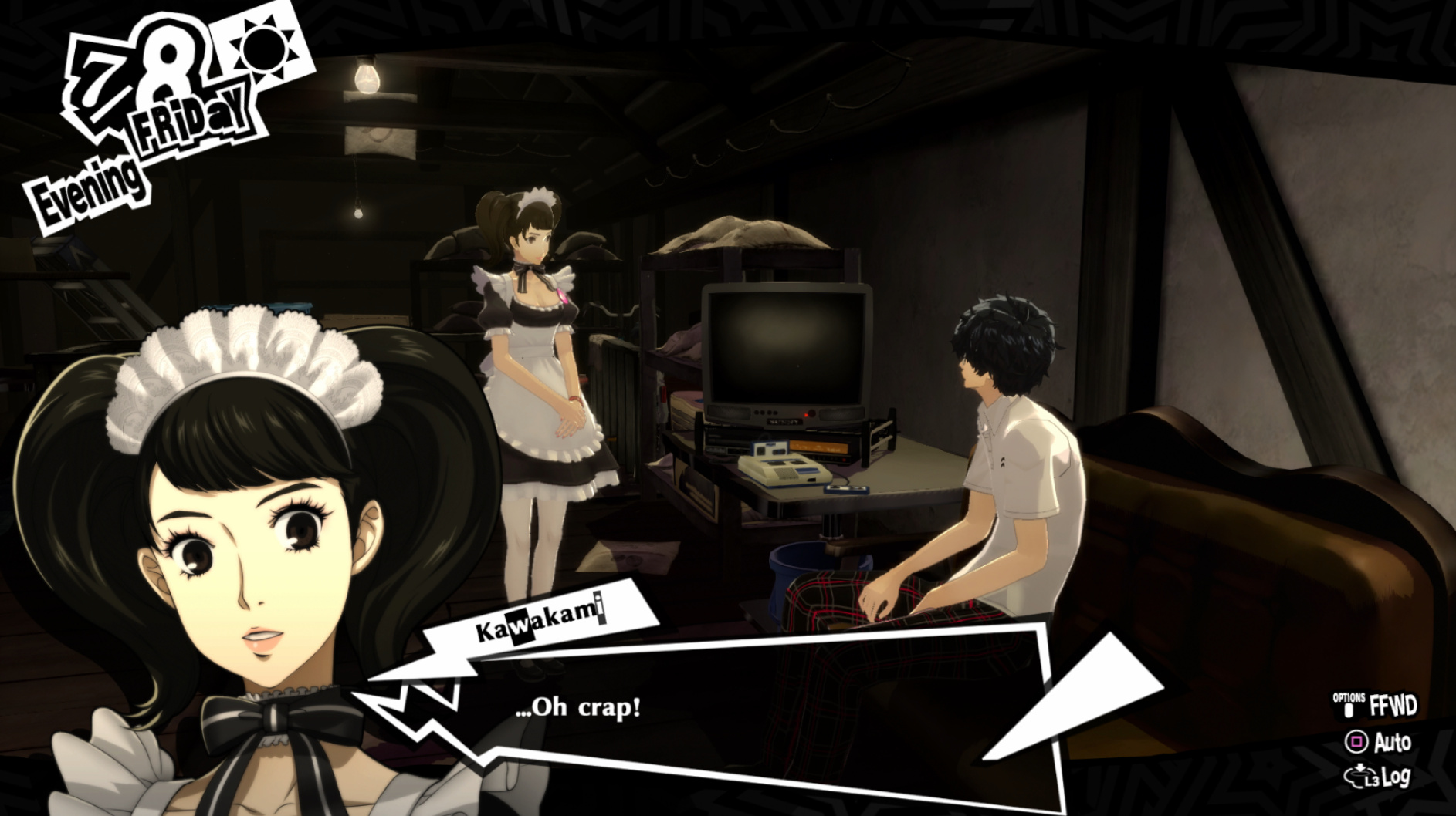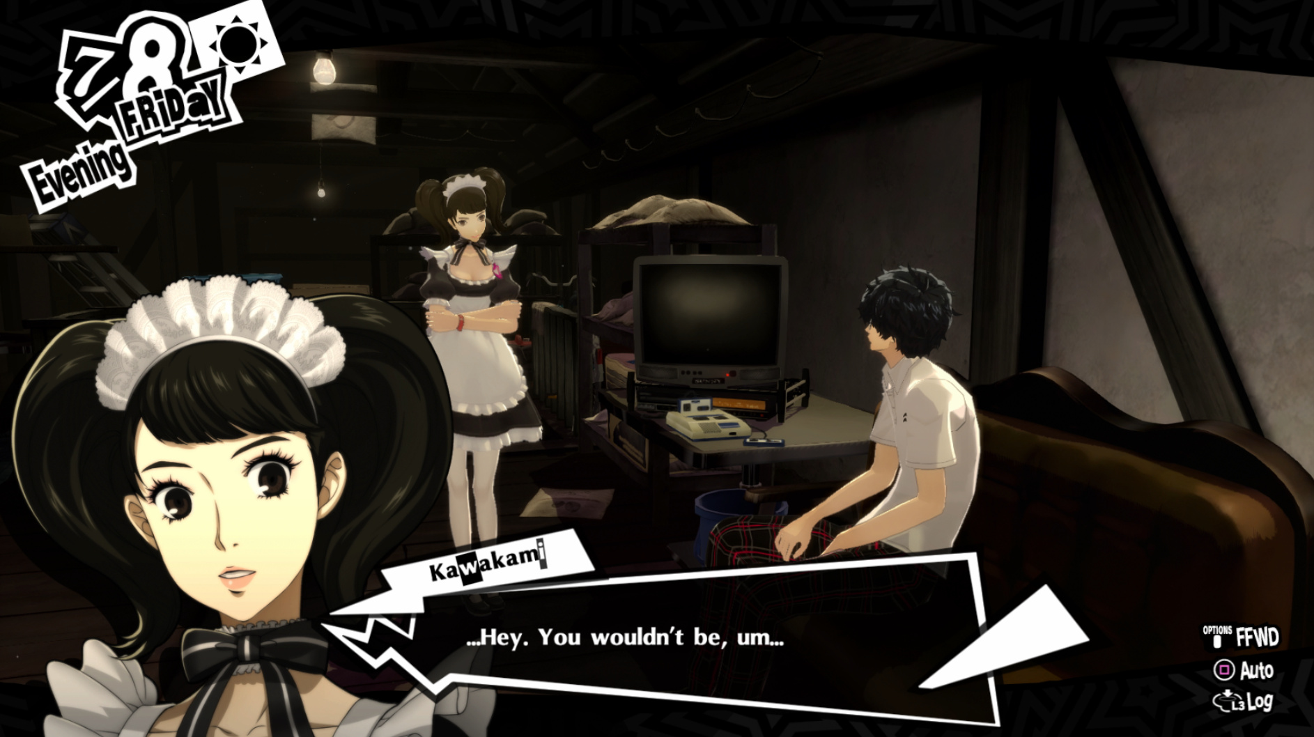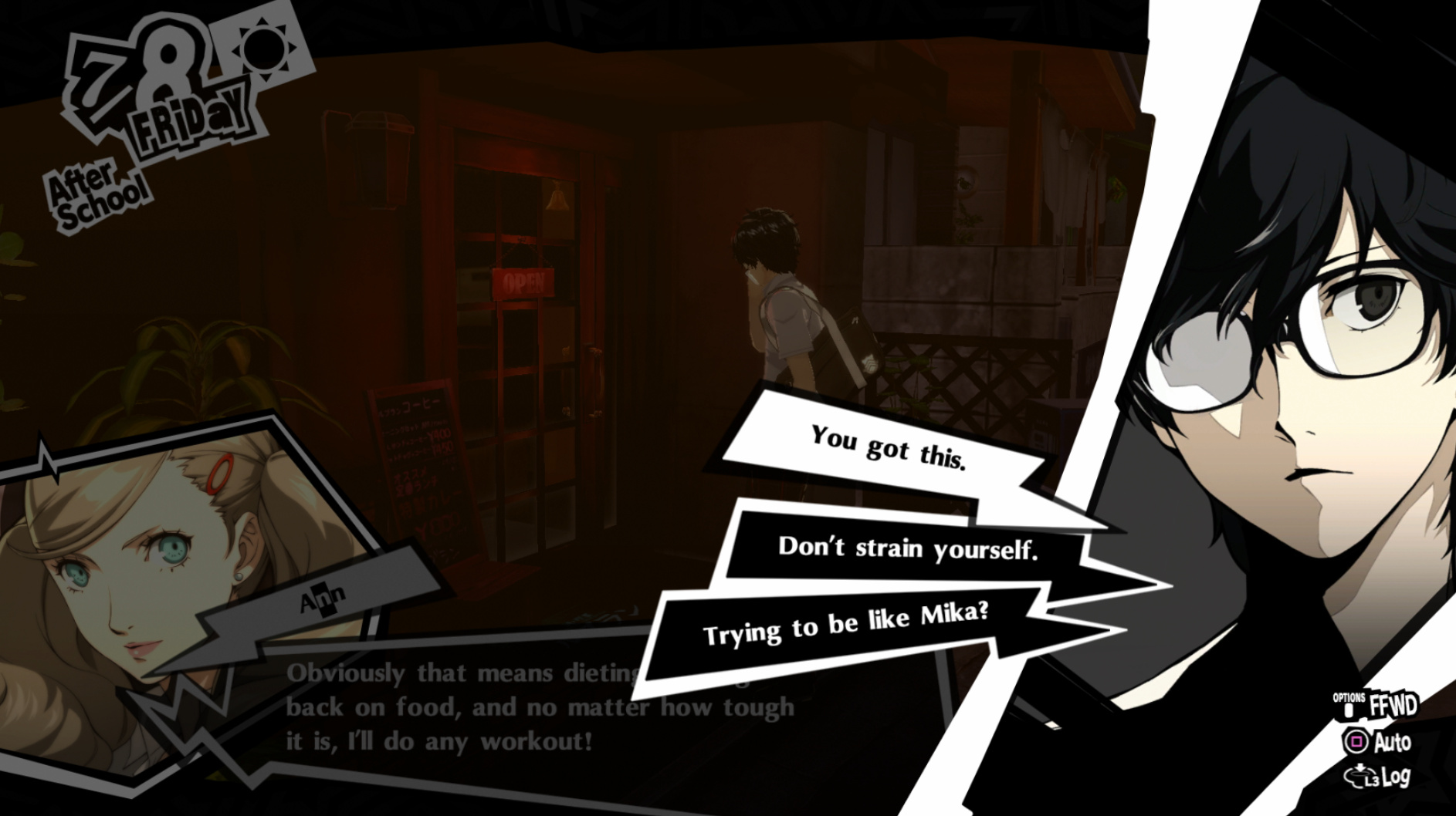 : Joker tries to figure out the best way to signal Ann to turn off speakerphone so he can tell them not to let her know he brings Morgana to his exams.