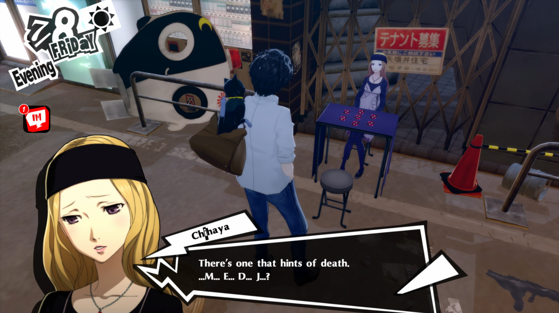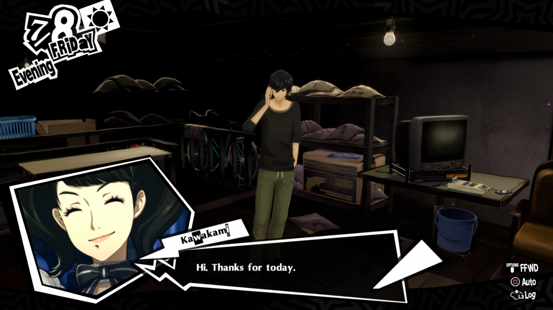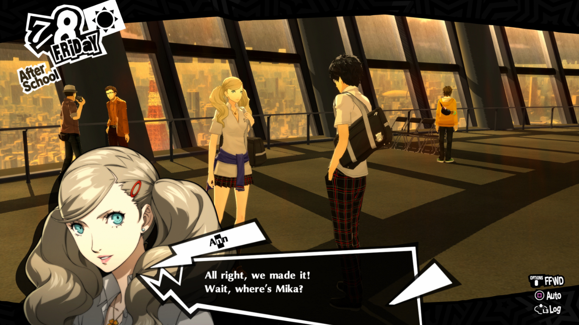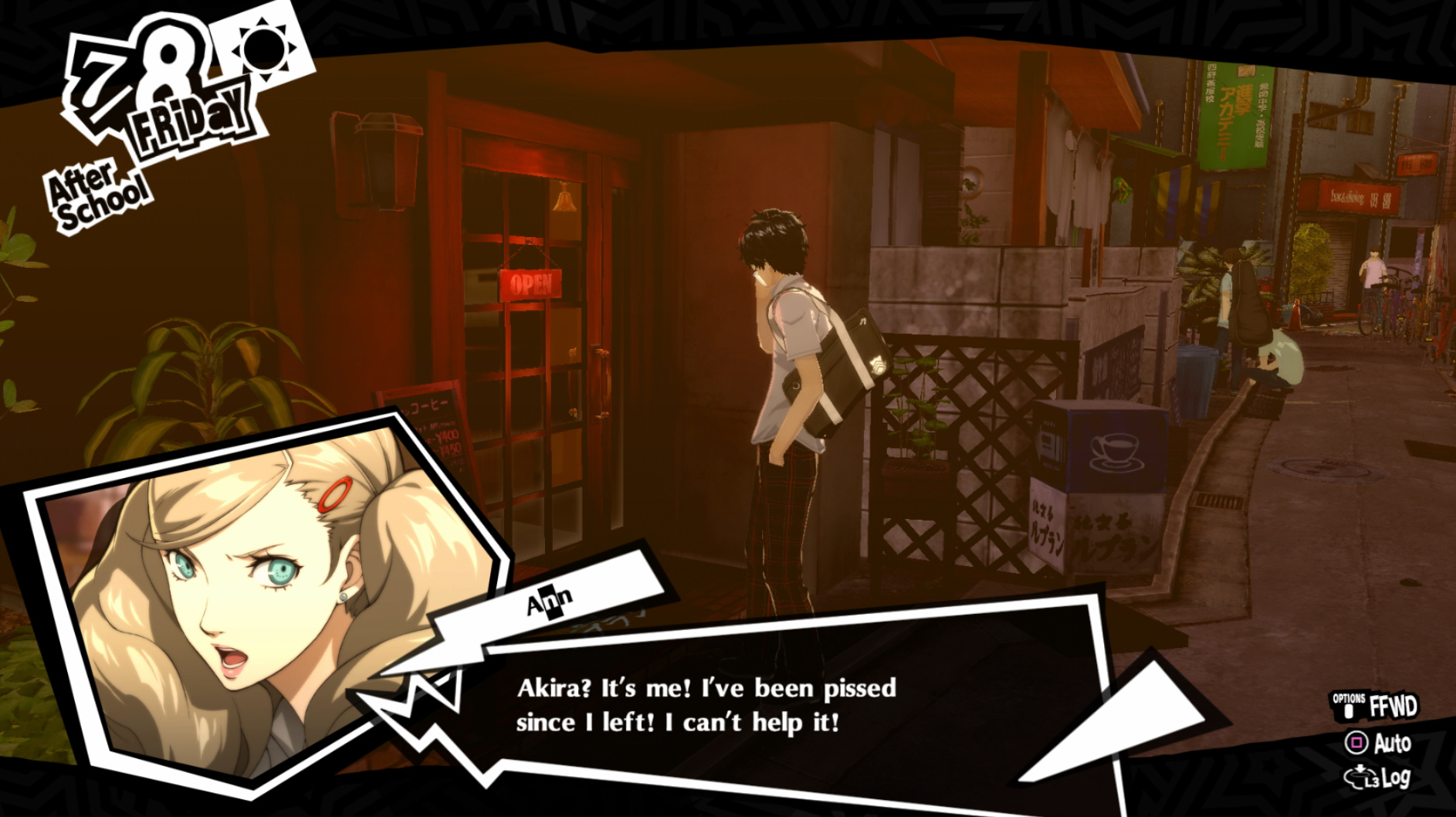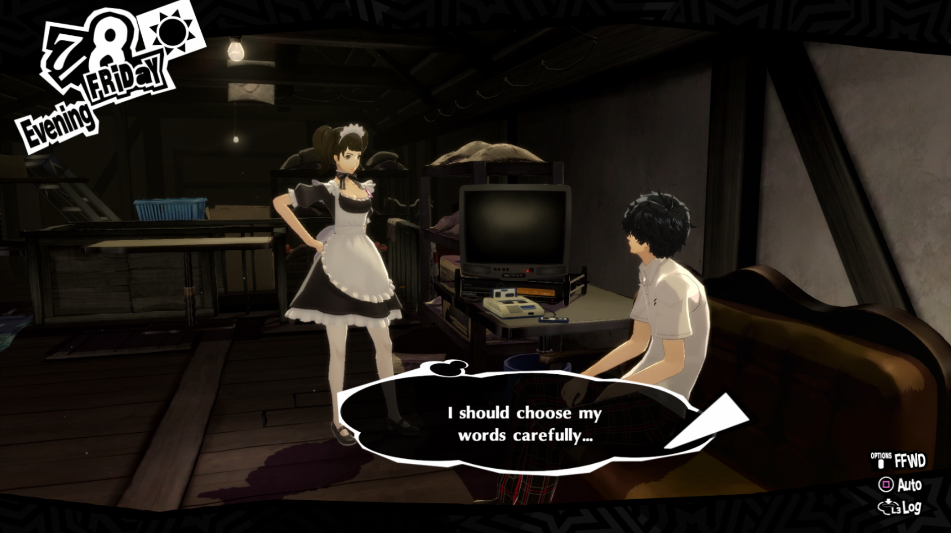 : Joker tries to figure out the best way to signal Ann to turn off speakerphone so he can tell them not to let her know he brings Morgana to his exams.