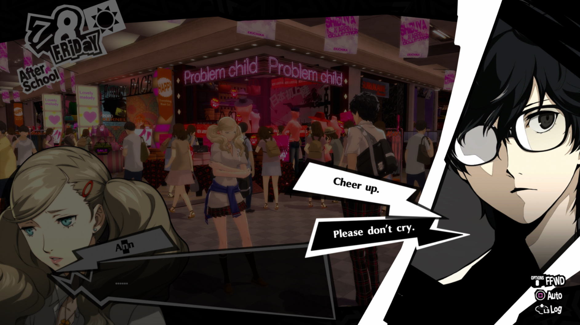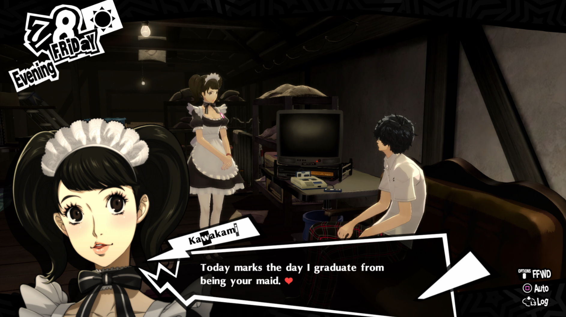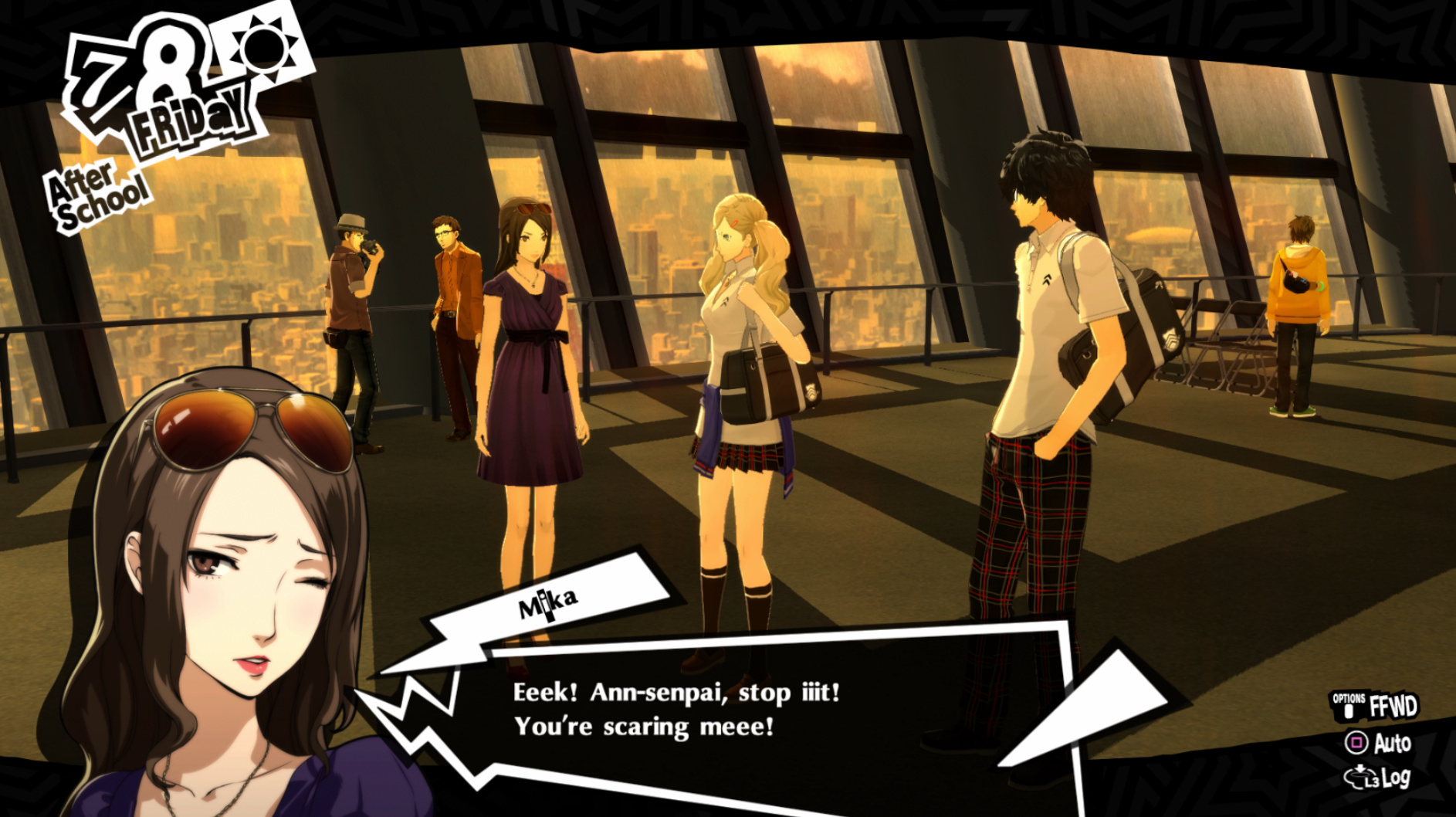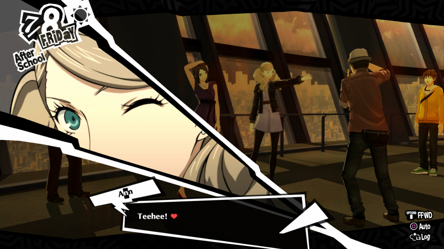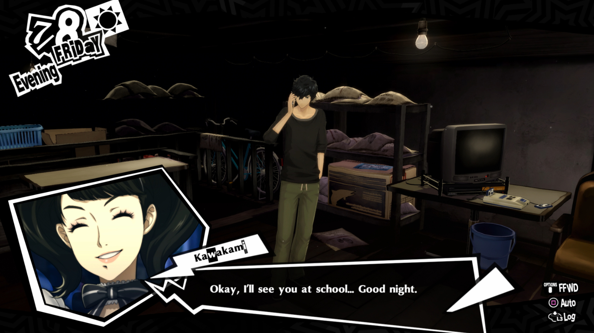 : Joker tries to figure out the best way to signal Ann to turn off speakerphone so he can tell them not to let her know he brings Morgana to his exams.