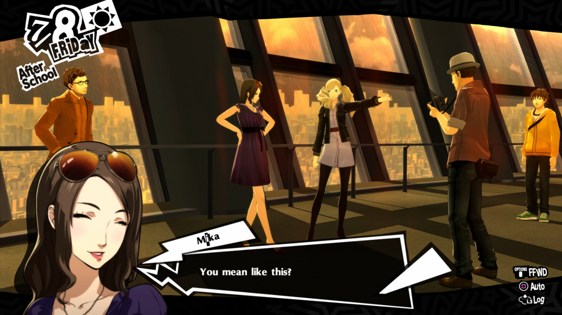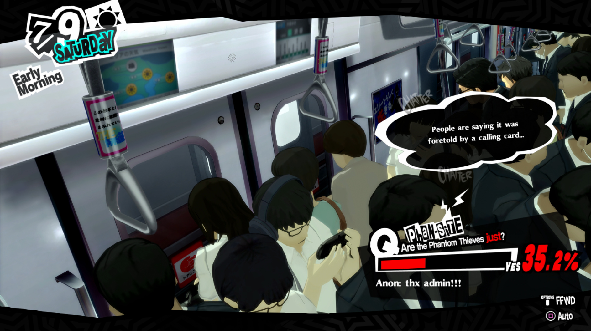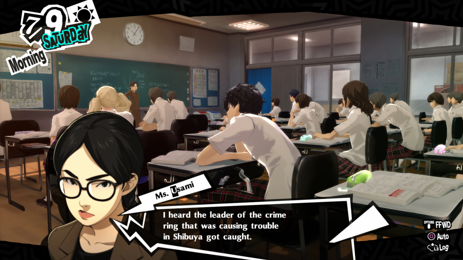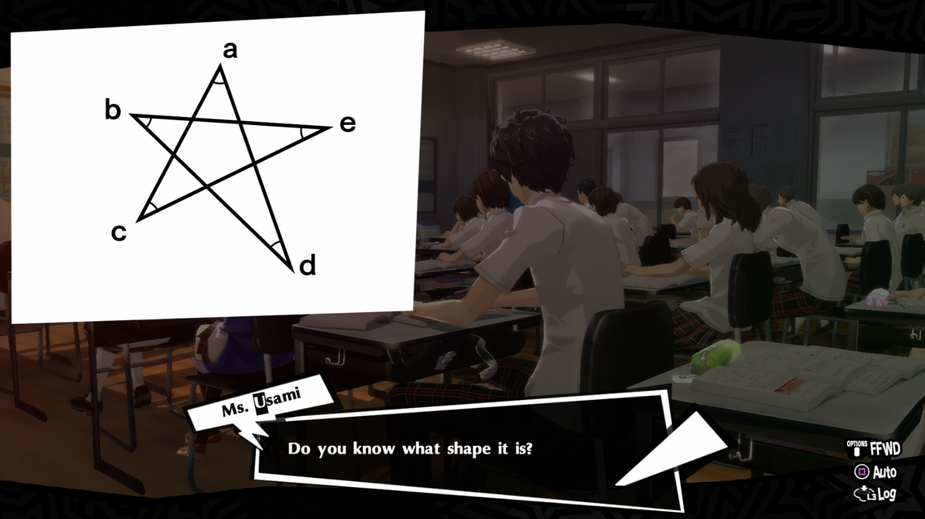 : Joker tries to figure out the best way to signal Ann to turn off speakerphone so he can tell them not to let her know he brings Morgana to his exams.