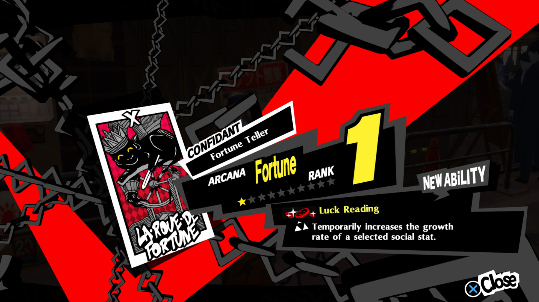 : The guide I’m using doesn’t tell you to do this, but I get a Luck Reading on Knowledge. The reason for this is that most visits we’re going to make to this new confidant get us two points to Knowledge.