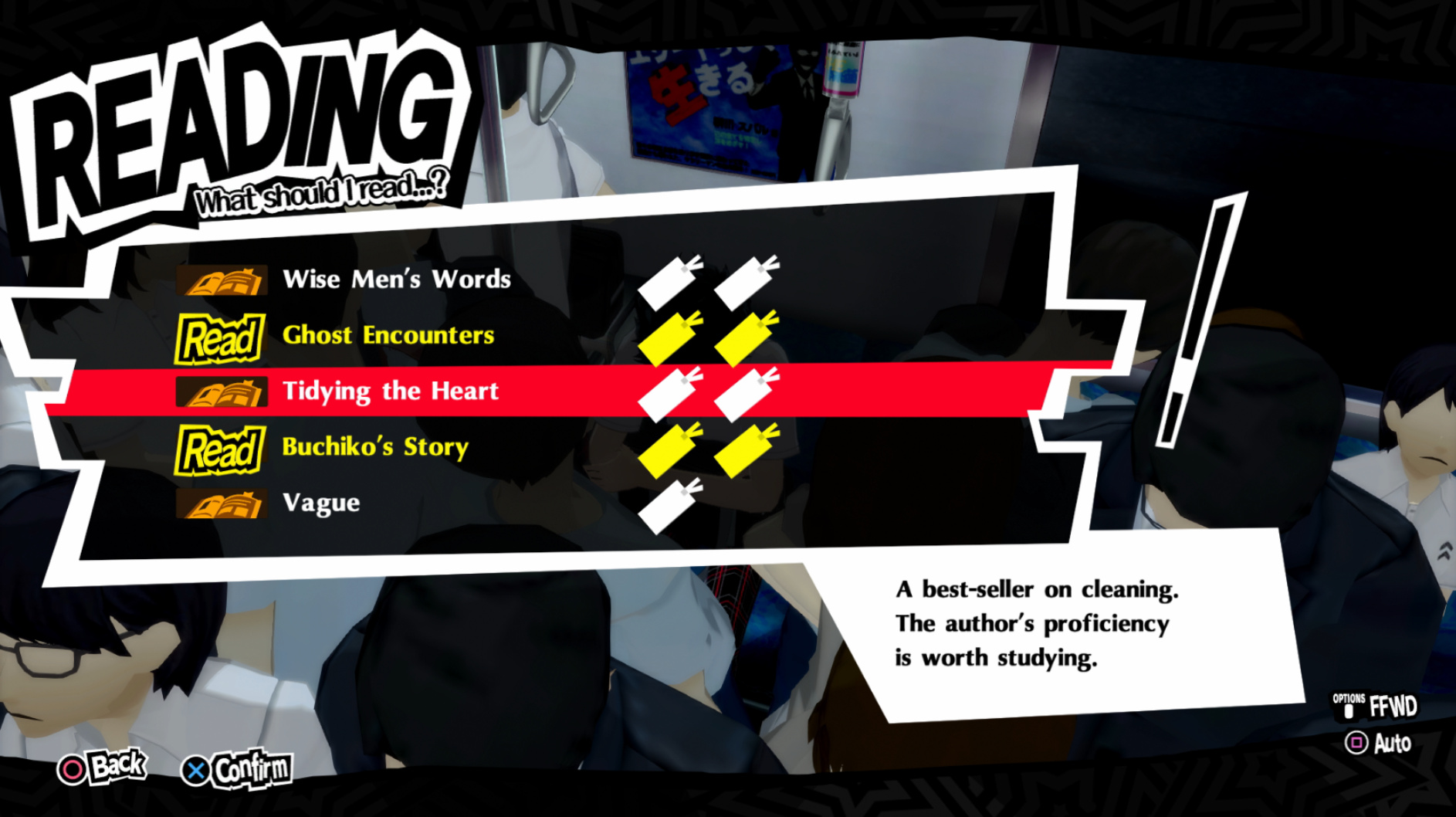 : Instead of reading the book we just got from the library, we’re instead going to read a blatant reference to Marie Kondo. This book was in the base game, but I didn’t recognize the reference at the time because no one outside of Japan knew who she was.