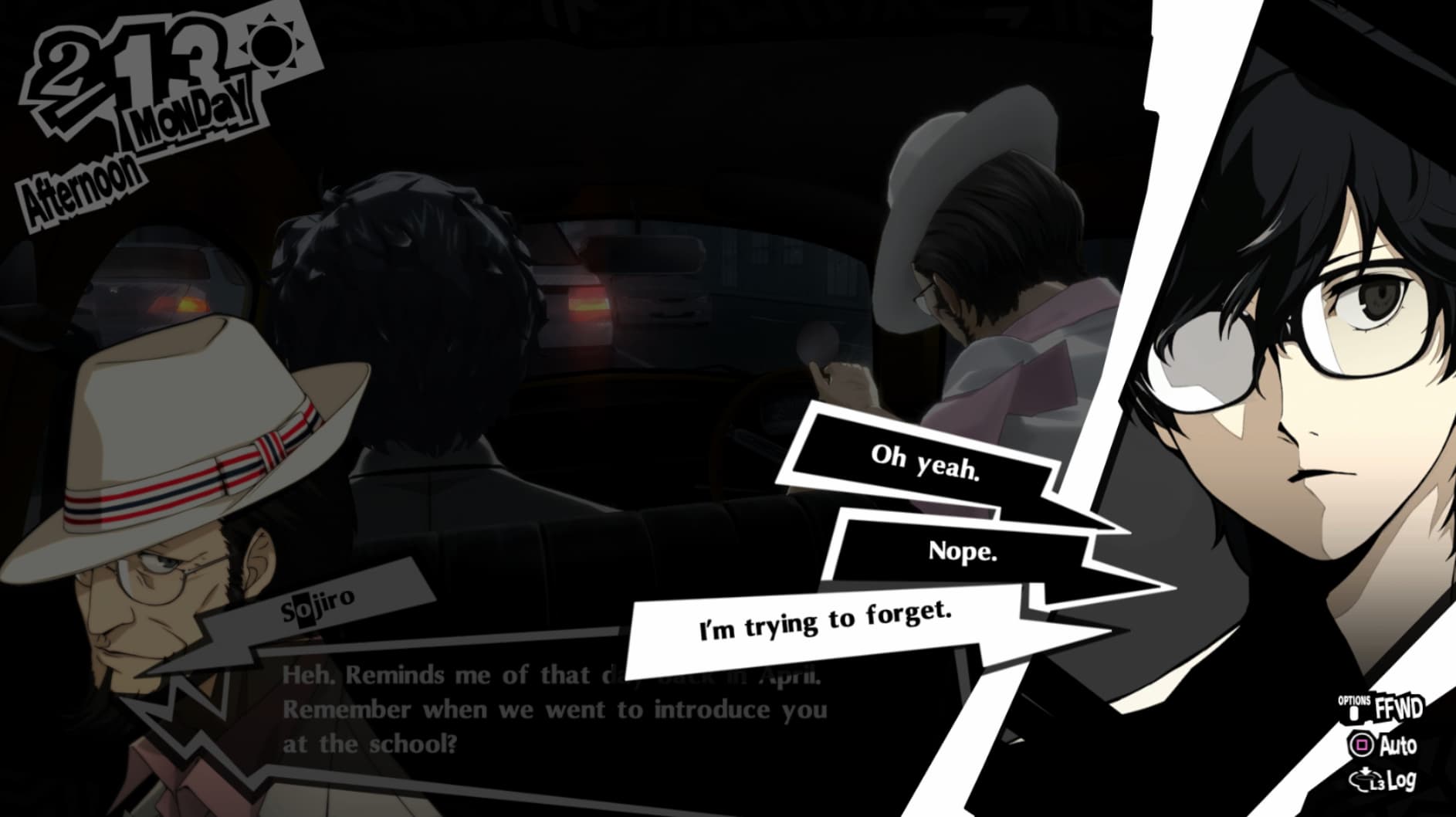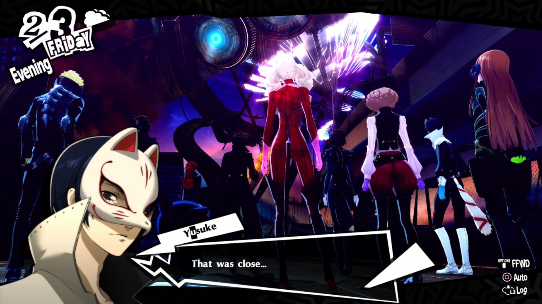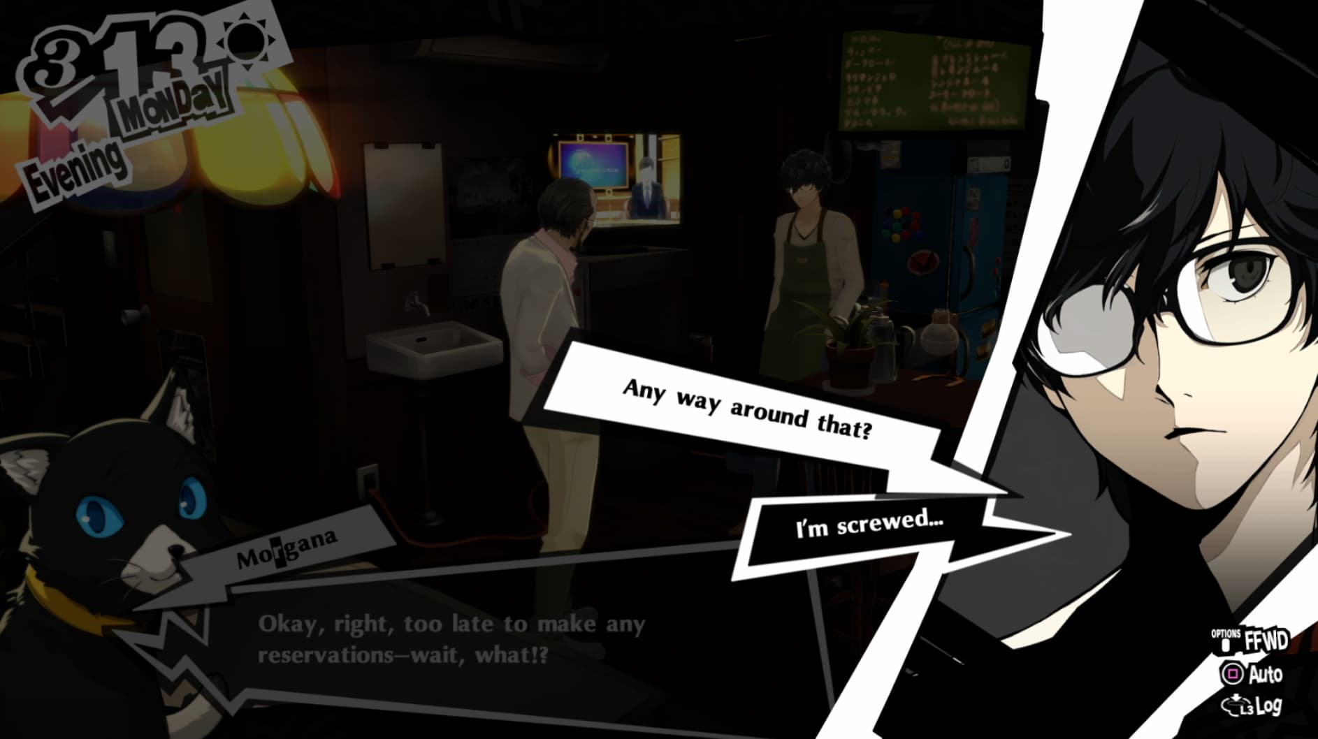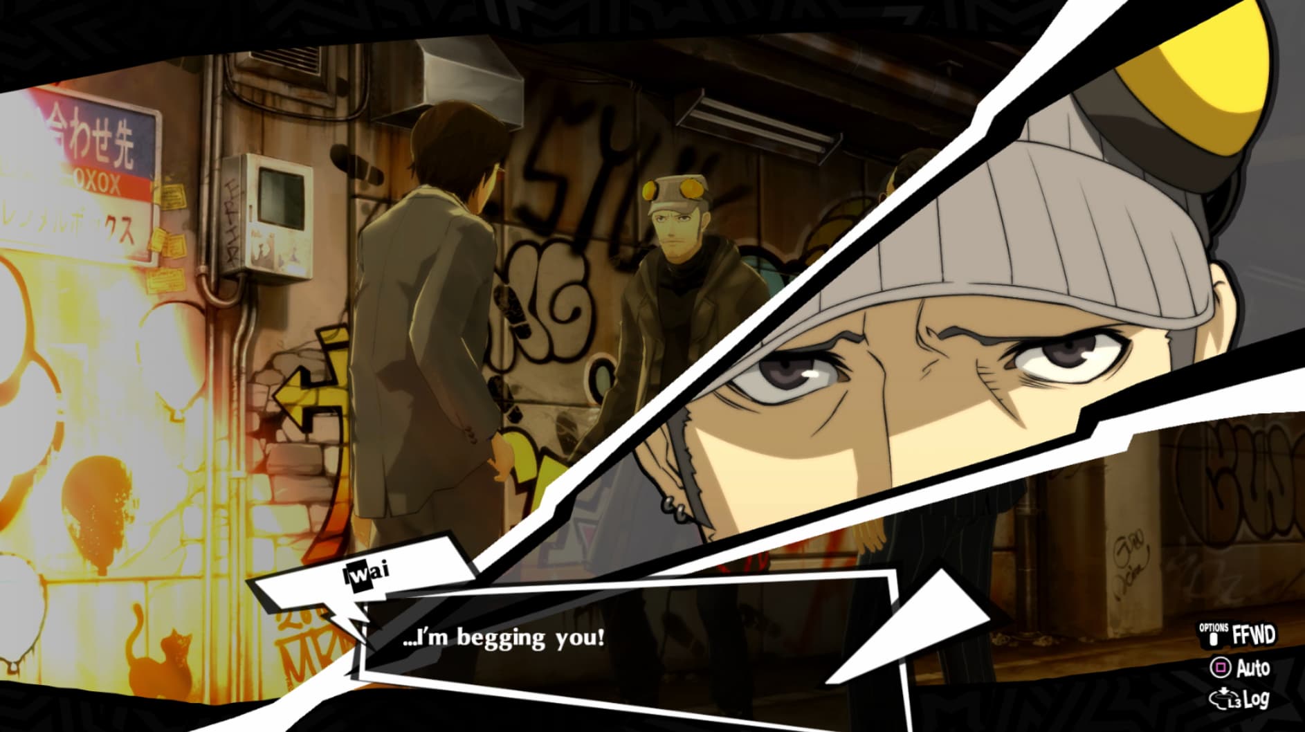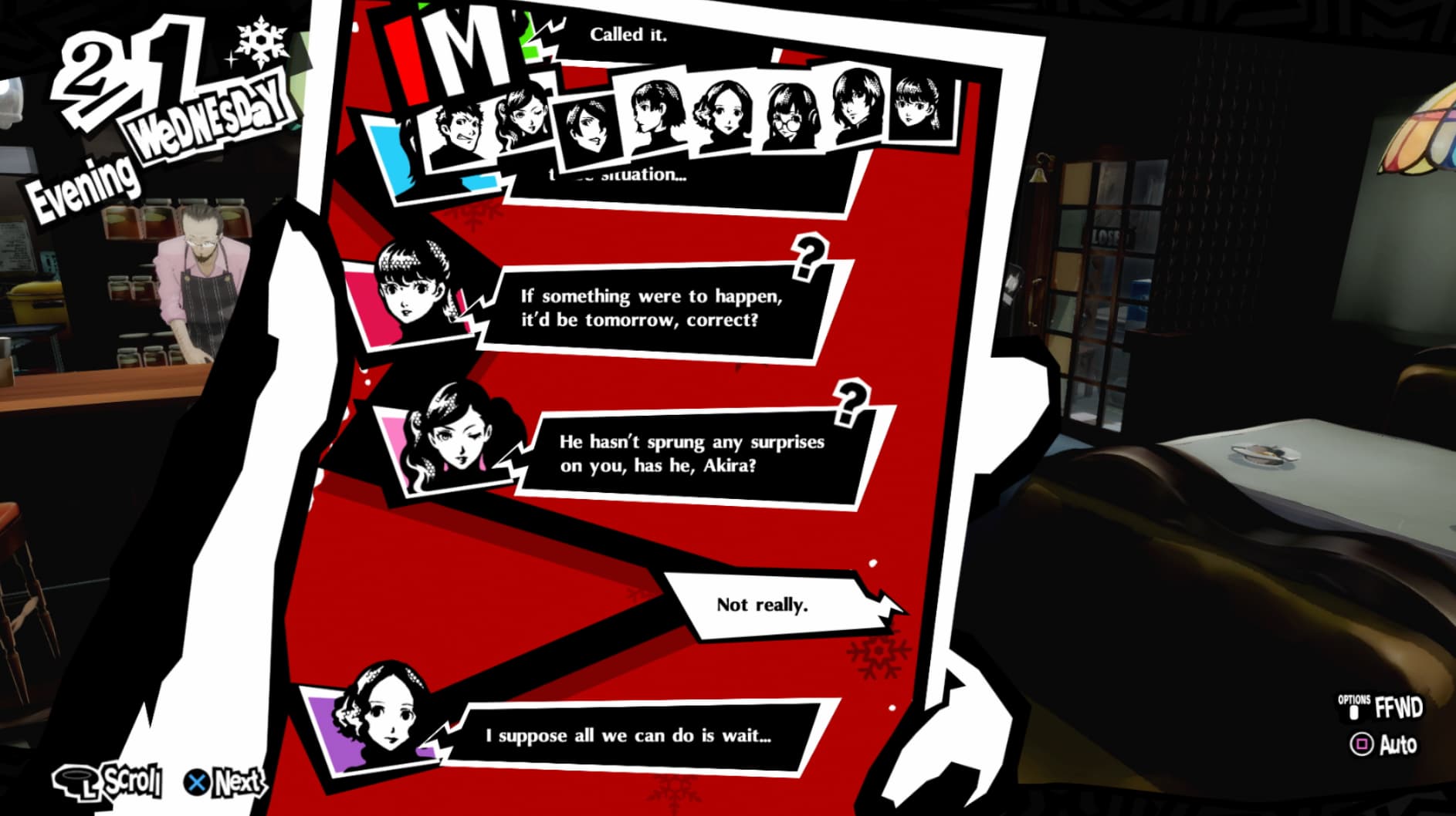 : You can see the black suits chasing the van, when they could pretty clearly see Joker get in the taxi. This entire ending is about as coherent as Futaba’s post-Casino bit in the base game.