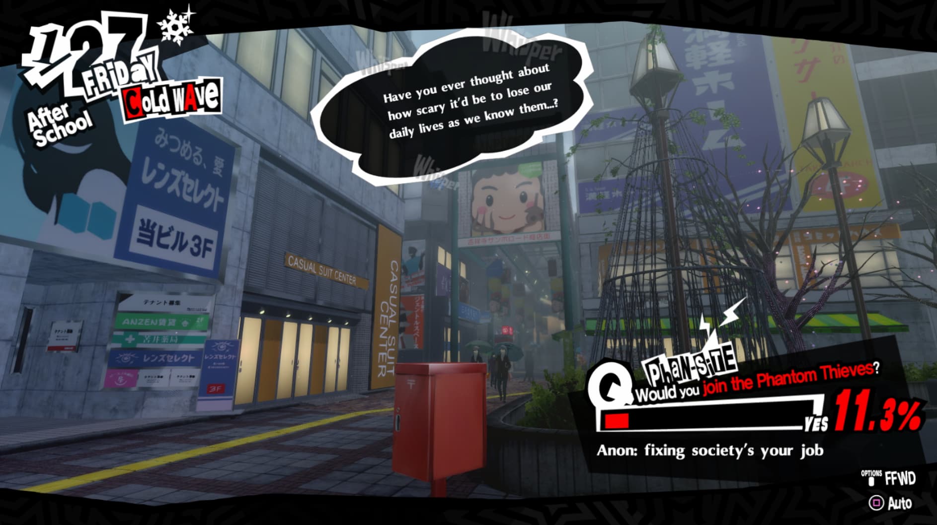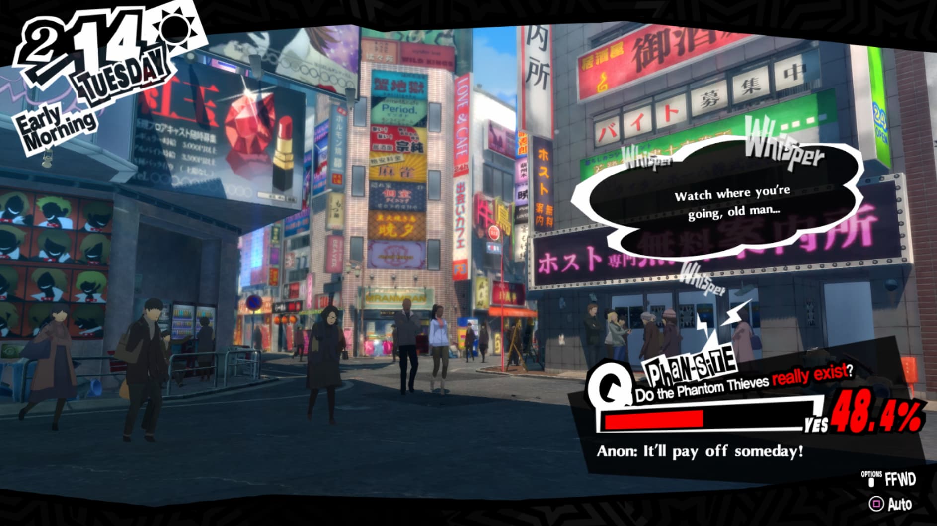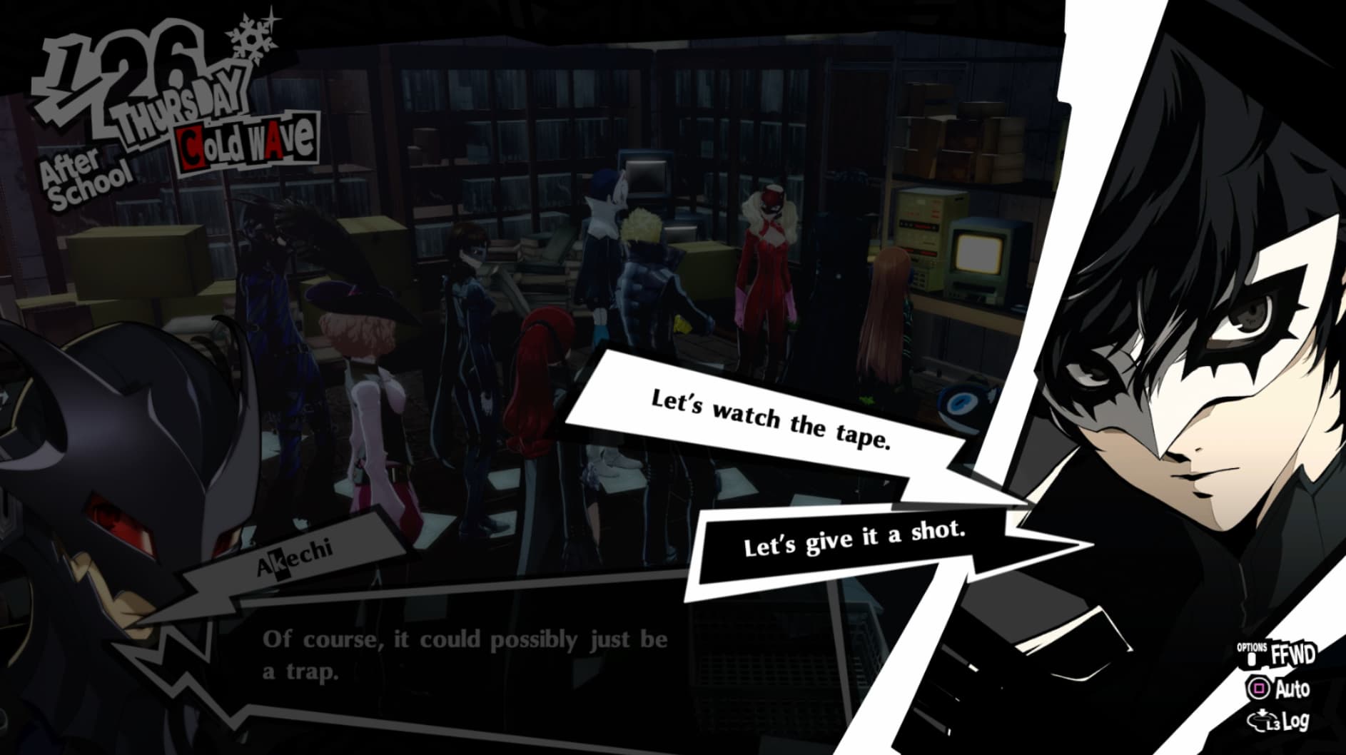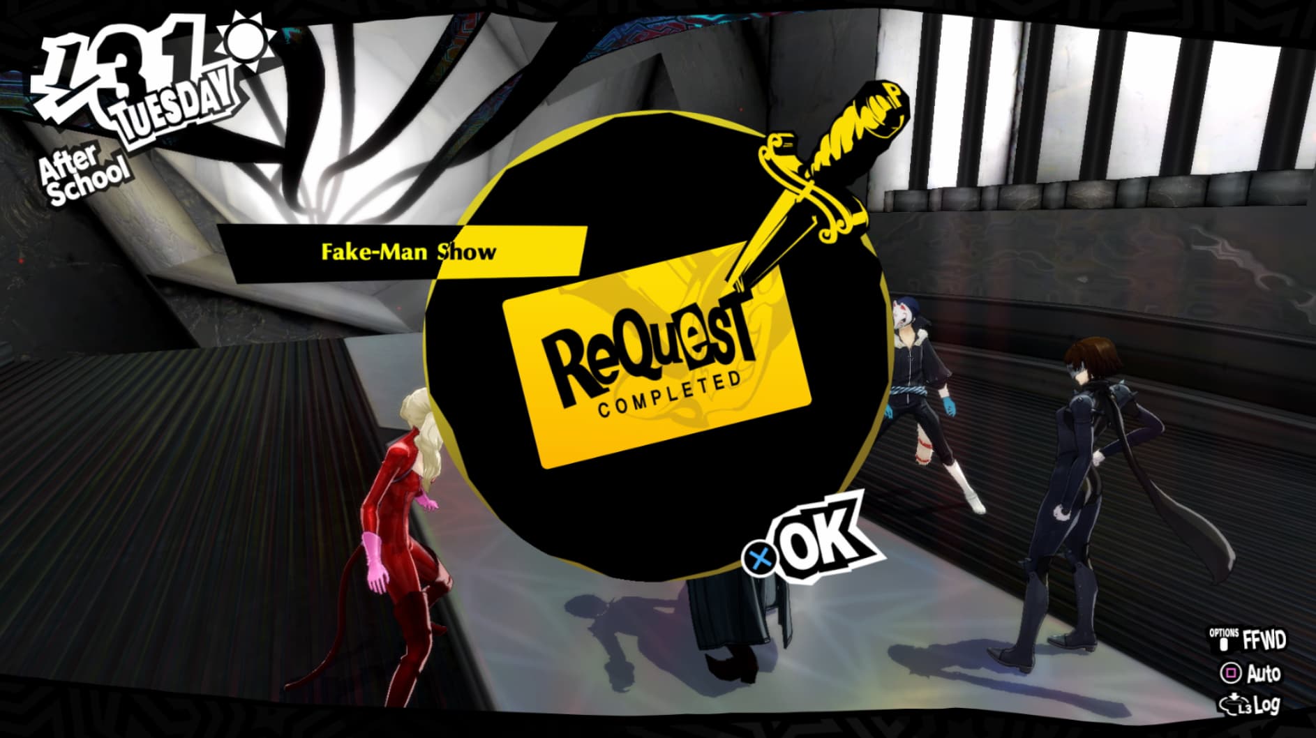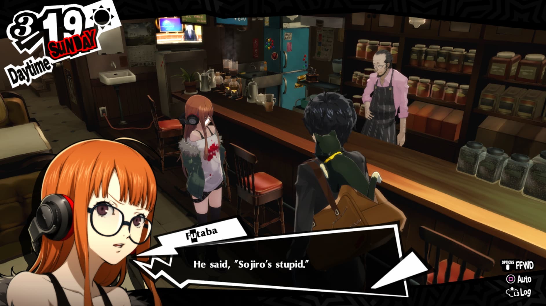 : You can see the black suits chasing the van, when they could pretty clearly see Joker get in the taxi. This entire ending is about as coherent as Futaba’s post-Casino bit in the base game.