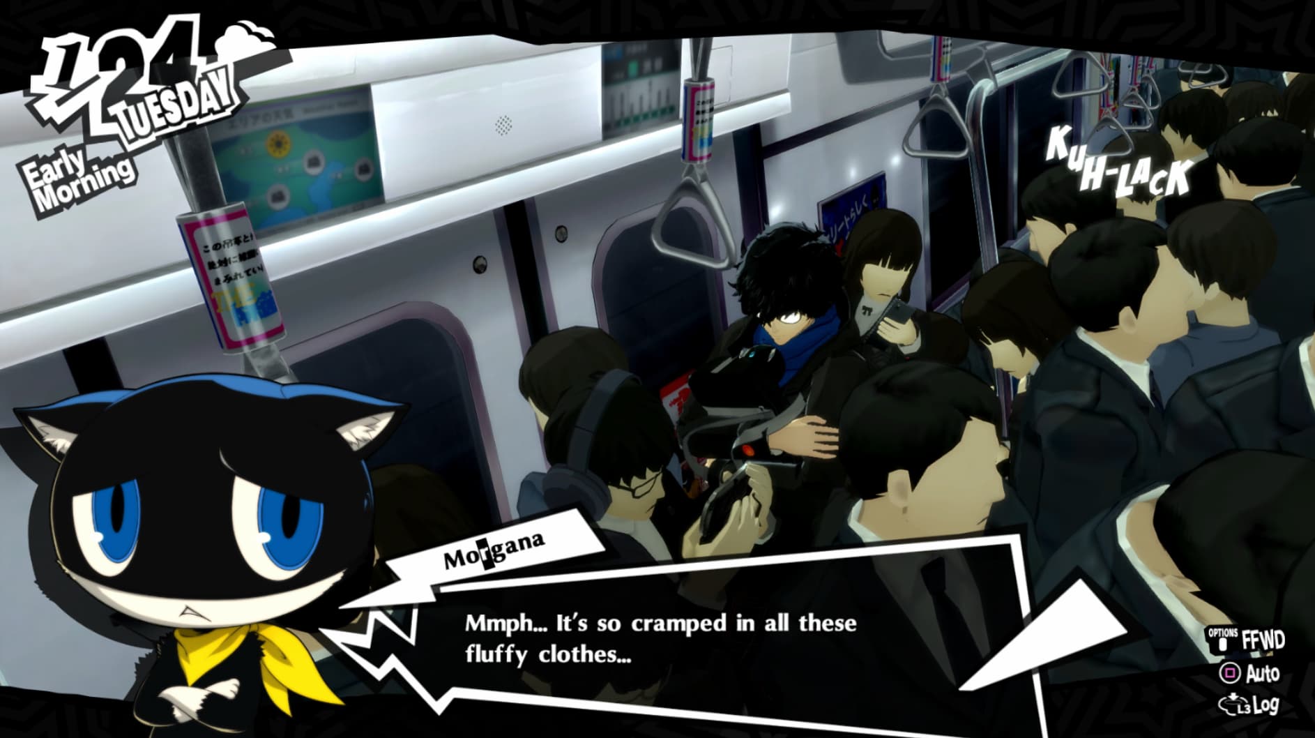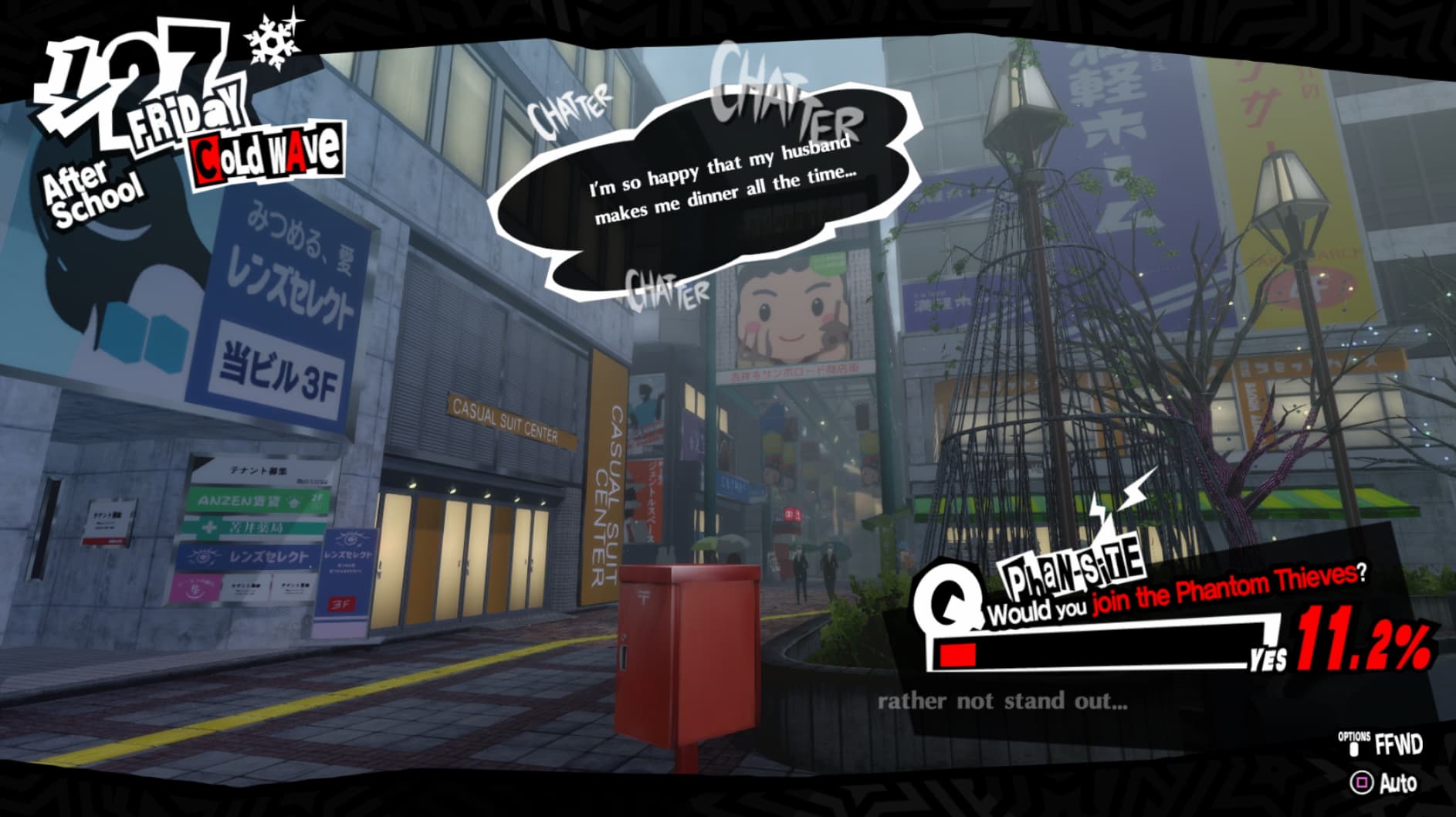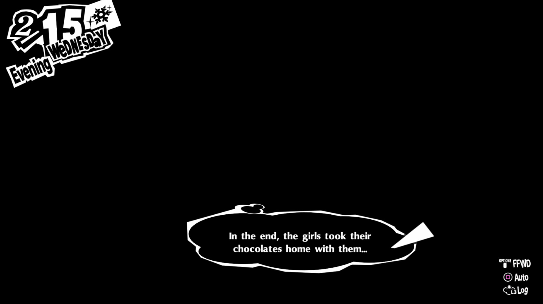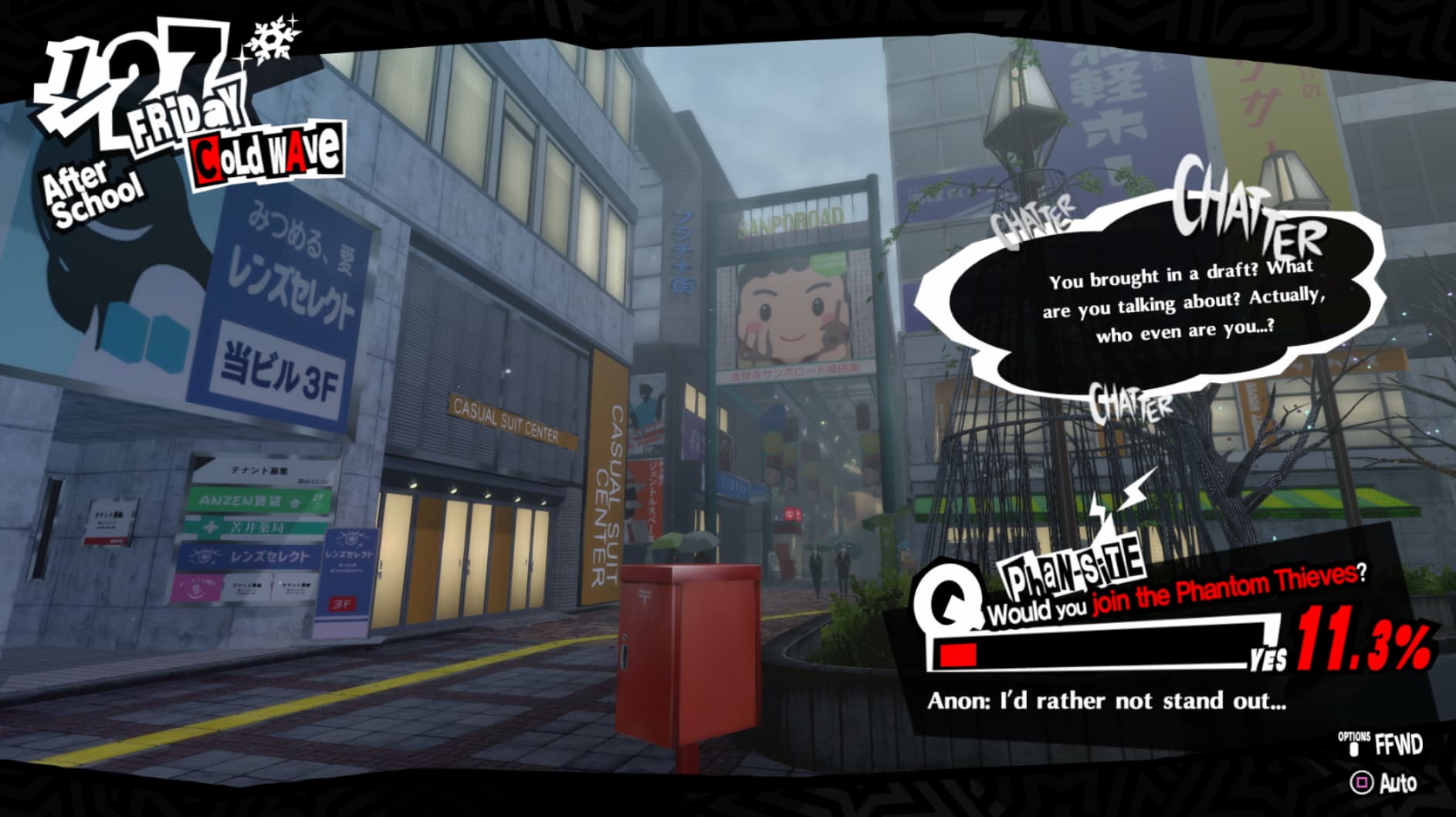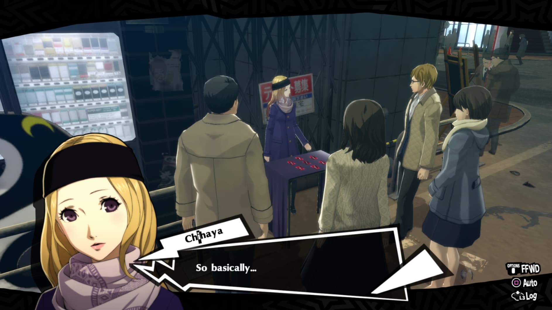 : You can see the black suits chasing the van, when they could pretty clearly see Joker get in the taxi. This entire ending is about as coherent as Futaba’s post-Casino bit in the base game.