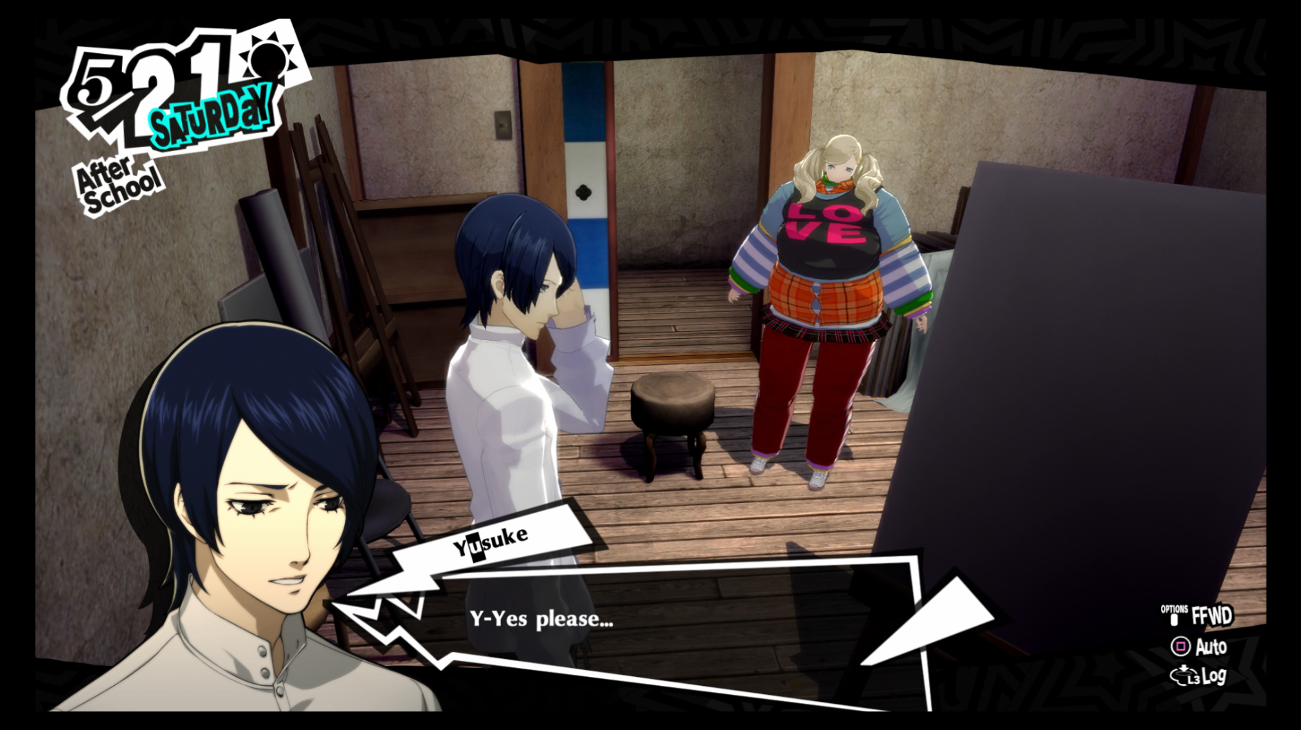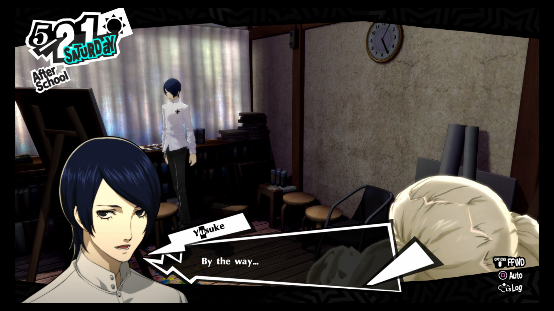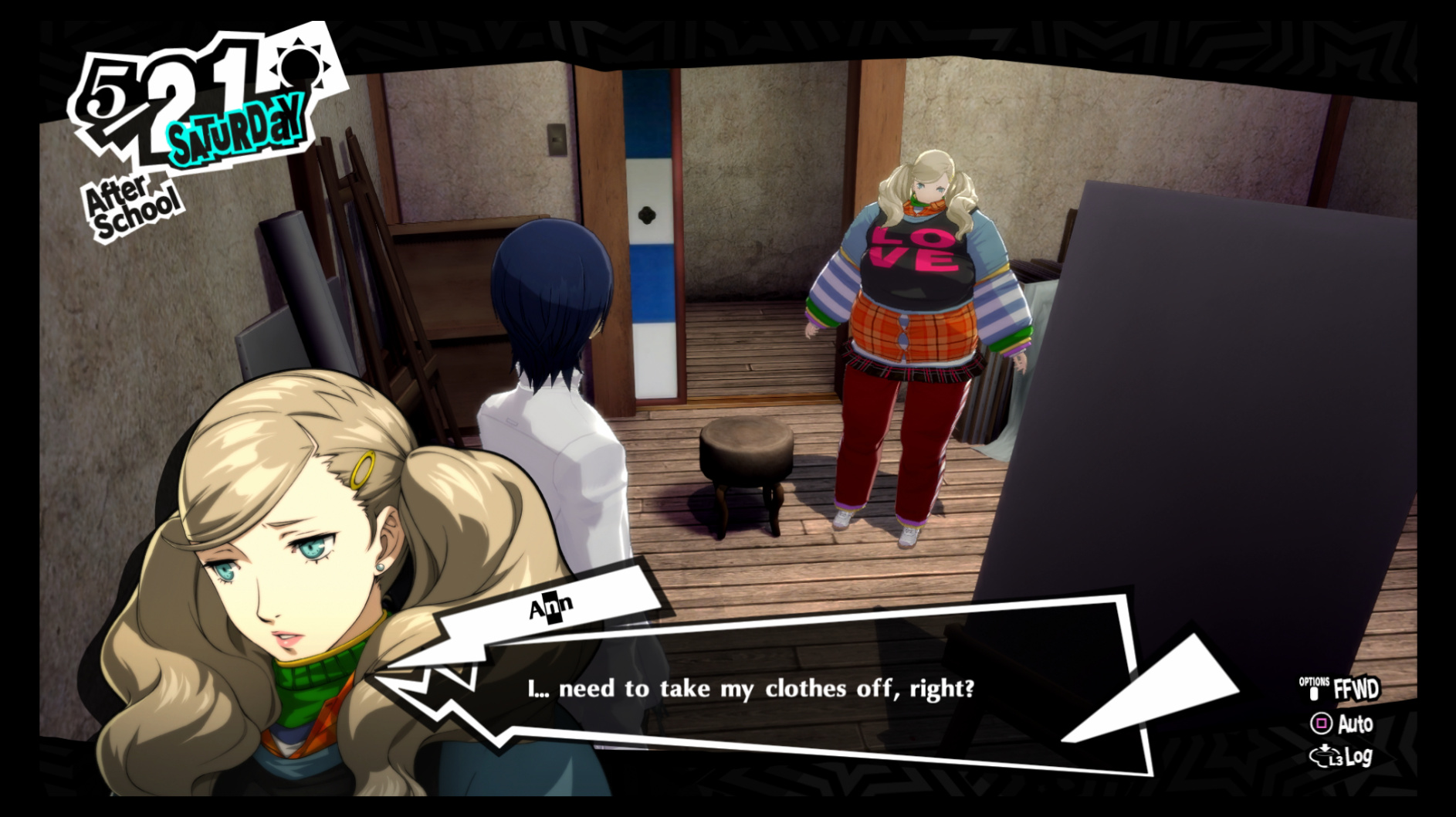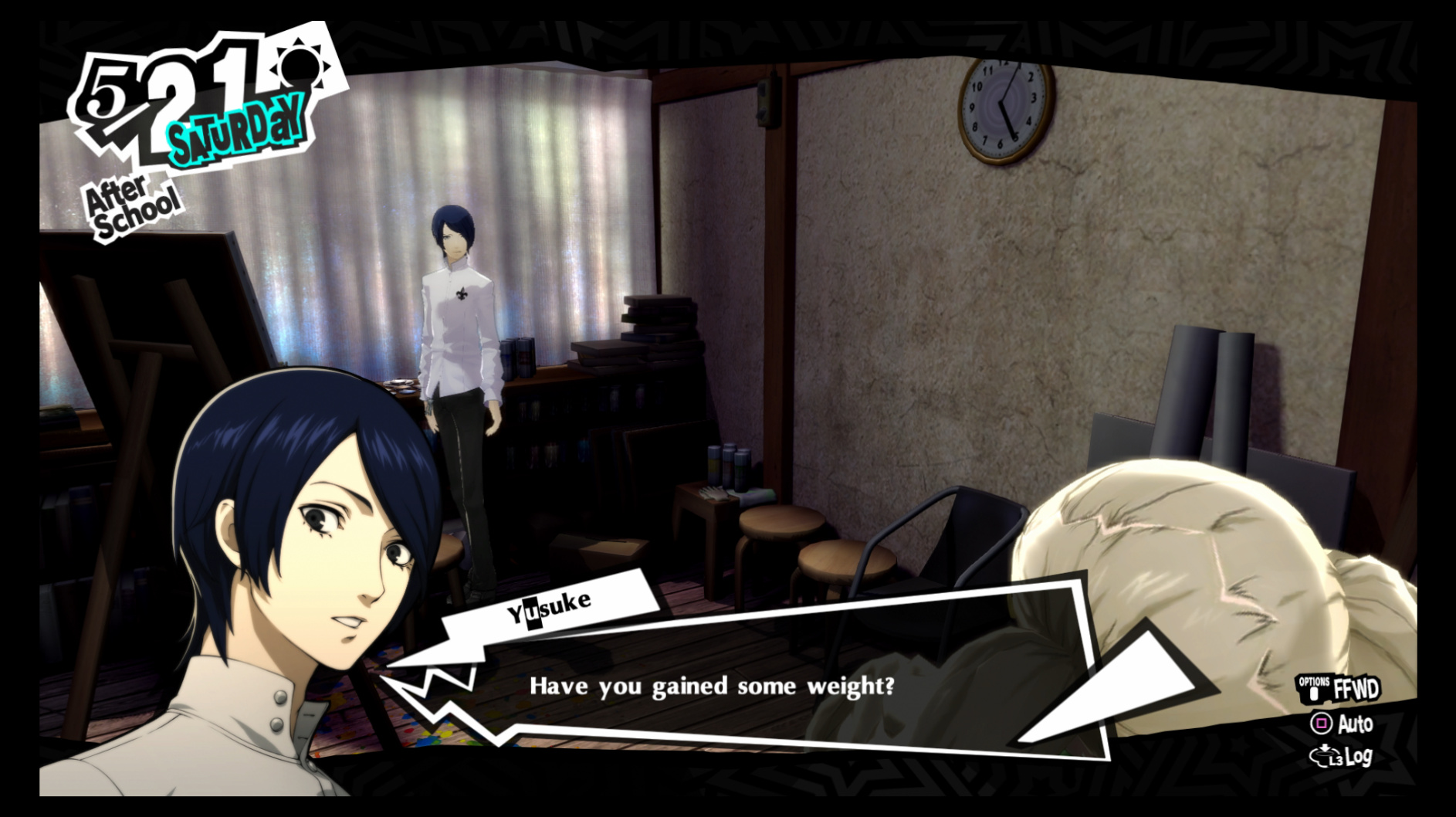 There’s something implicitly gross about forcing the girl who has had to deal with sexual abuse to pose nude. Something about it just feels inherently kinda gross. If I had to rewrite it and keep this arbitrary time limit, I’d have it be Joker who is the nude subject (because it’ll set up for some nice drama in their Support and also help with the implying of our artist friend being gay).