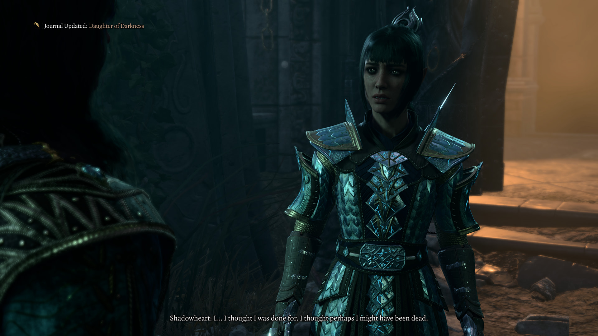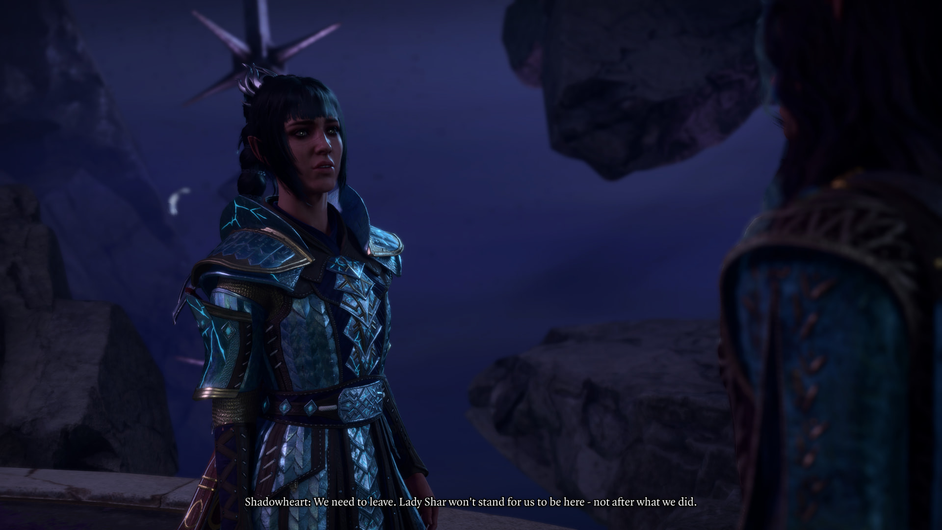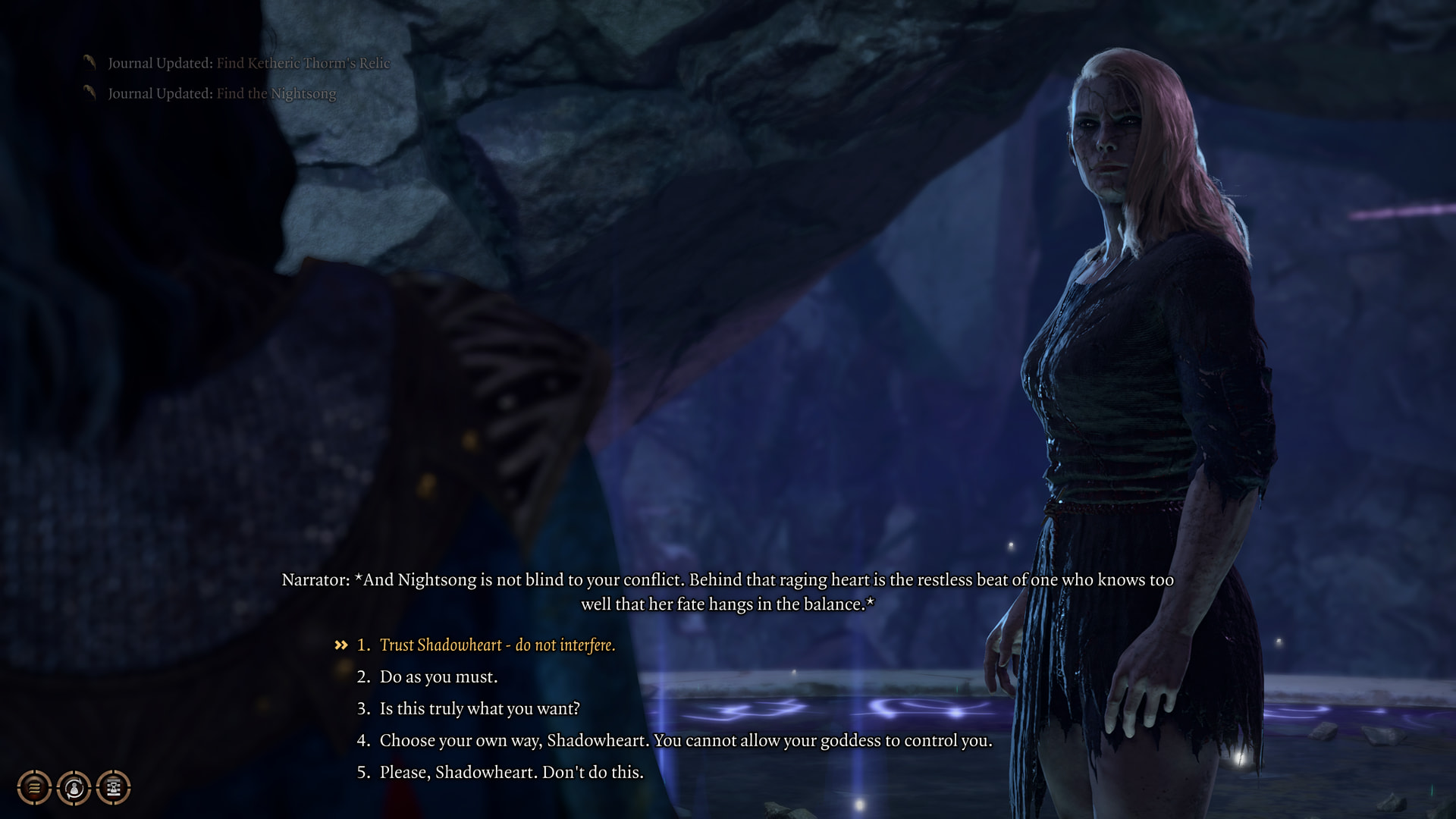Narrator: You feel Shadowheart bristling - this is important to her. But your bond is strong. You may yet be able to sway her from the path of duty to the path of light. And Nightsong is not blind to your conflict. Behind that raging heart is the restless beat of one who knows too well that her fate hangs in the balance.