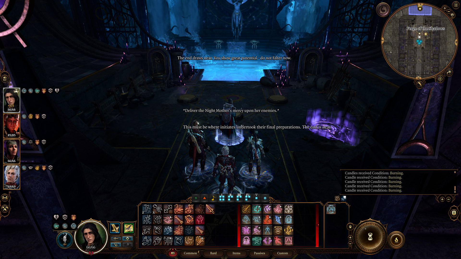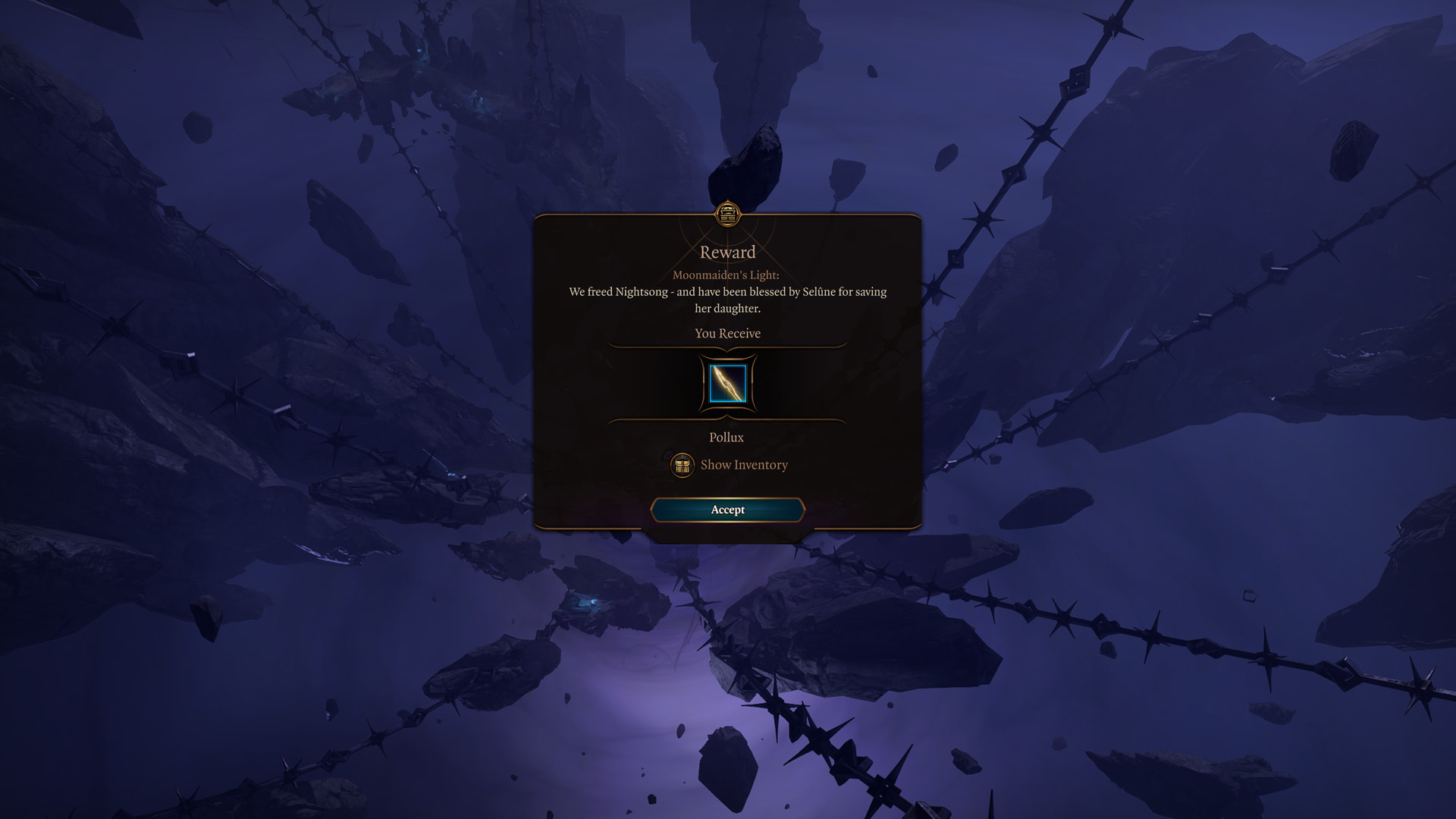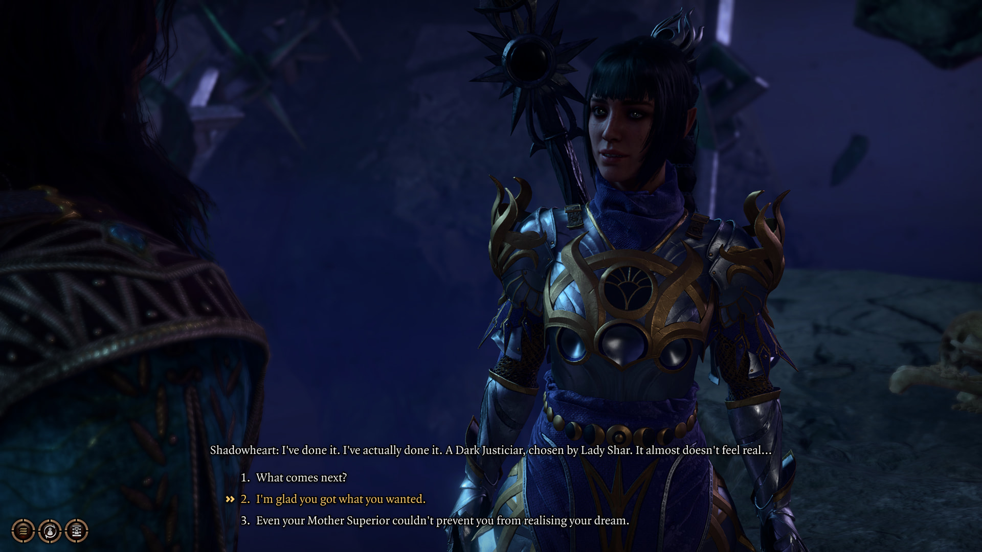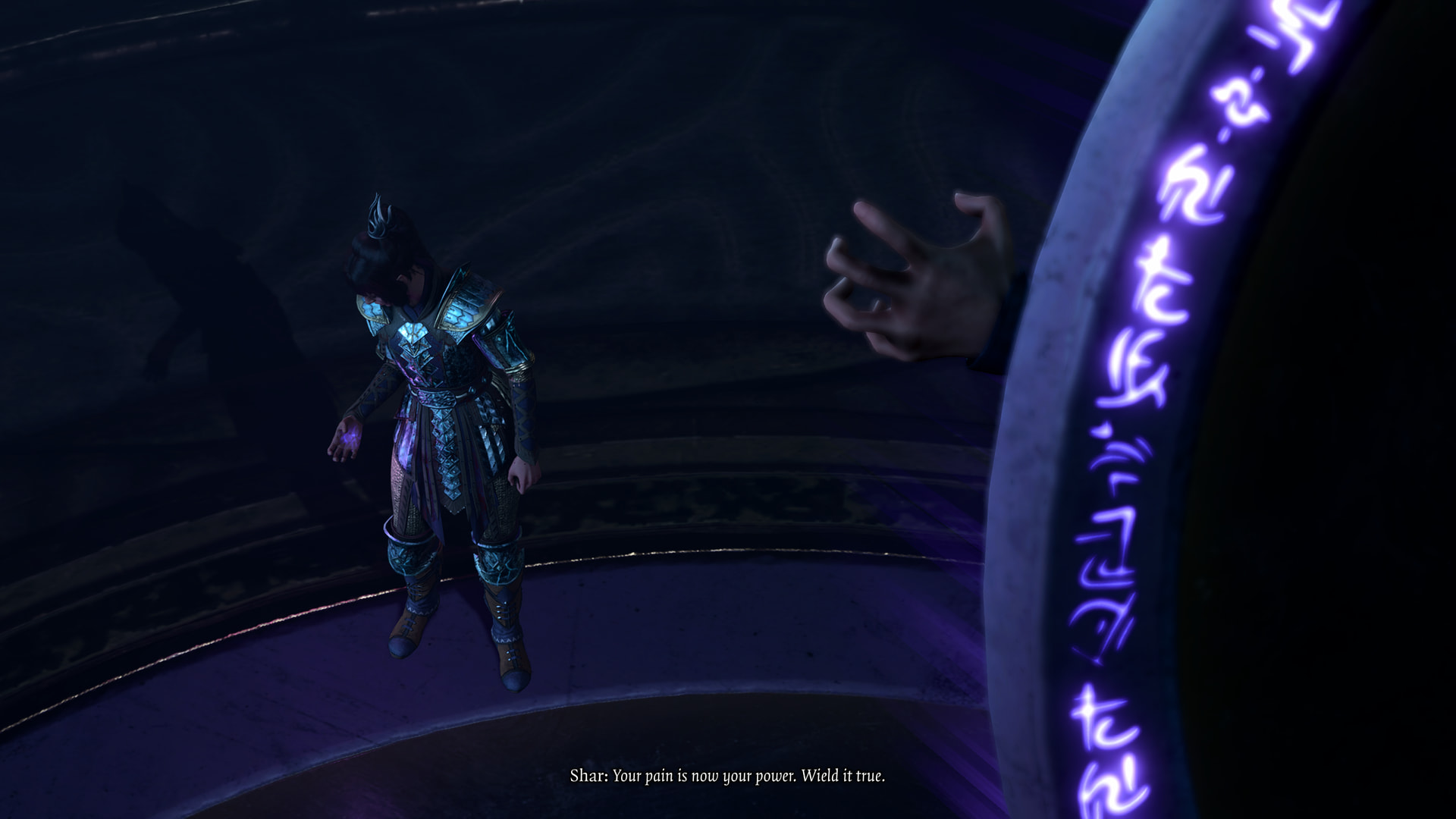 : “This must be the last step. I need to pray. Only by Lady Shar’s grace did we even make it this far.”Shar: “One more test awaits. Descend to the Nightsong. Make a sacrifice. Rise again a Dark Justiciar.”