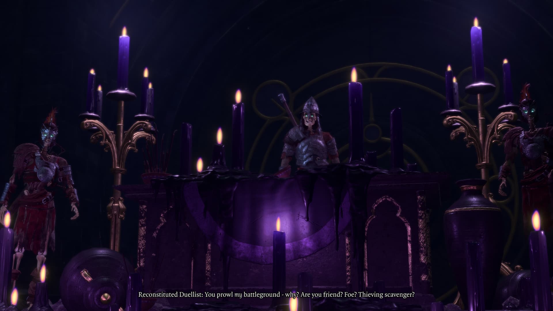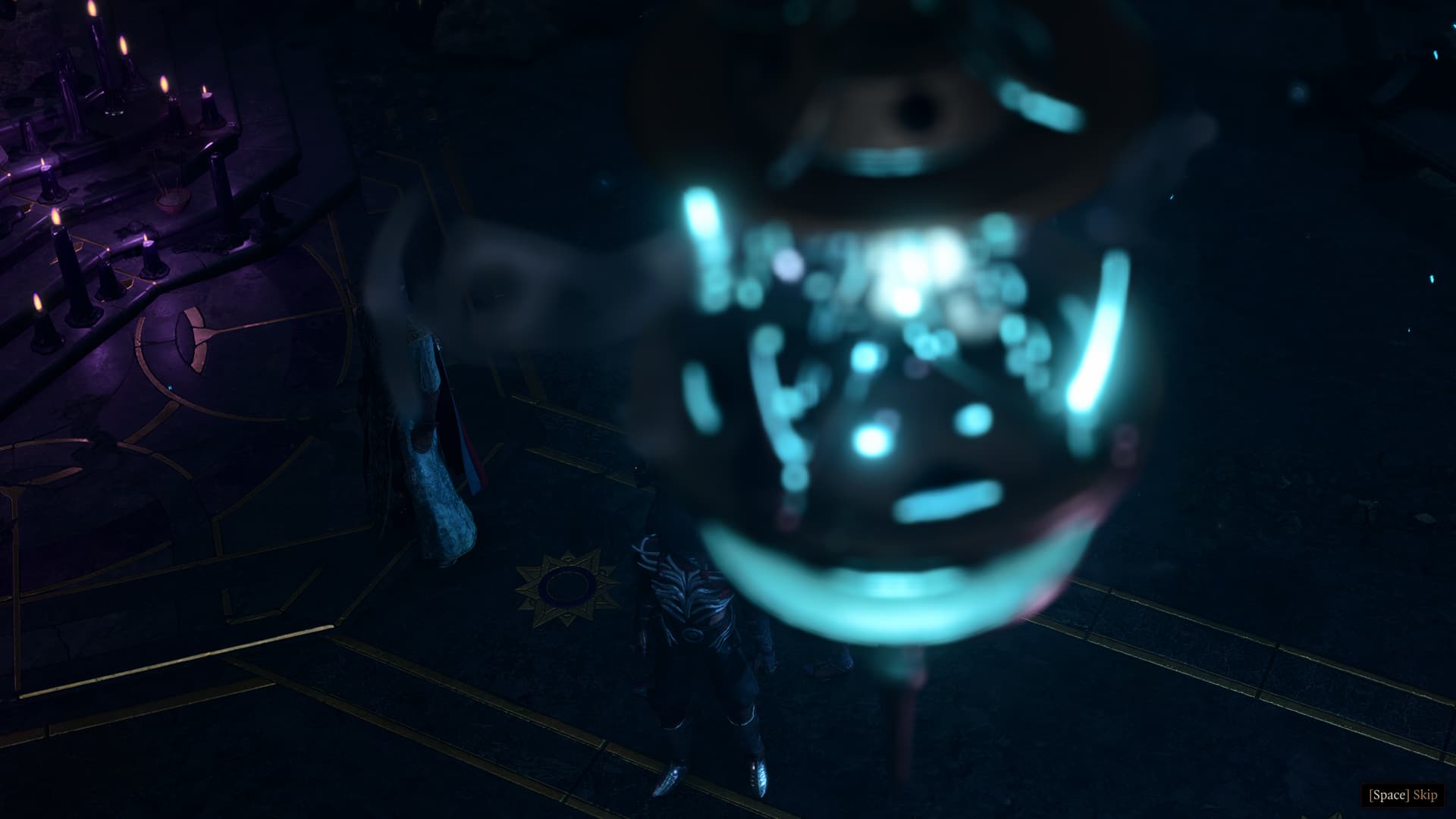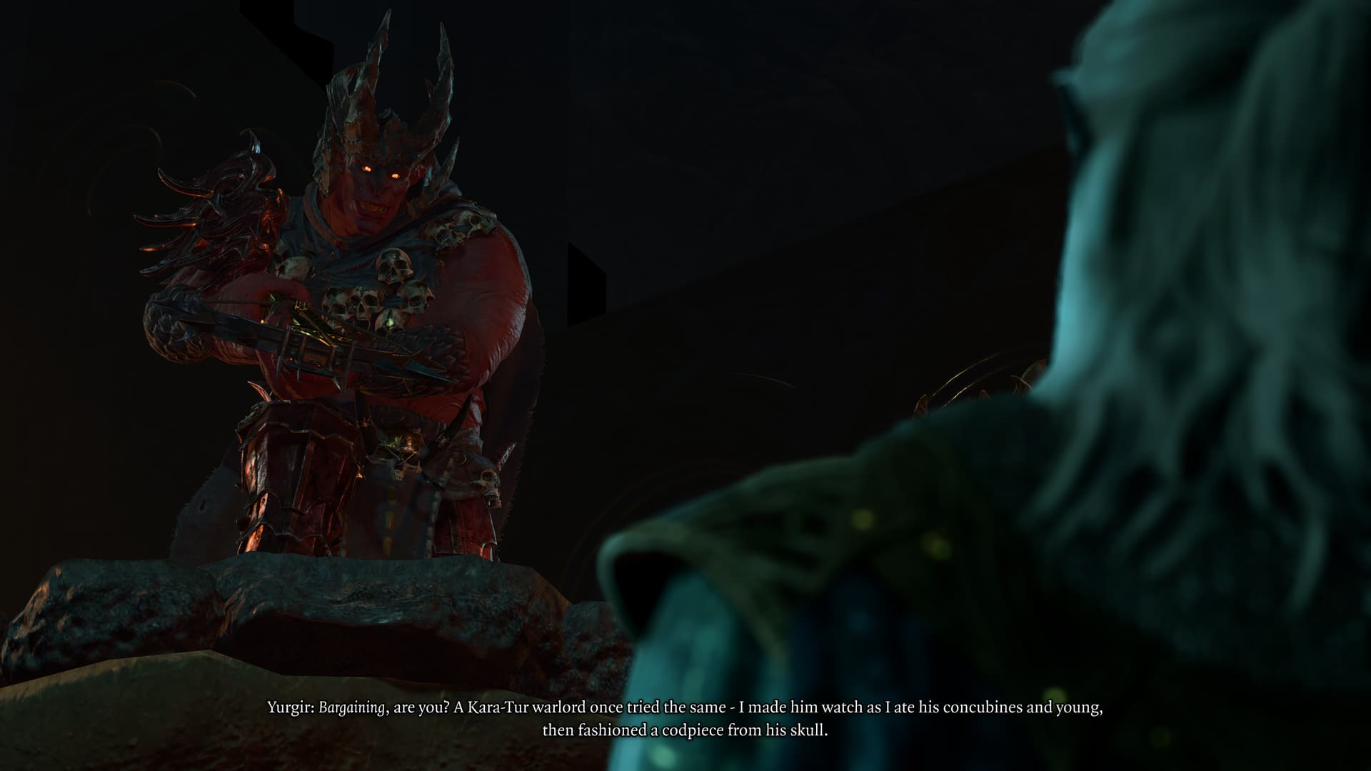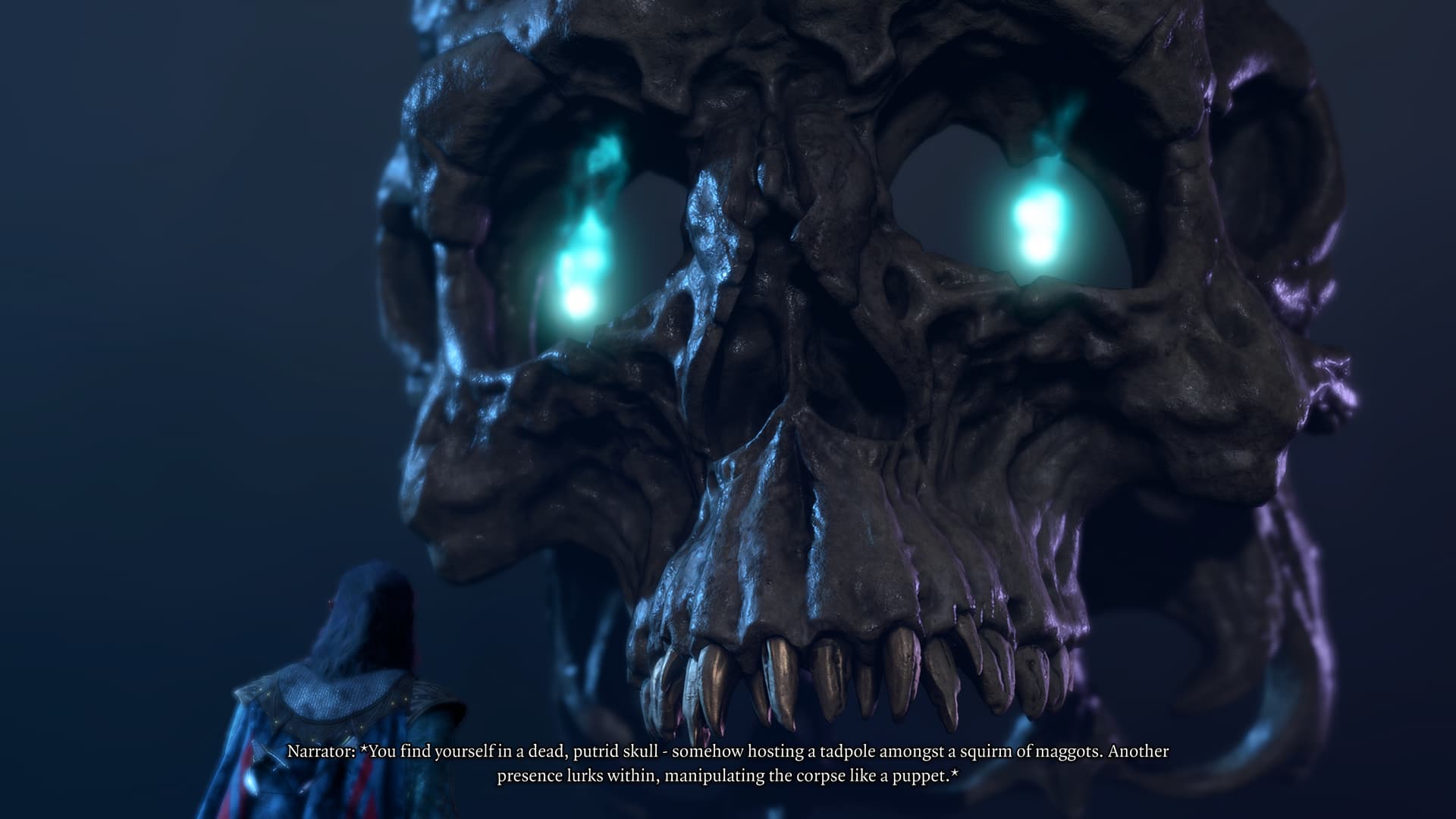 : “Ah. A friend - an uninvited friend. I did not request help.”Narrator: You find yourself in a dead, putrid skull - somehow hosting a tadpole amongst a squirm of maggots. Another presence lurks within, manipulating the corpse like a puppet.