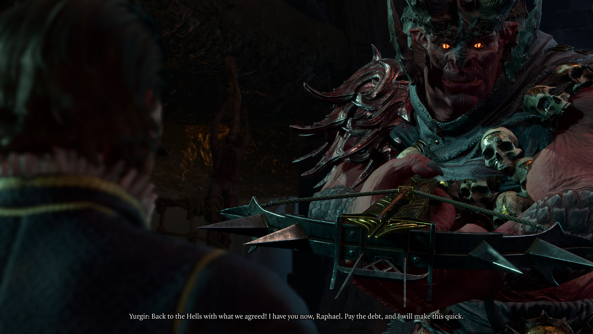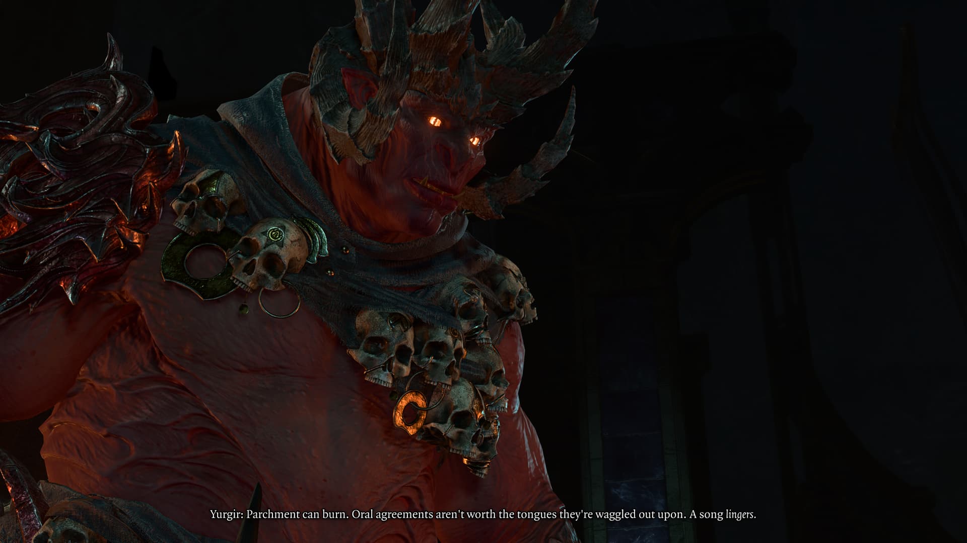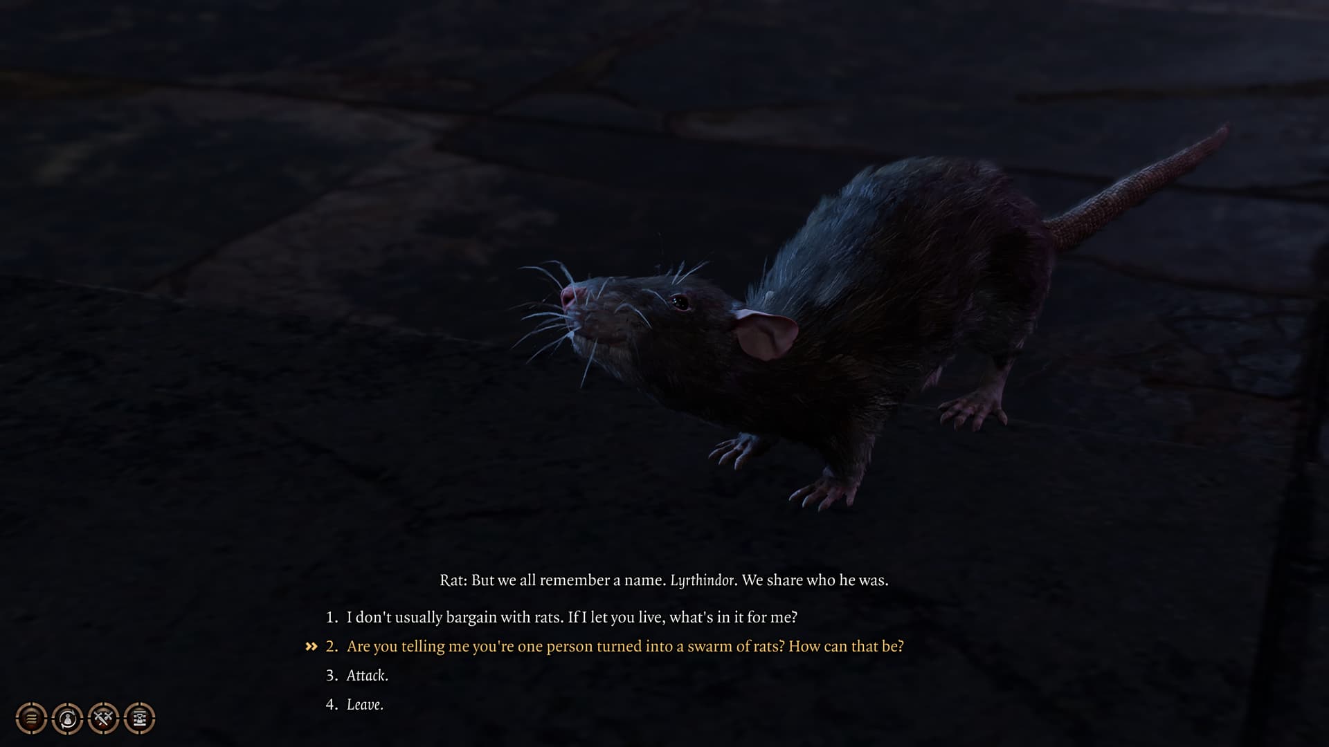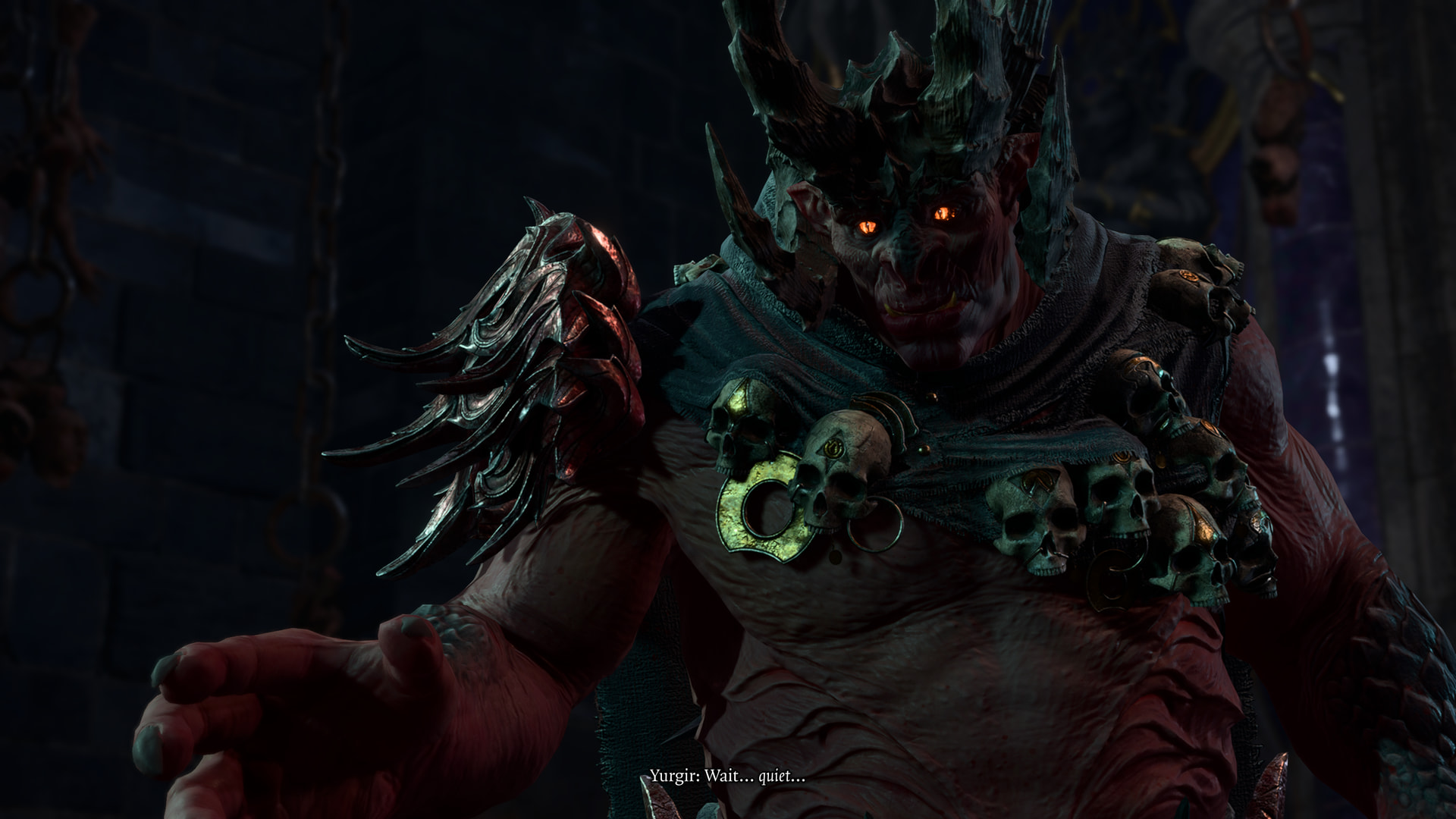 : “Ah. A friend - an uninvited friend. I did not request help.”Narrator: You find yourself in a dead, putrid skull - somehow hosting a tadpole amongst a squirm of maggots. Another presence lurks within, manipulating the corpse like a puppet.