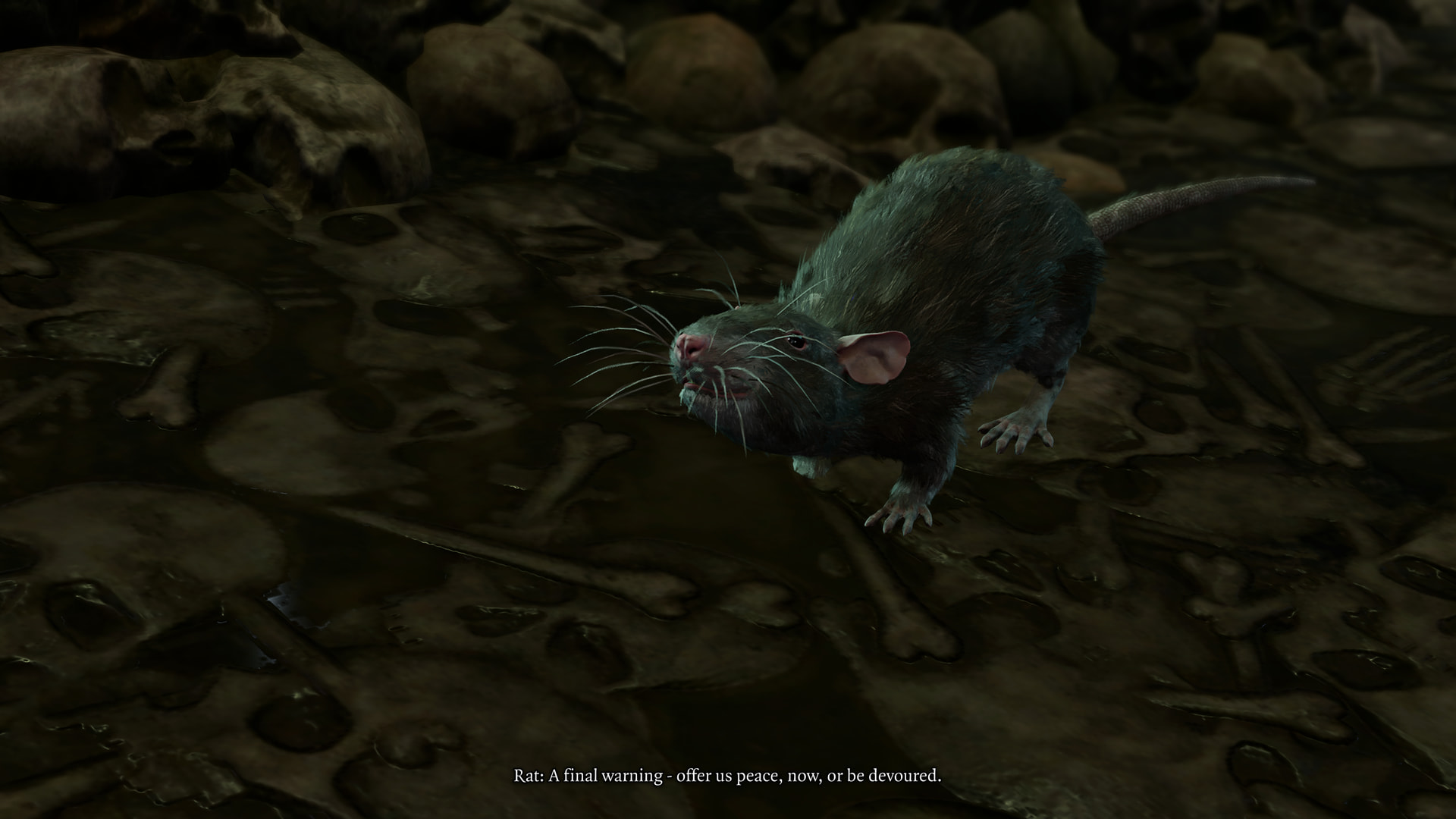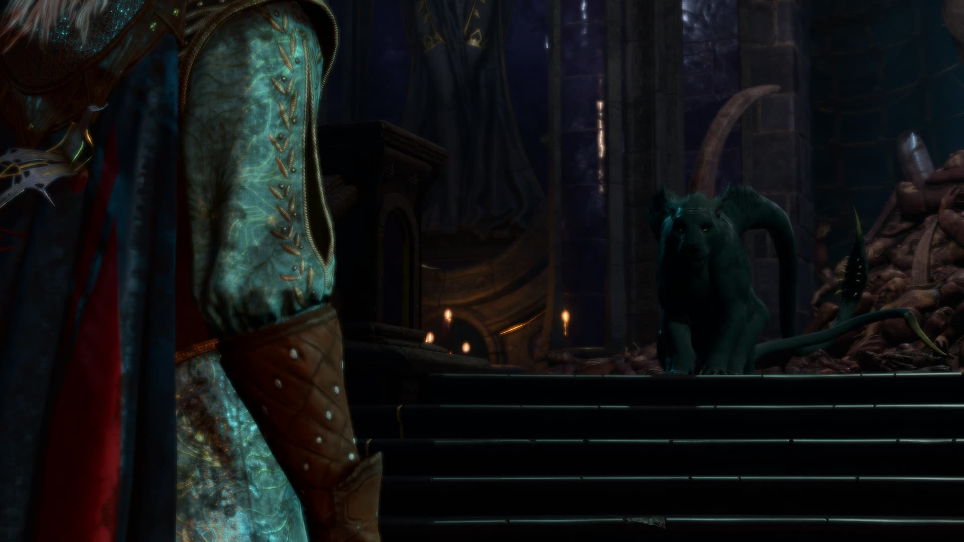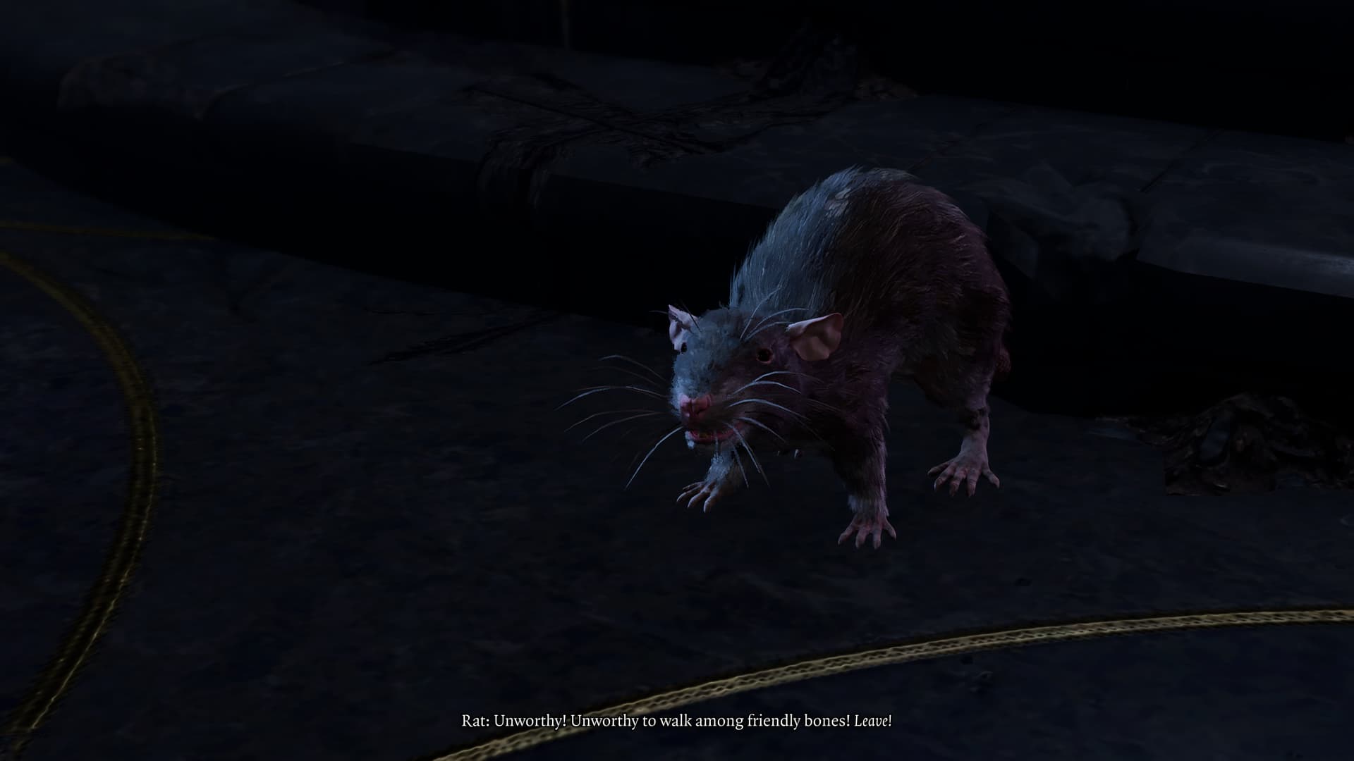 : Down the hall from the kitchen is this altar with a bunch of rats worshiping it. If you have Speak with Animals active, it gives us a major hint for a quest we haven’t done yet.