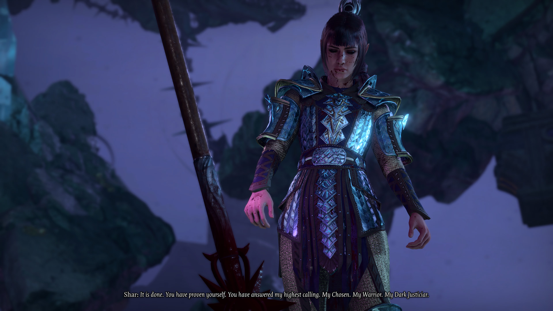 Shar: It is done. You have proven yourself. You have answered my highest calling. My Chosen. My Warrior. My Dark Justiciar.