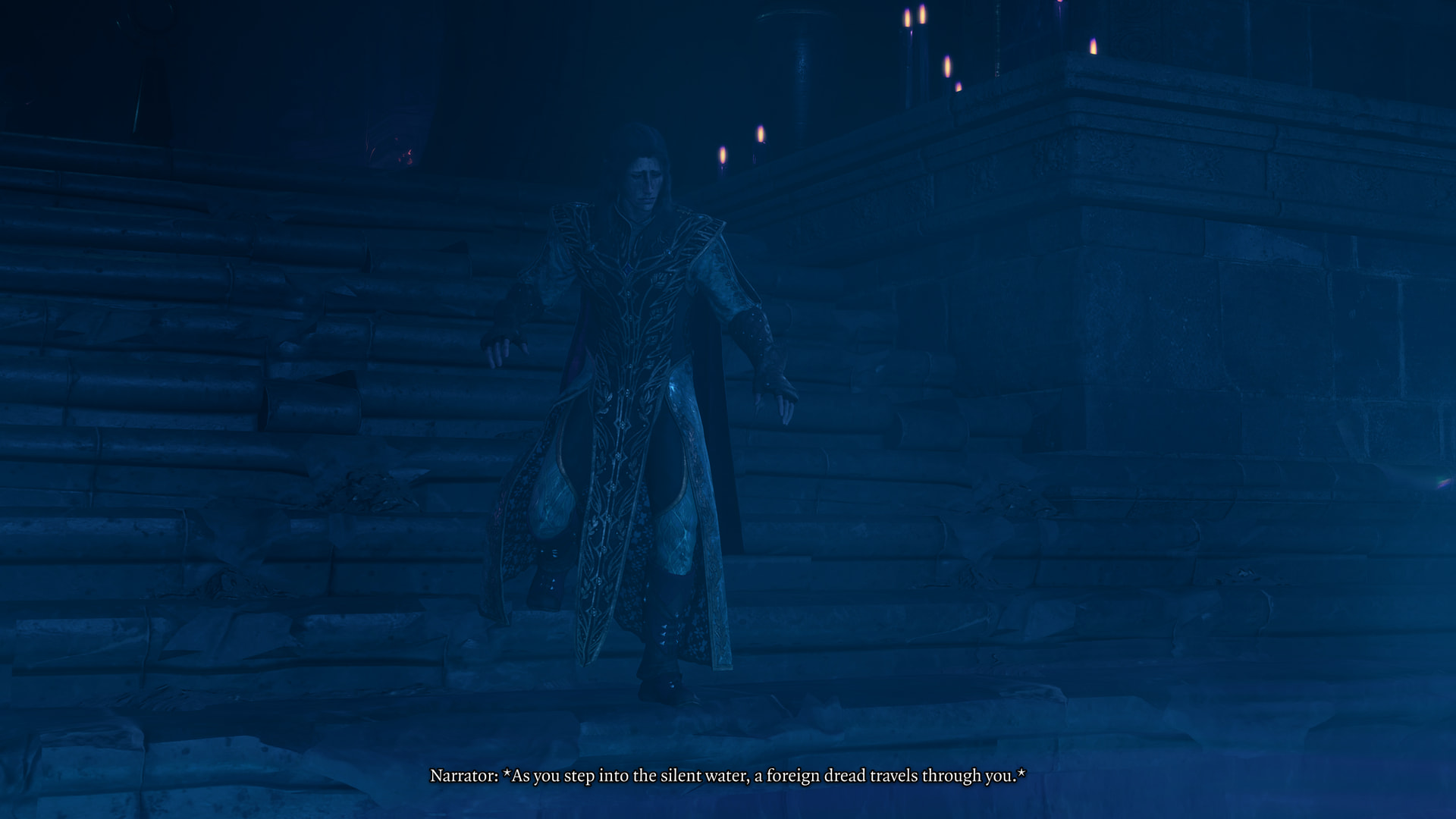 Narrator: As you step into the silent water, a foreign dread travels through you. It curls its way up your leg, squeezing tight.