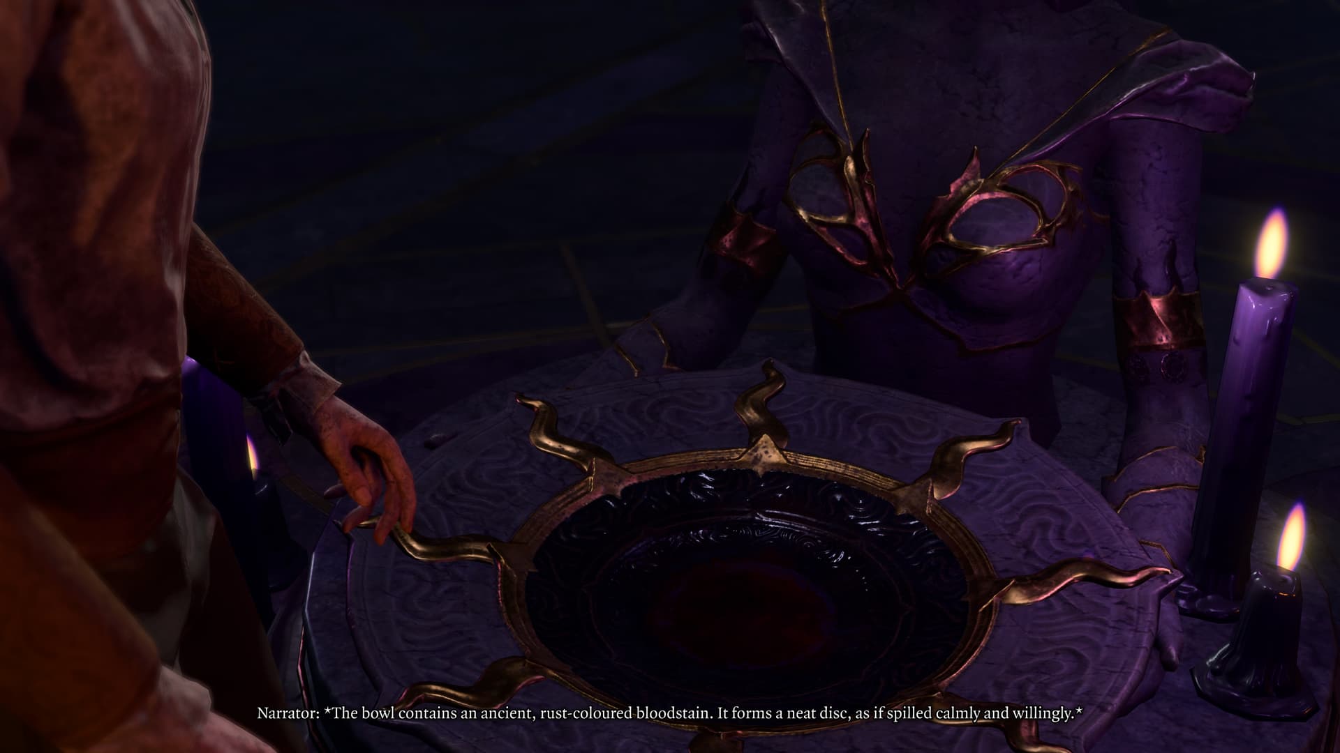 Narrator: The bowl contains an ancient, rust-colored bloodstain. It forms a neat disc, as if spilled calmly and willingly.