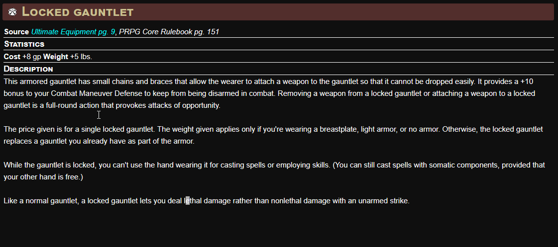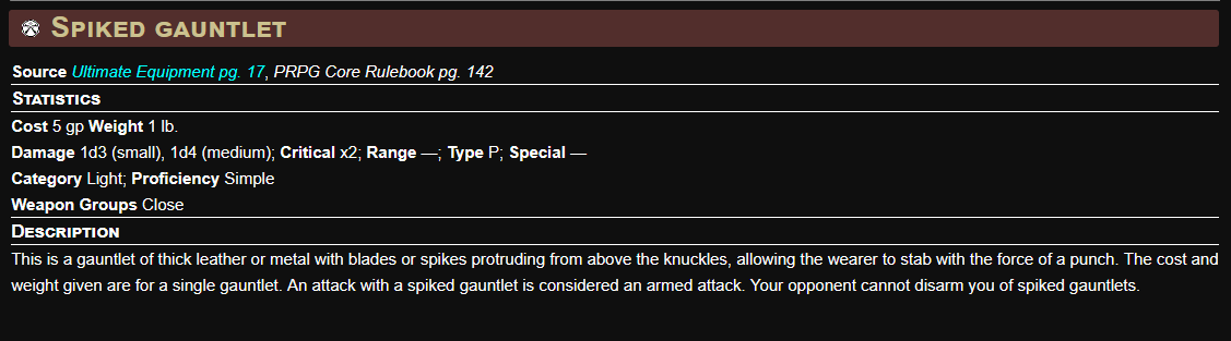 : In 3.5E, every single melee type will have a spiked gauntlet on the hand that doesn’t have their locked one. Why? Because it counts as being armed, so you can make AoOs even if it’s your only weapon.