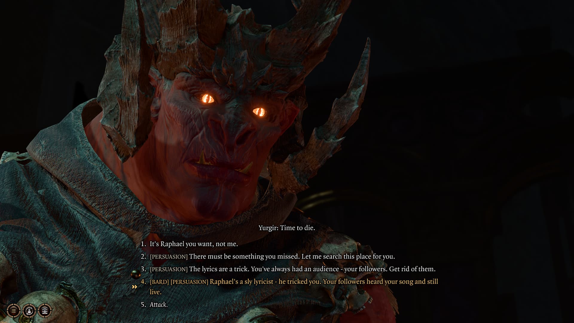 : I’m not going to bother transcribing the options because they’re all one in the same - you can find out Balthazar isn’t his real name if you’re a bard.