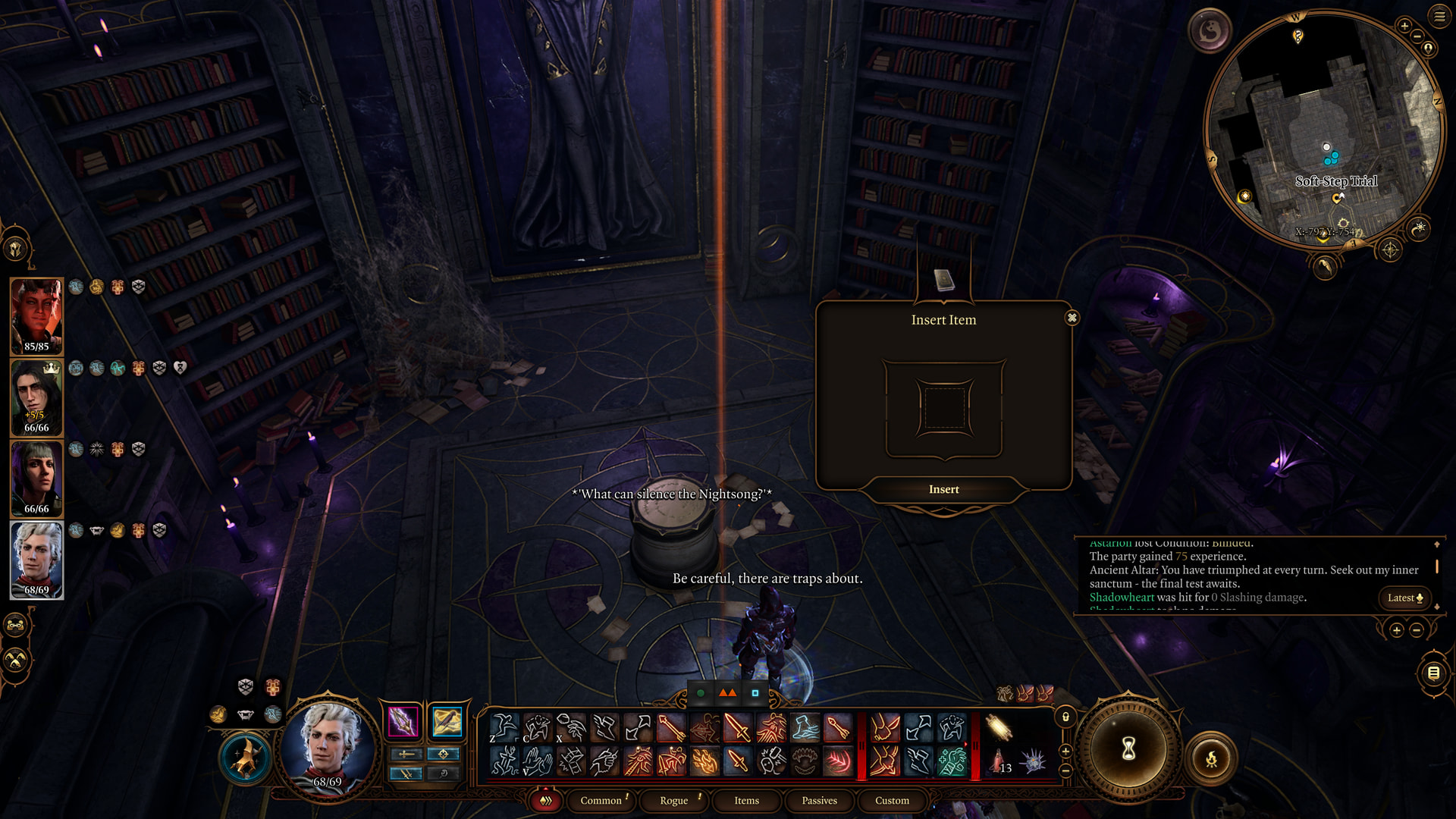 : Behind the big gate in the back (which is opened using one of four buttons, three of which are traps) is a pillar that asks us “What can silence the Nightsong?”
