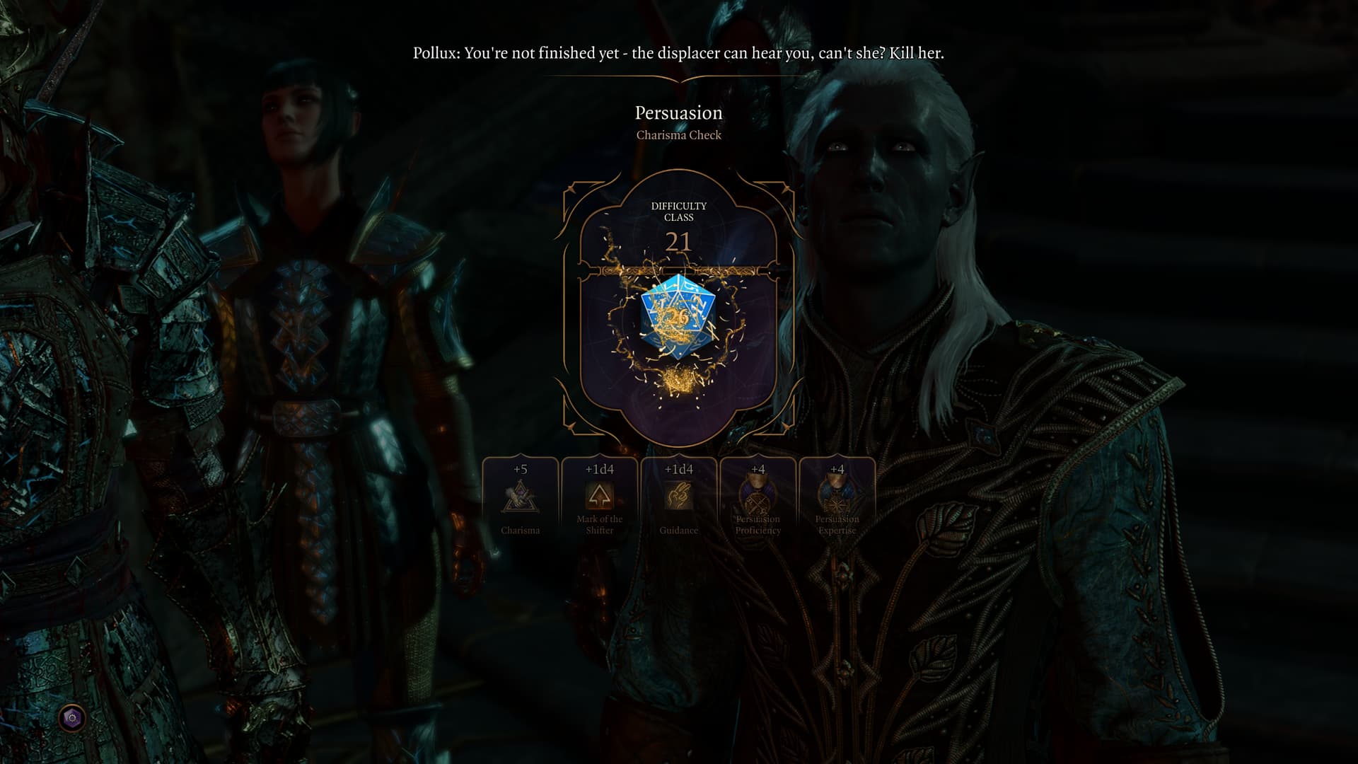 : This is from the first run where I killed Shadowheart. That run was.. something. Pollux kills Shadowheart, kills Aylin once for the experience, and then lets her go.