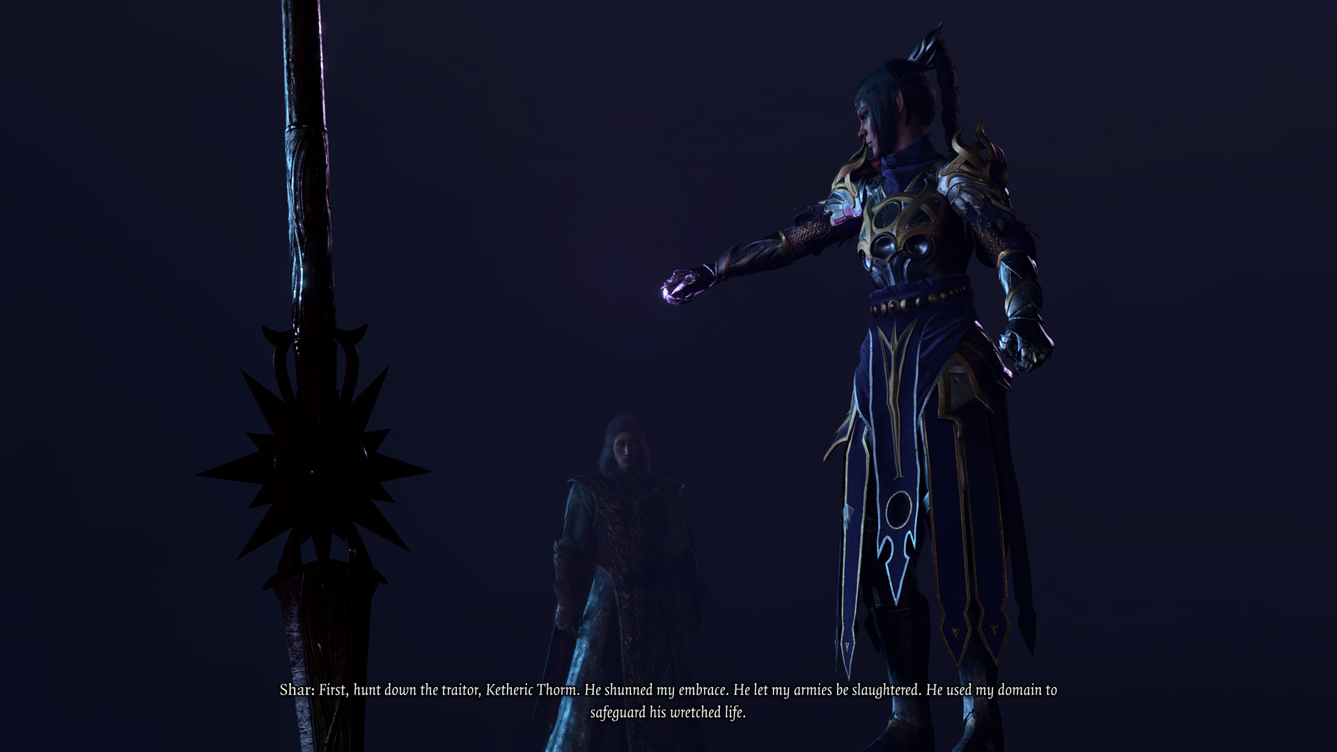 Shar: First, hunt down the traitor, Ketheric Thorm. He shunned my embrace. He left my armies be slaughtered. He used my domain to safeguard his wretched life.