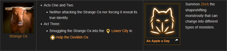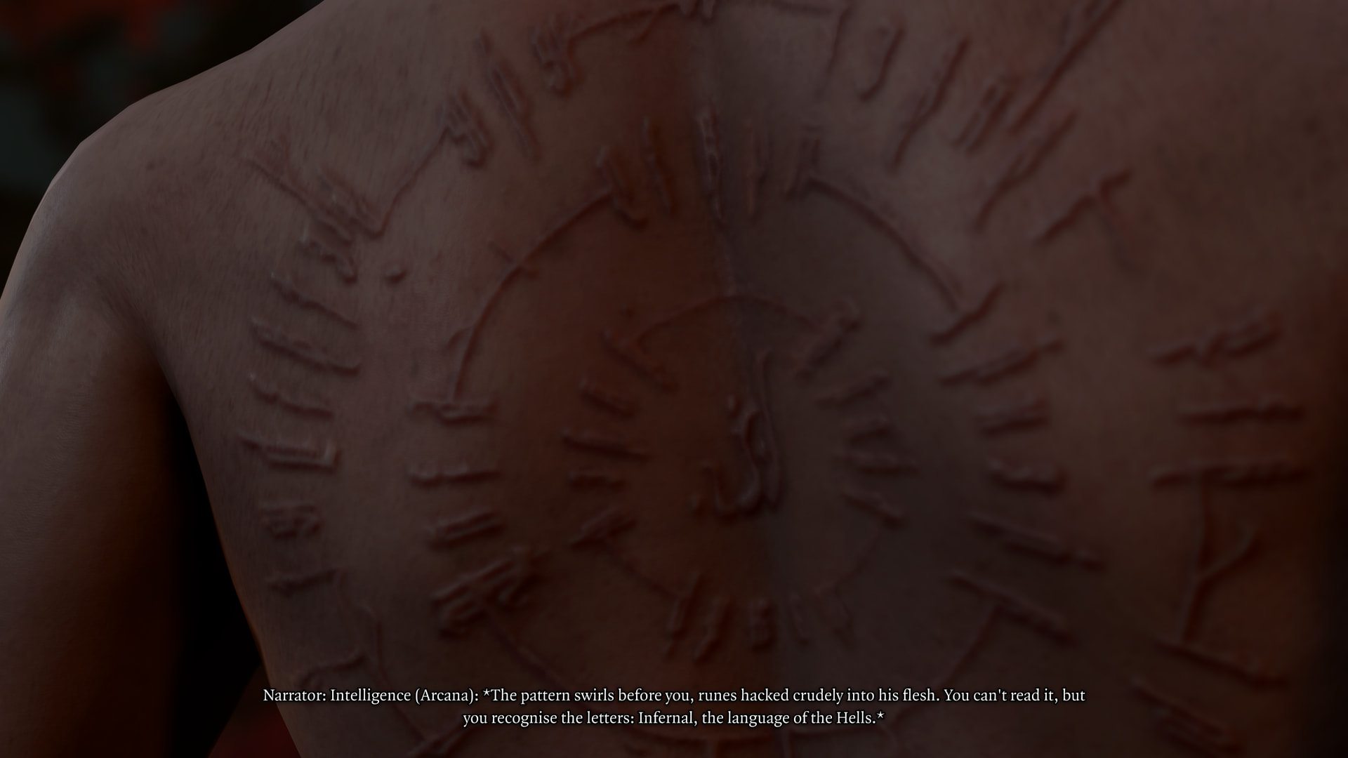: I didn’t get this when I played, and even without knowing why it’s there it’s obvious who’s behind it. : Hell doesn’t even have its own language. What are these people on? : “And? What does it say?”Narrator: “The pattern swirls before you, runes hacked crudely into his flesh. You can’t read it, but you recognize the letters: Infernal, the language of the hells.”