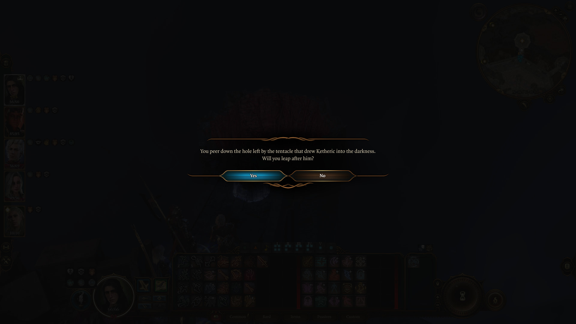 : There are two things we need in the hole which require specific people. Gale has his bad ending down there, and Wyll has a quest that drops a weapon for Pollux.. except we can’t switch party members out once we’re down there.
